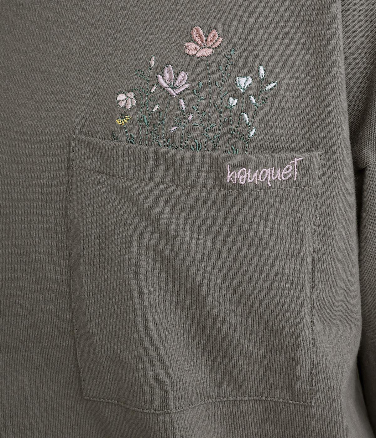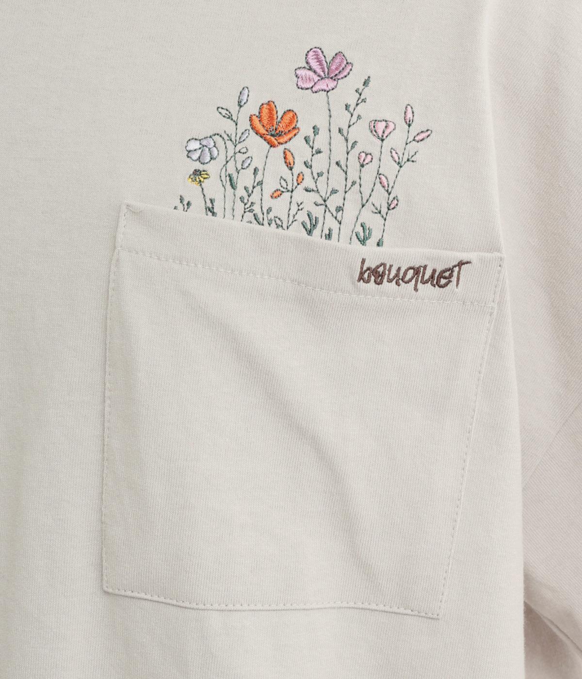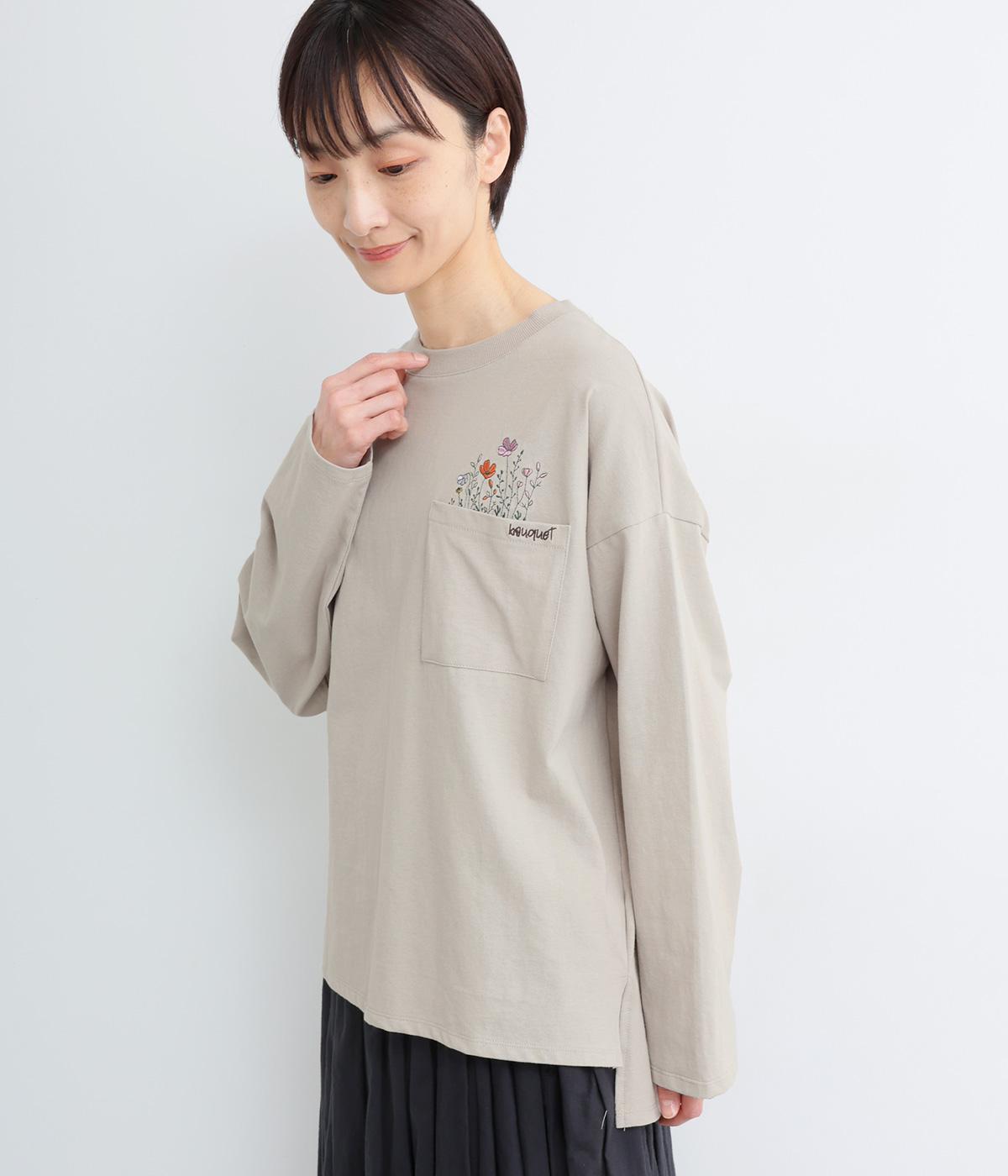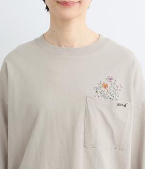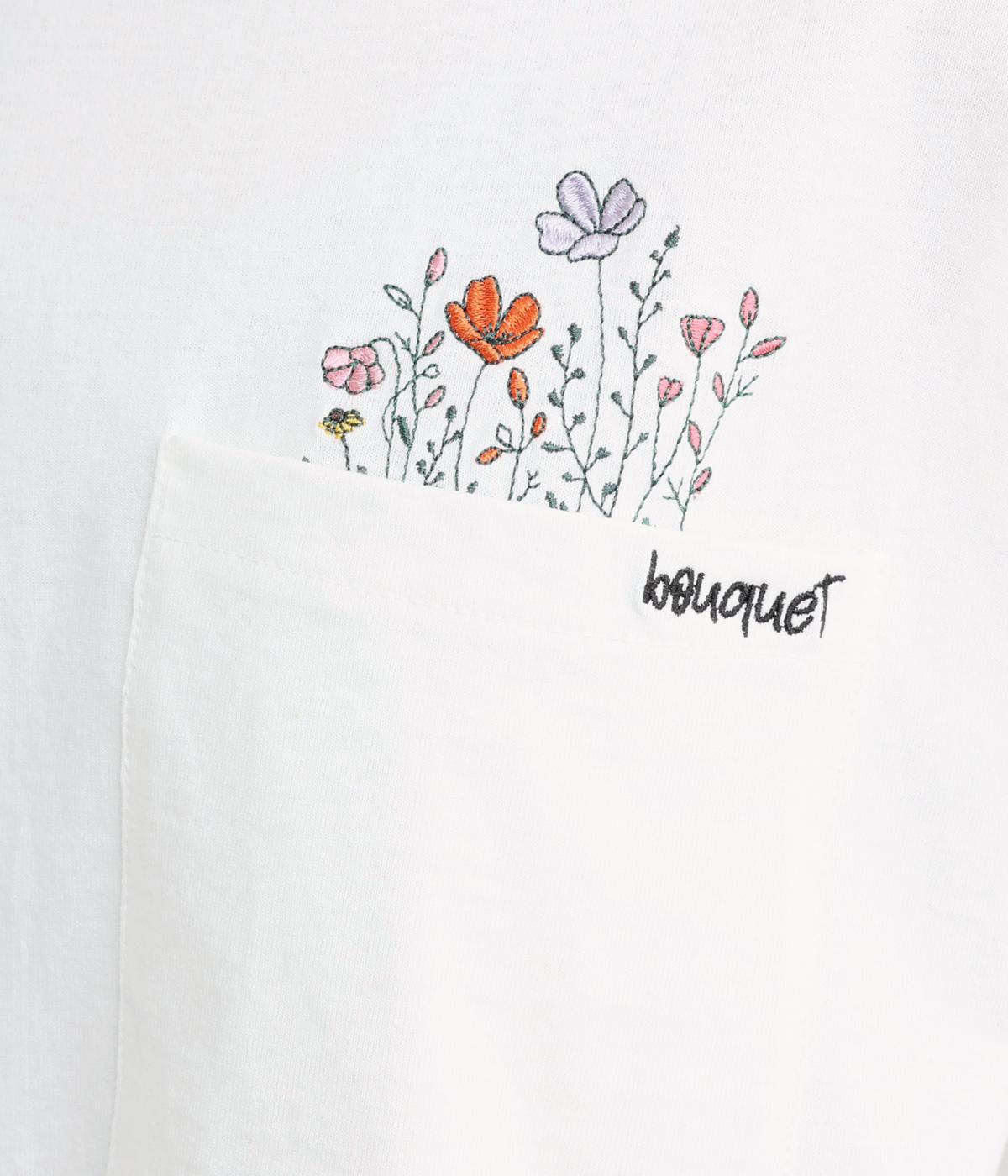 リラックス感のあるゆったりシルエットのTシャツに、ポケットにお花を挿したような刺しゅうをあしらいました。前後差をつけた裾が気になるヒップまわりをカバーします。カジュアルにもフェミニンにも着まわしできる一枚です。