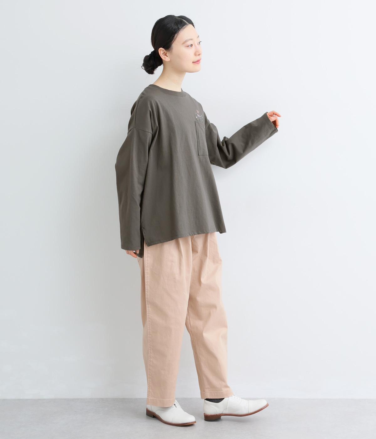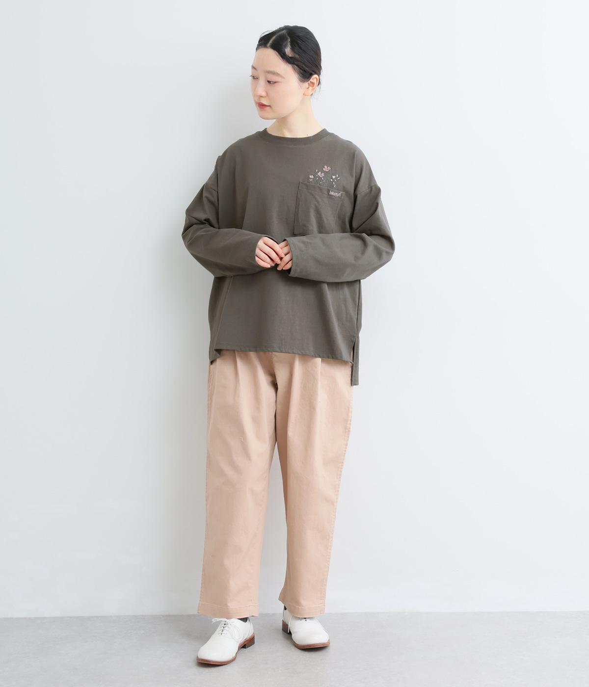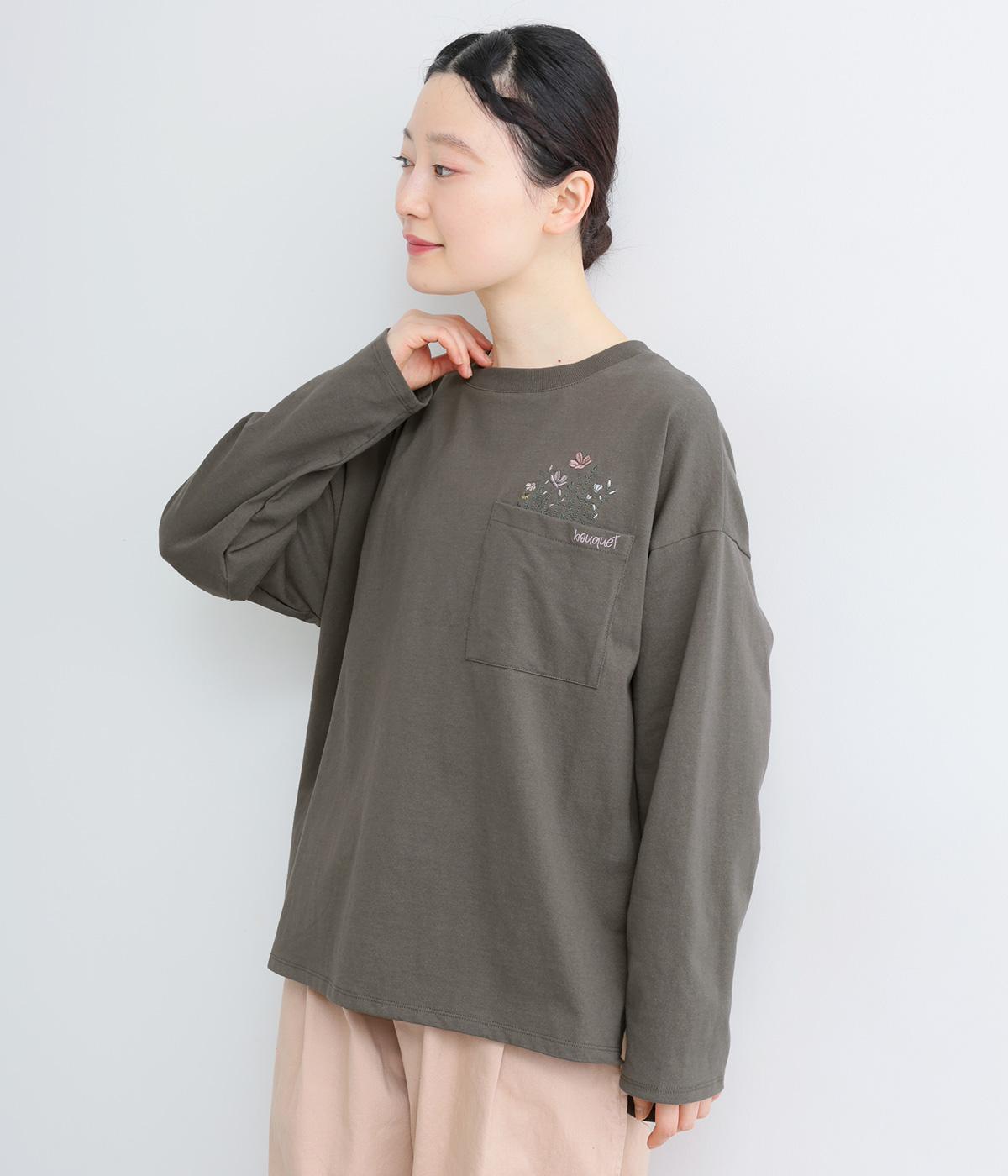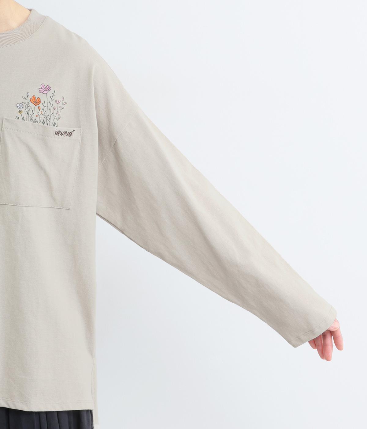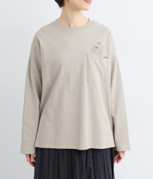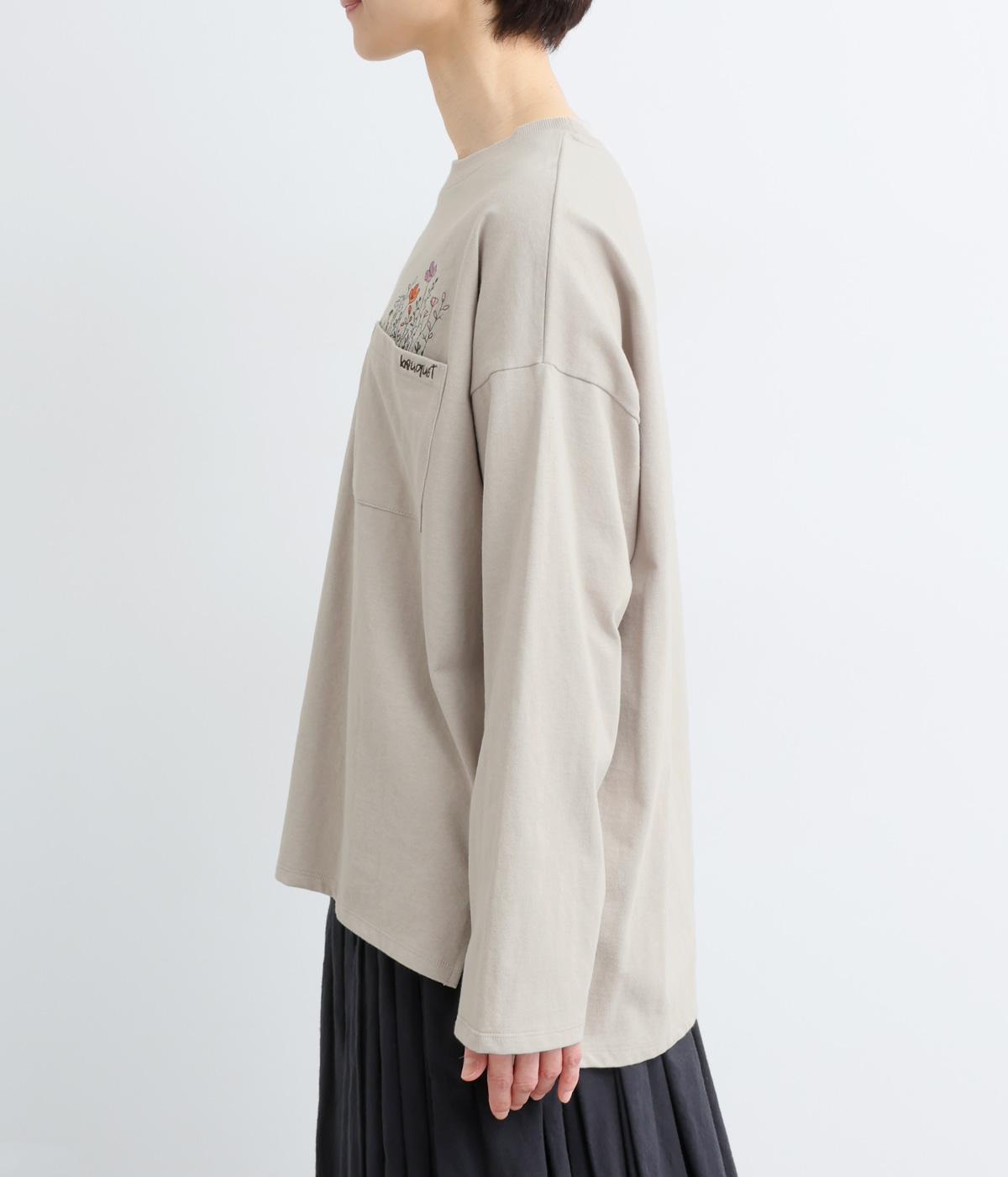 リラックス感のあるゆったりシルエットのTシャツに、ポケットにお花を挿したような刺しゅうをあしらいました。前後差をつけた裾が気になるヒップまわりをカバーします。カジュアルにもフェミニンにも着まわしできる一枚です。