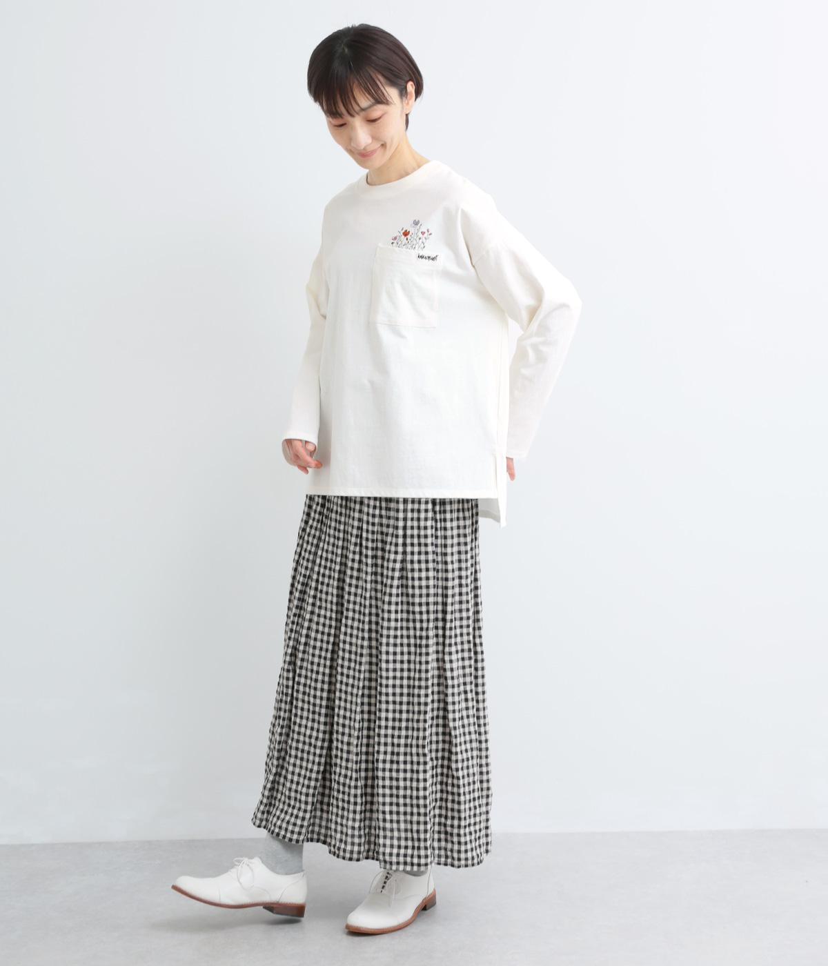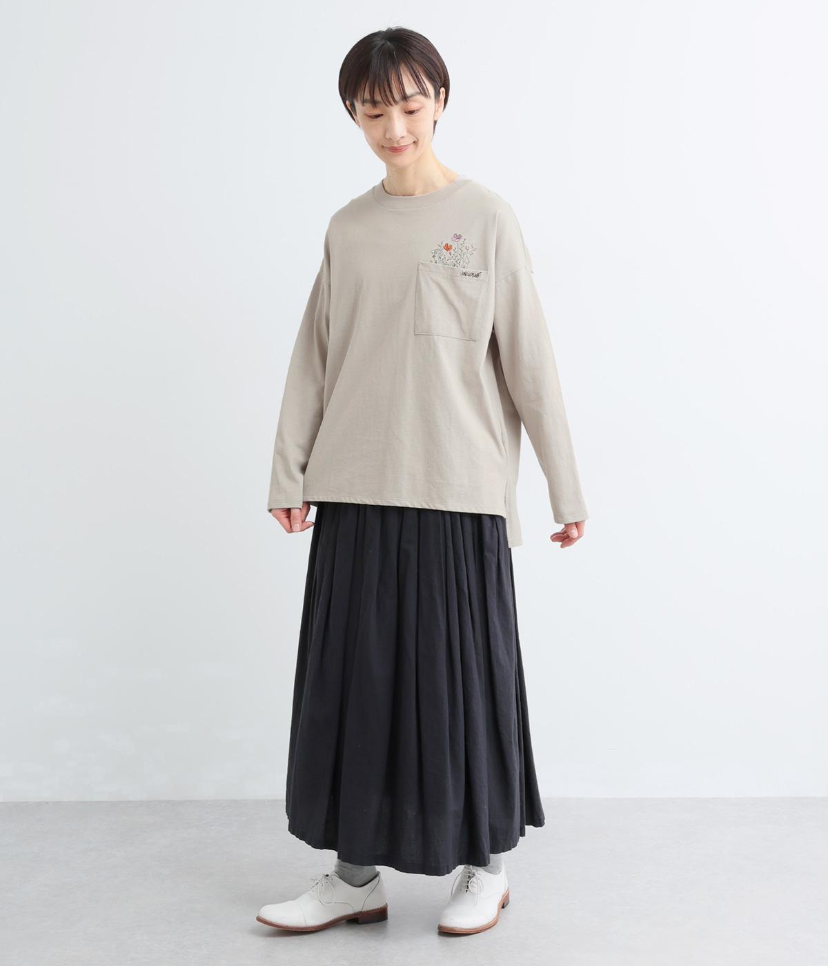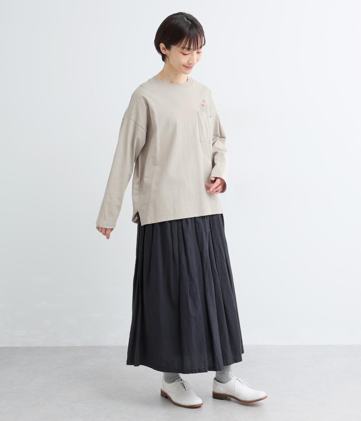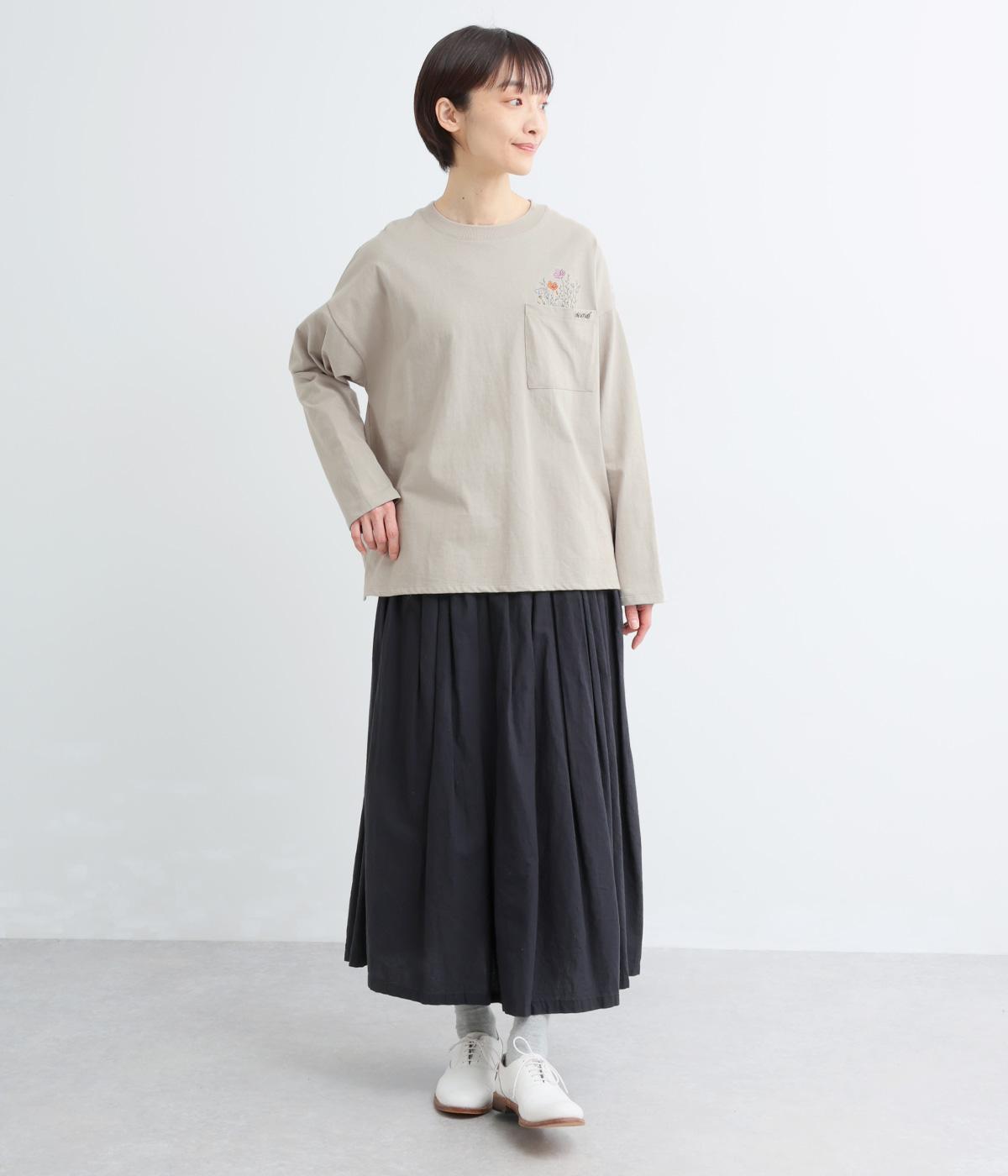 リラックス感のあるゆったりシルエットのTシャツに、ポケットにお花を挿したような刺しゅうをあしらいました。前後差をつけた裾が気になるヒップまわりをカバーします。カジュアルにもフェミニンにも着まわしできる一枚です。