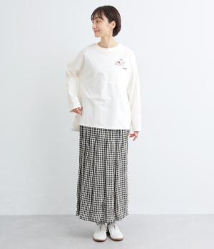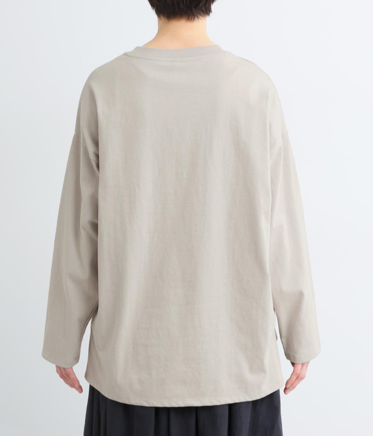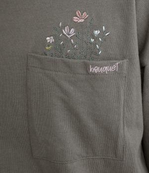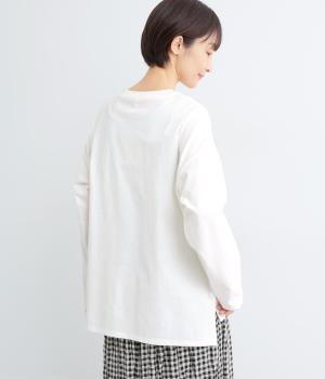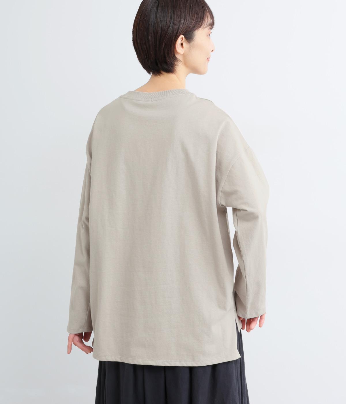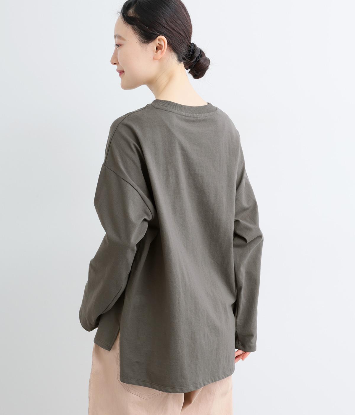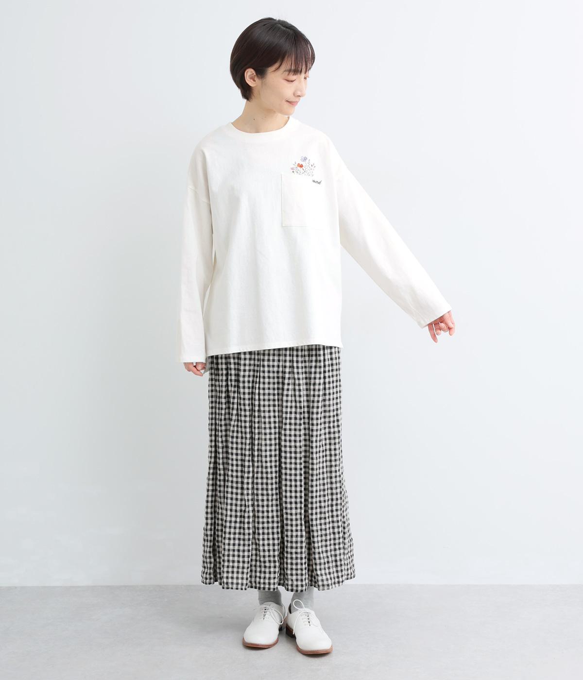 リラックス感のあるゆったりシルエットのTシャツに、ポケットにお花を挿したような刺しゅうをあしらいました。前後差をつけた裾が気になるヒップまわりをカバーします。カジュアルにもフェミニンにも着まわしできる一枚です。