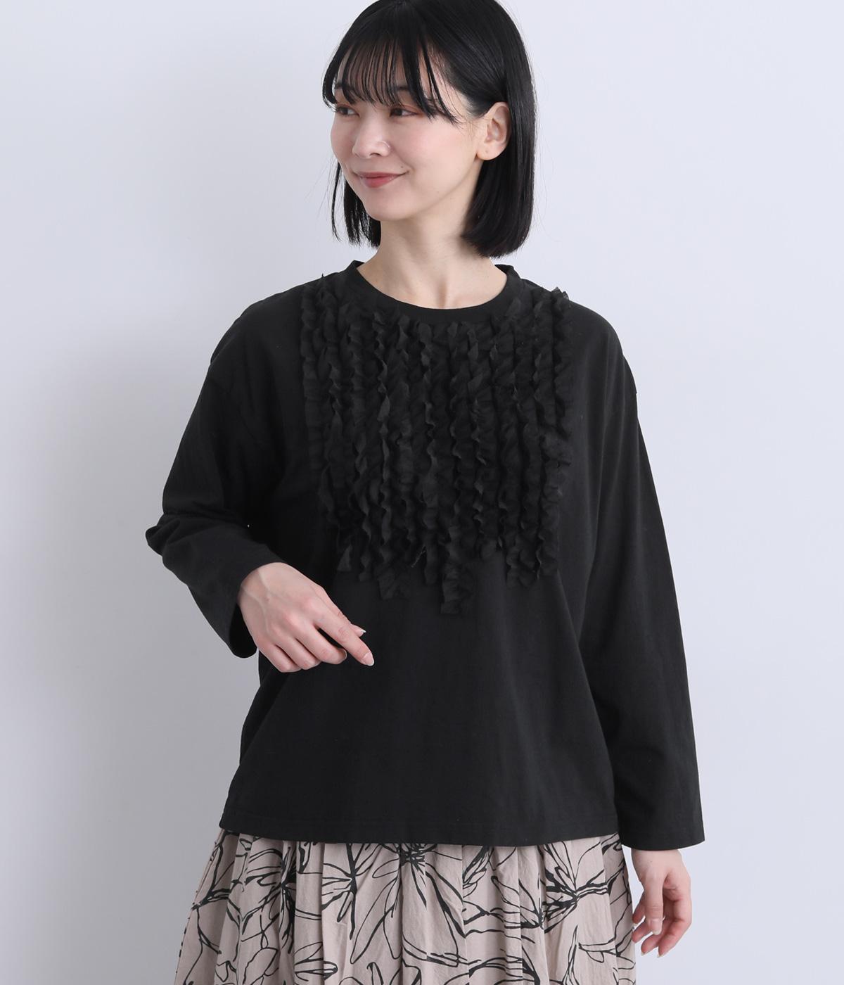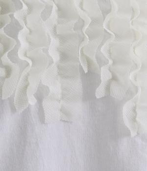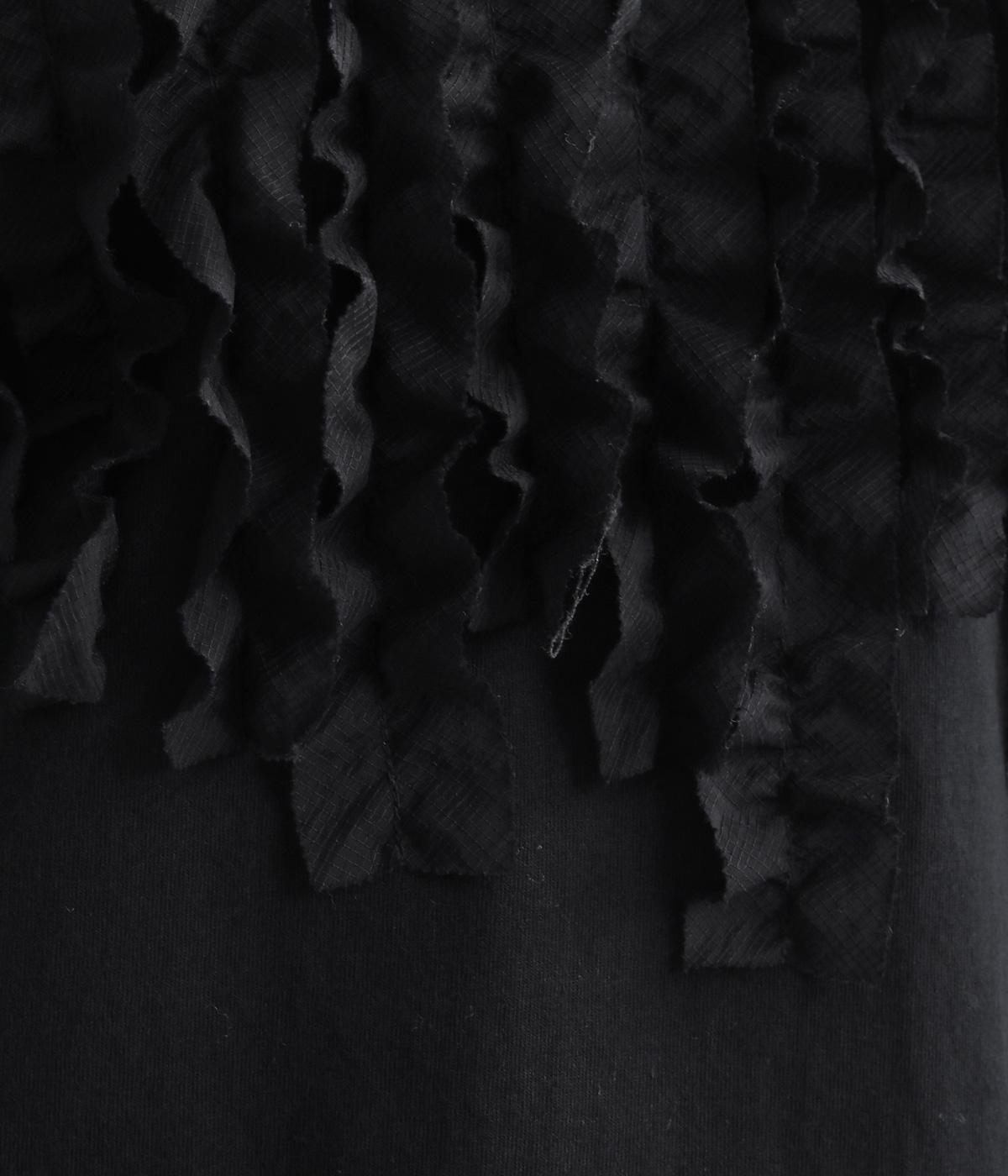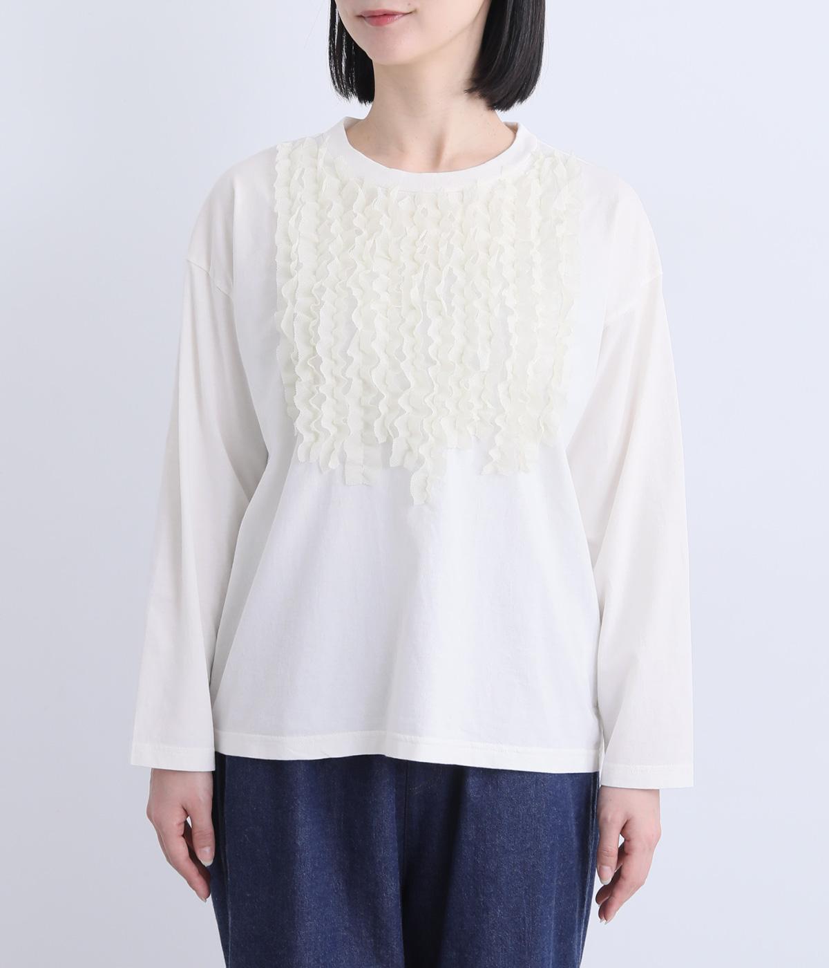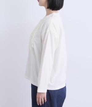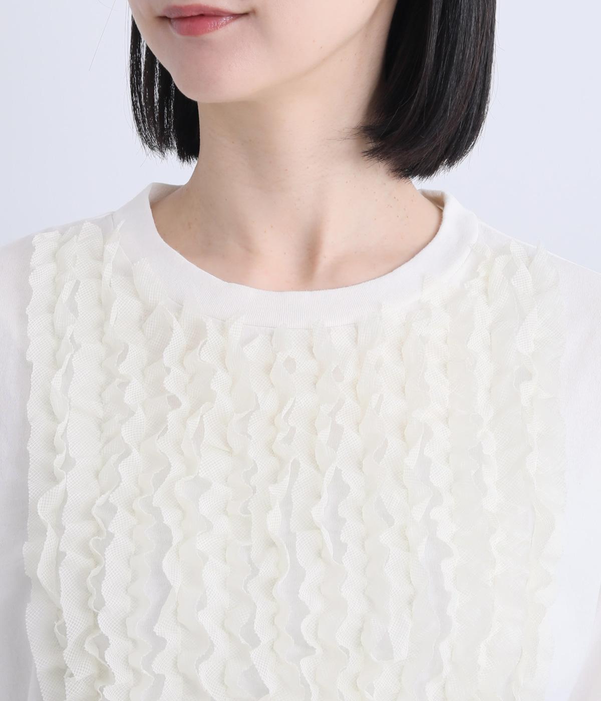 身頃に大胆にほどこしたカットフリルが大人のデイリースタイルに華を添える一枚。フリルはナイロン生地をセレクトすることで立体感とコントラストがついてよりキャッチーに。スタンダードなシルエットで着こなしやすくまとめています。