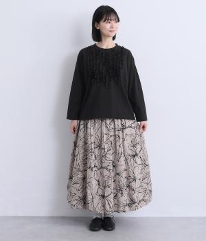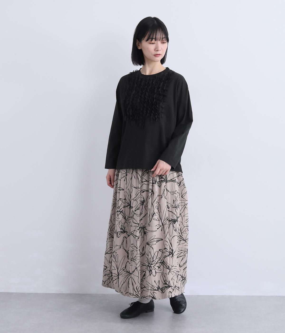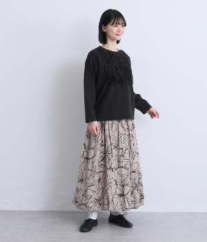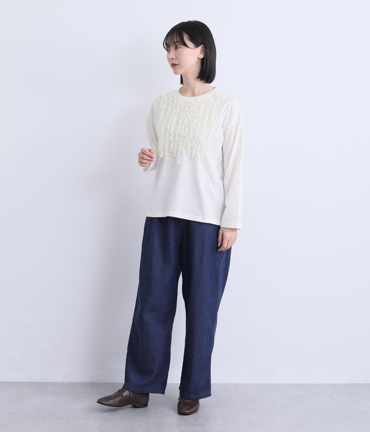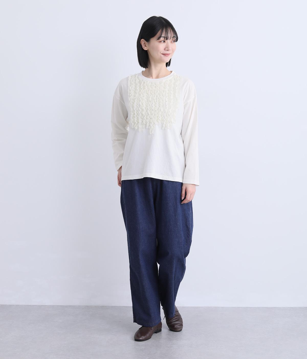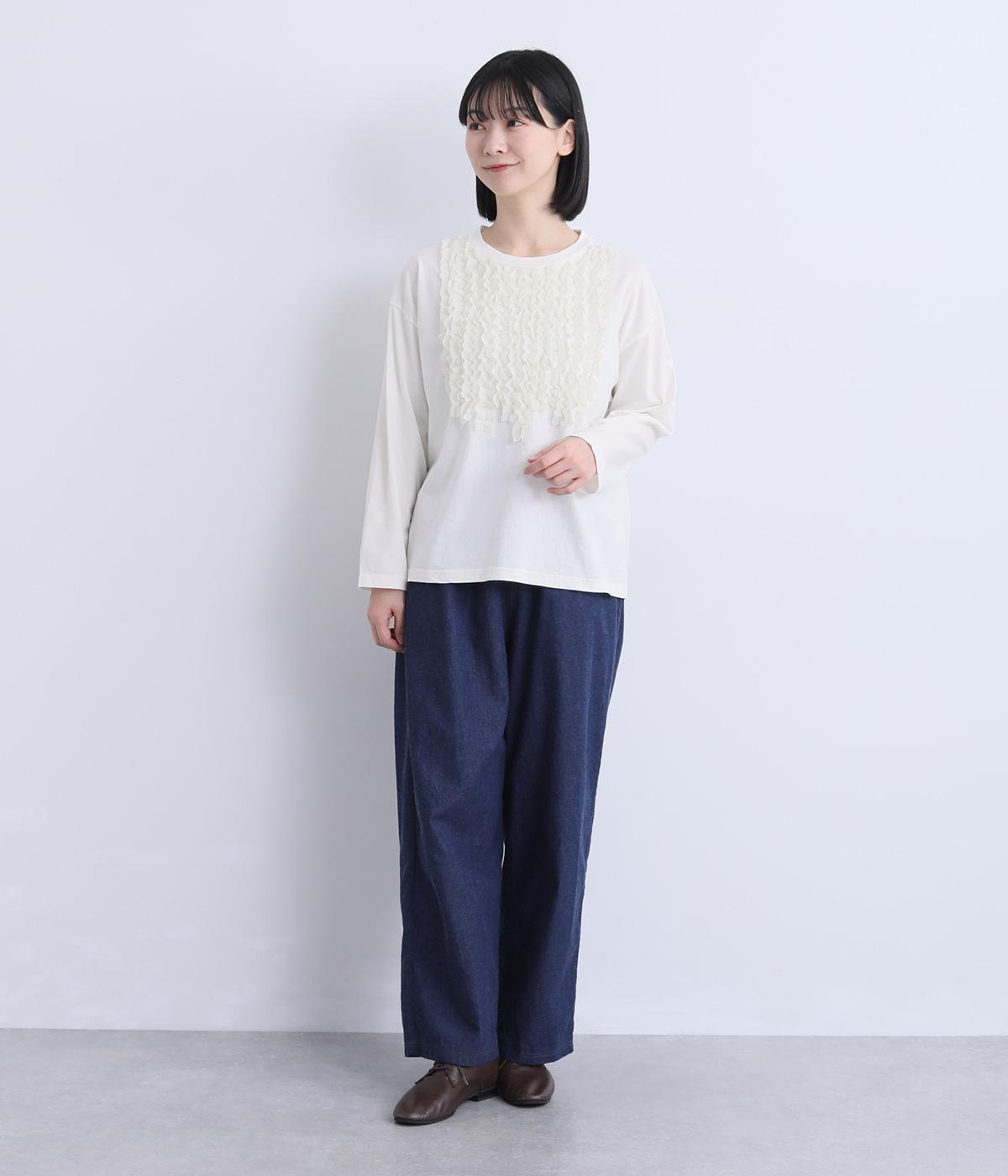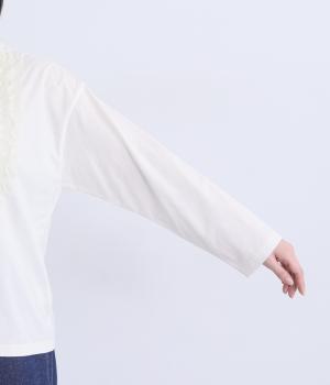身頃に大胆にほどこしたカットフリルが大人のデイリースタイルに華を添える一枚。フリルはナイロン生地をセレクトすることで立体感とコントラストがついてよりキャッチーに。スタンダードなシルエットで着こなしやすくまとめています。