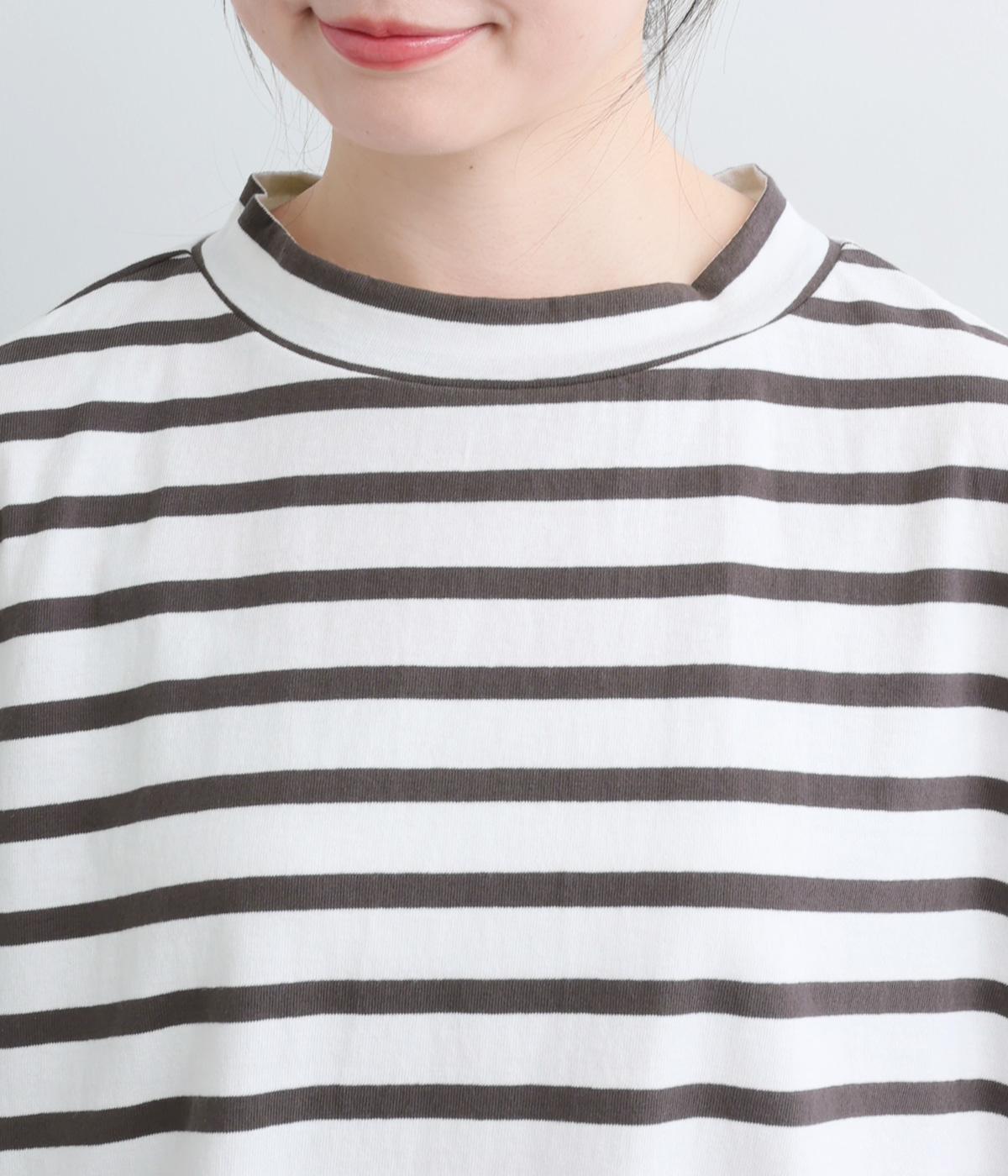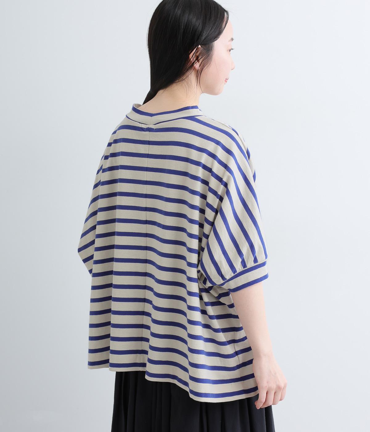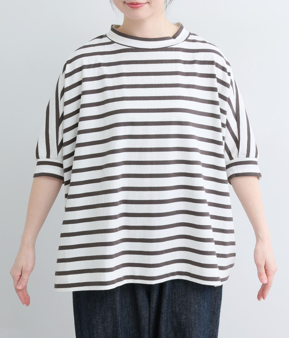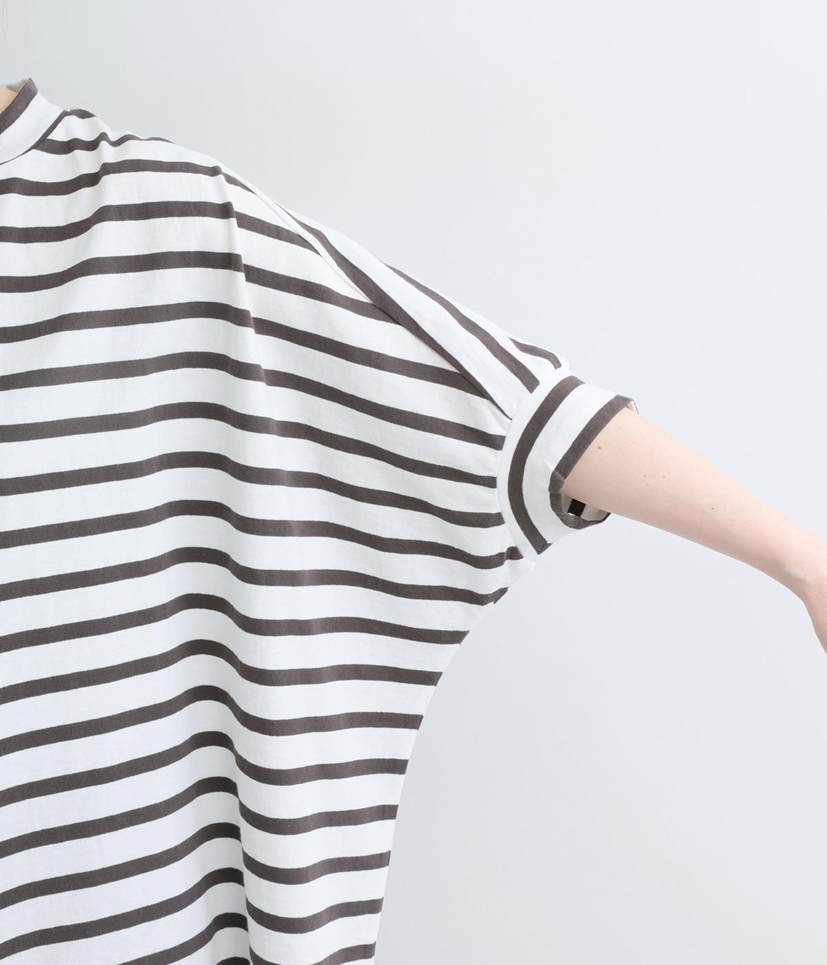 ゆったりとしたドルマンスリーブのワイドシルエットを、モックネックと袖口のカフスですっきりと引き締めました。カジュアルなボーダー柄に大人っぽい表情を添え、一枚でサマになる、計算されたバランスが魅力です。