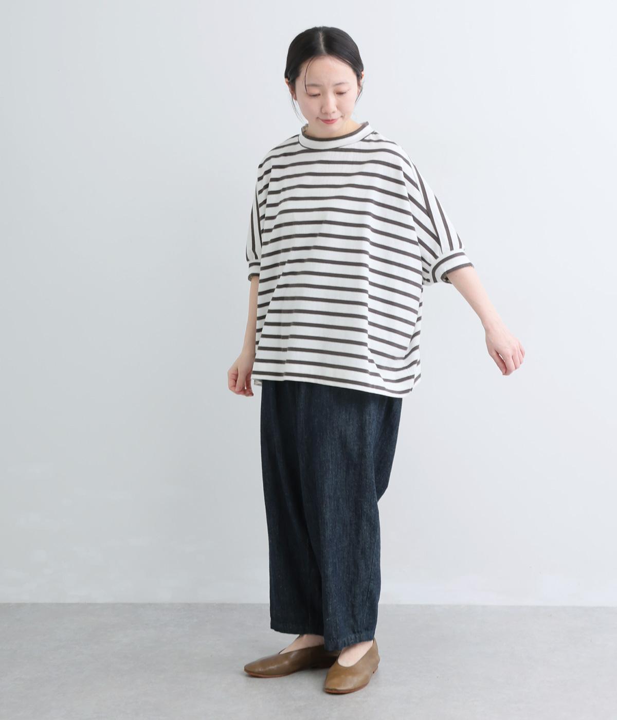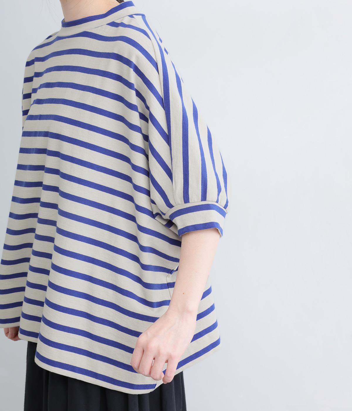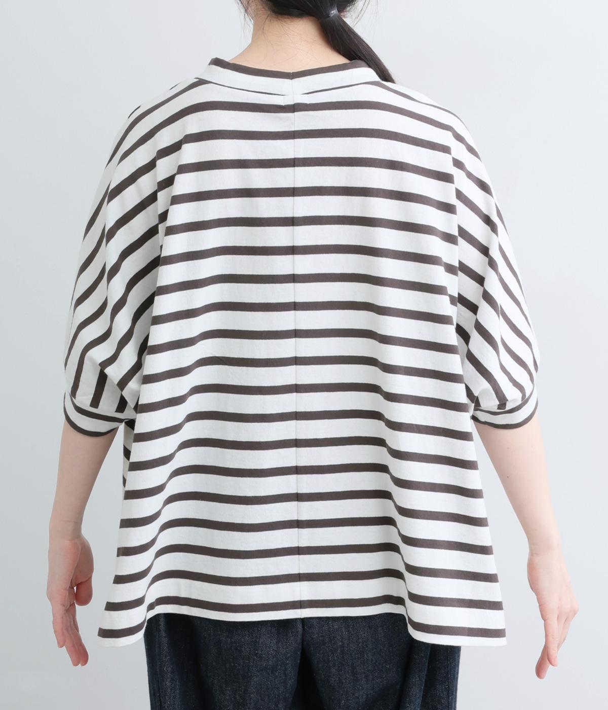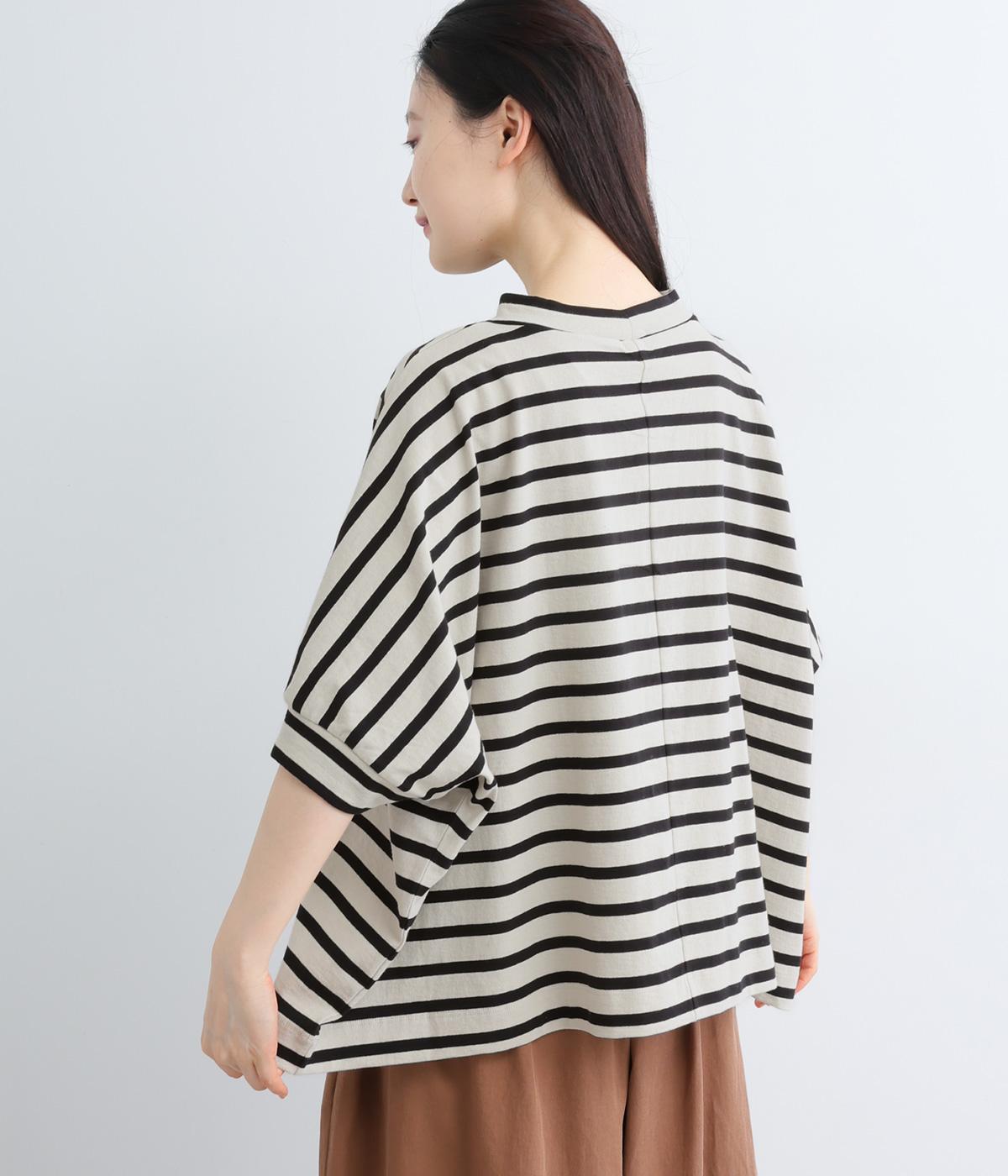 ゆったりとしたドルマンスリーブのワイドシルエットを、モックネックと袖口のカフスですっきりと引き締めました。カジュアルなボーダー柄に大人っぽい表情を添え、一枚でサマになる、計算されたバランスが魅力です。