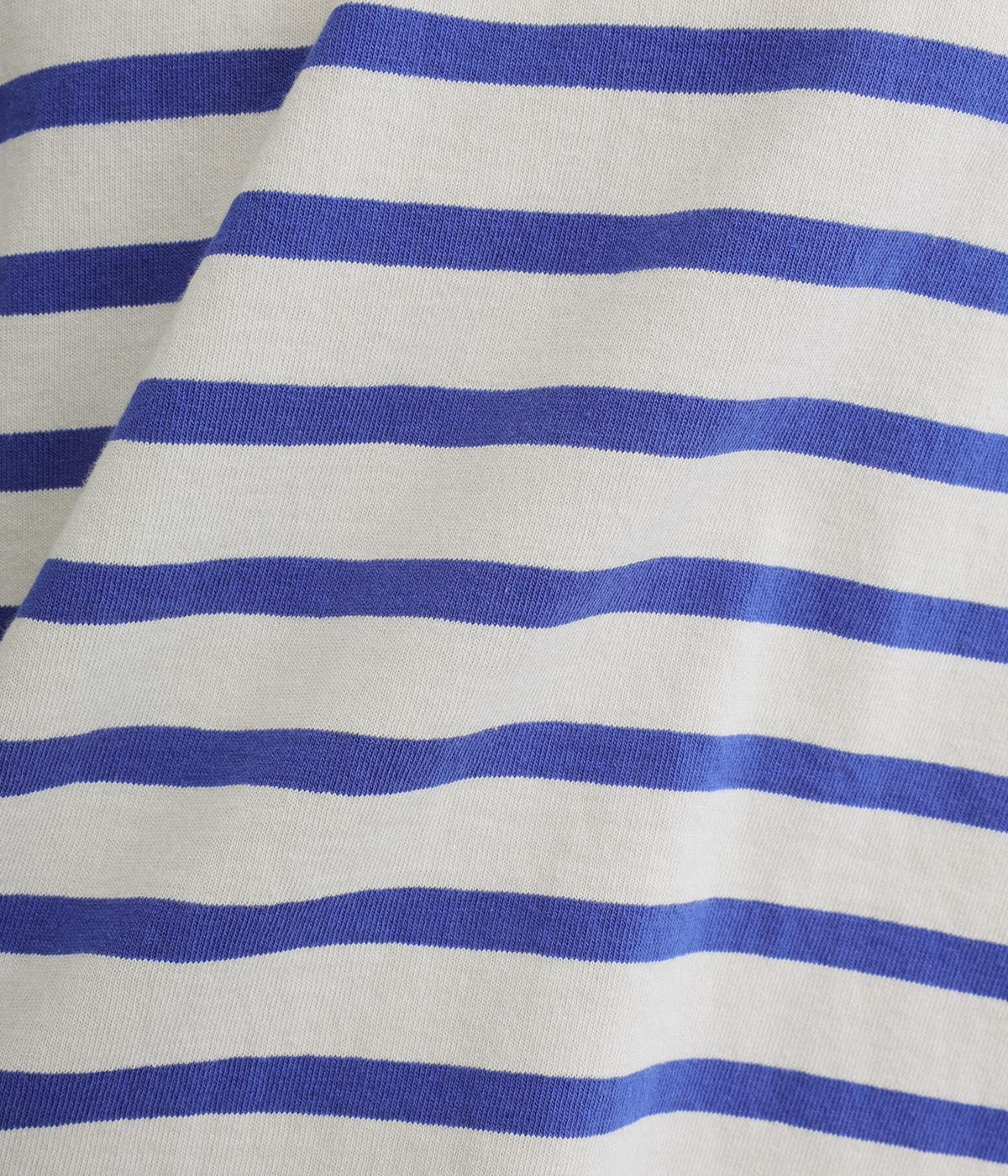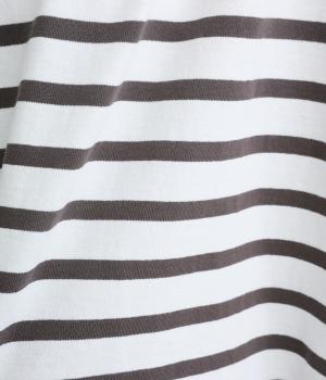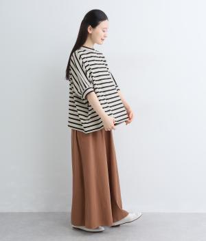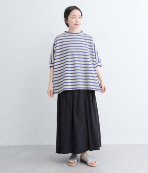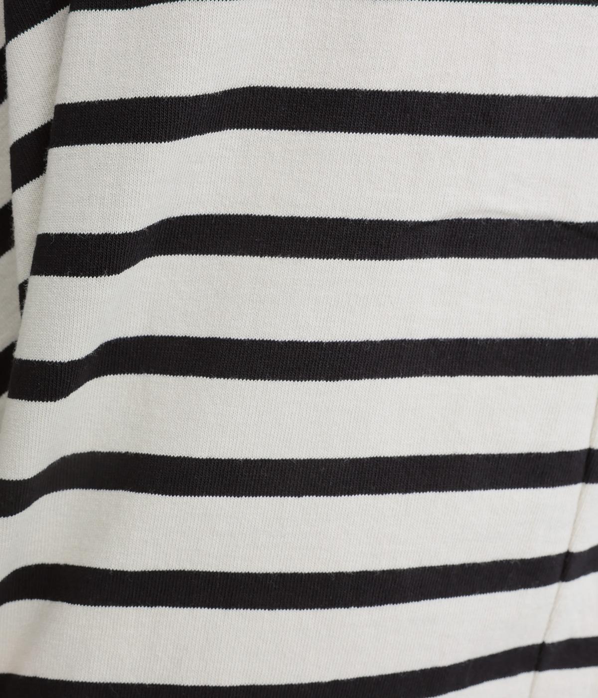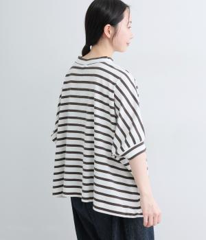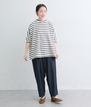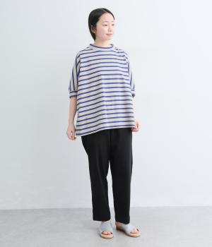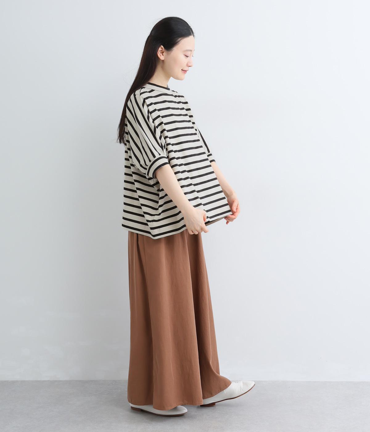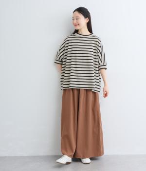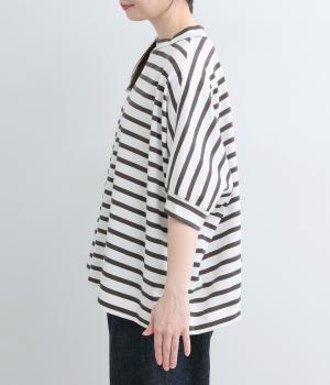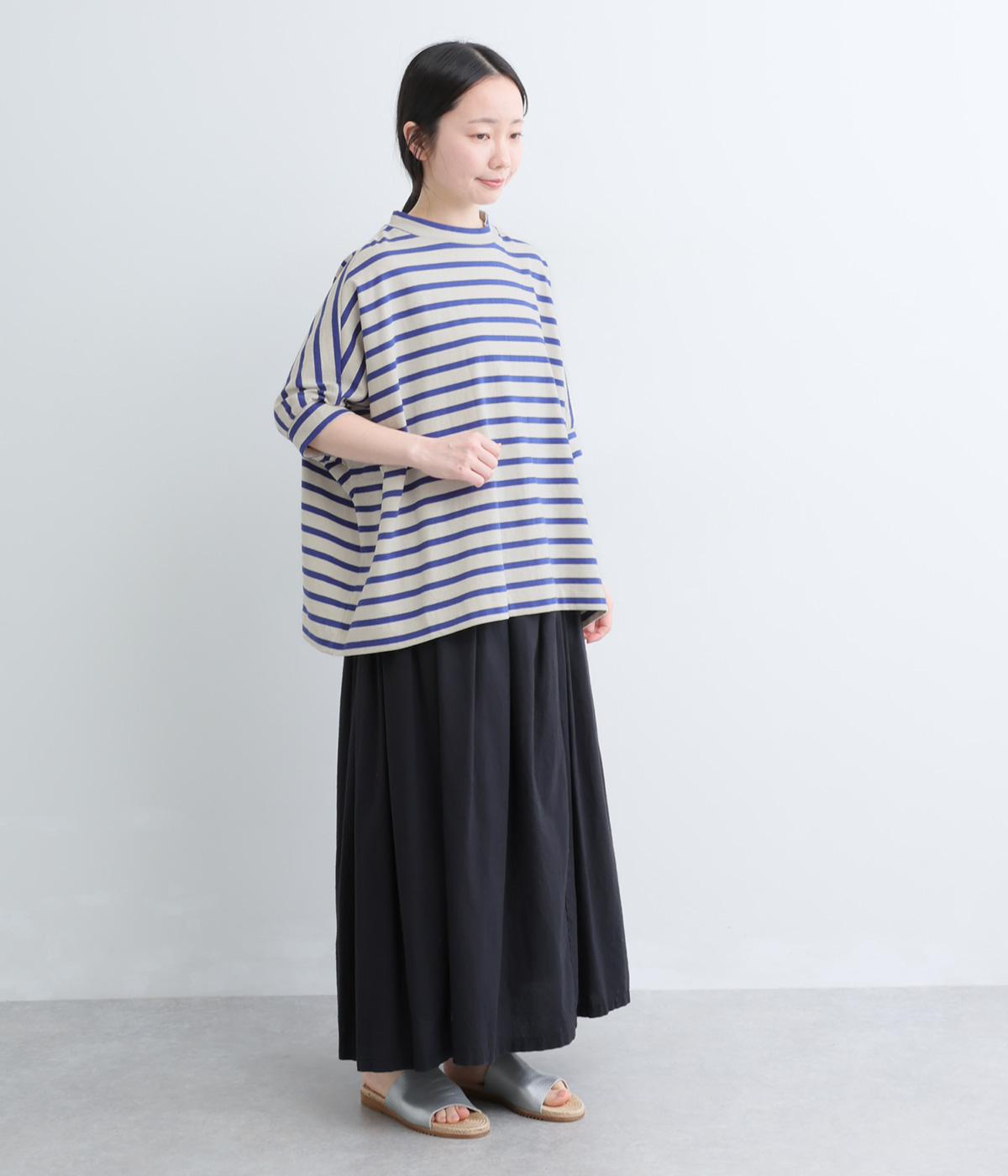 ゆったりとしたドルマンスリーブのワイドシルエットを、モックネックと袖口のカフスですっきりと引き締めました。カジュアルなボーダー柄に大人っぽい表情を添え、一枚でサマになる、計算されたバランスが魅力です。