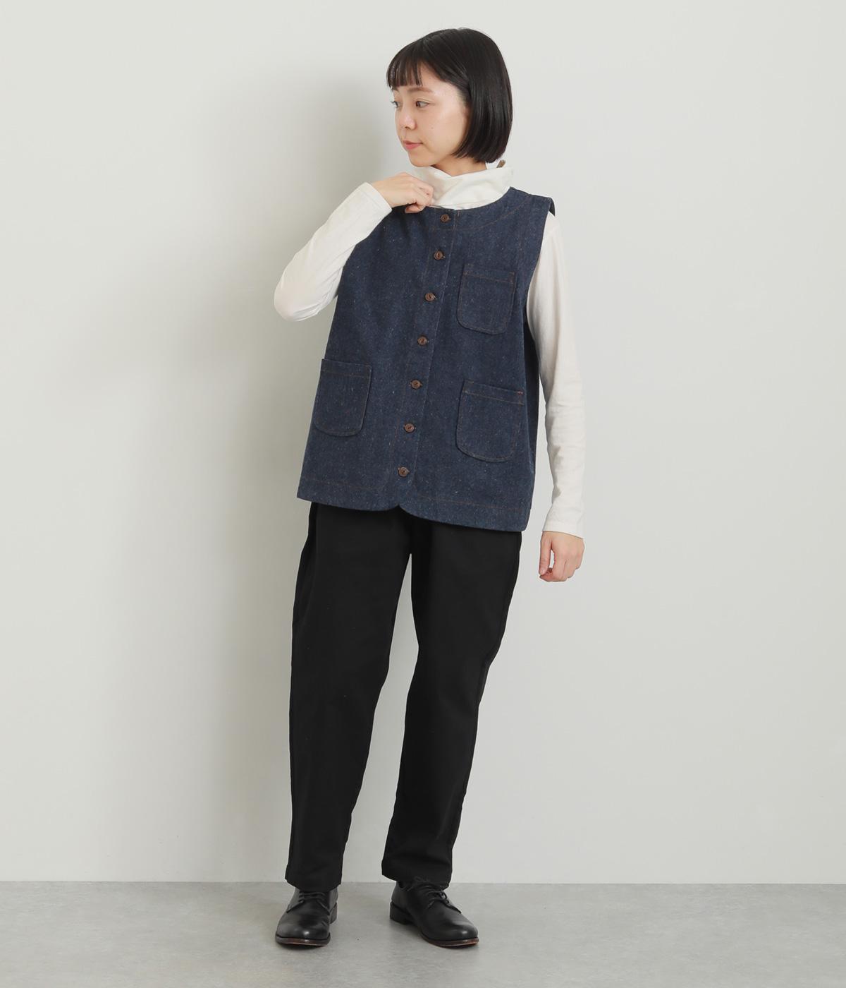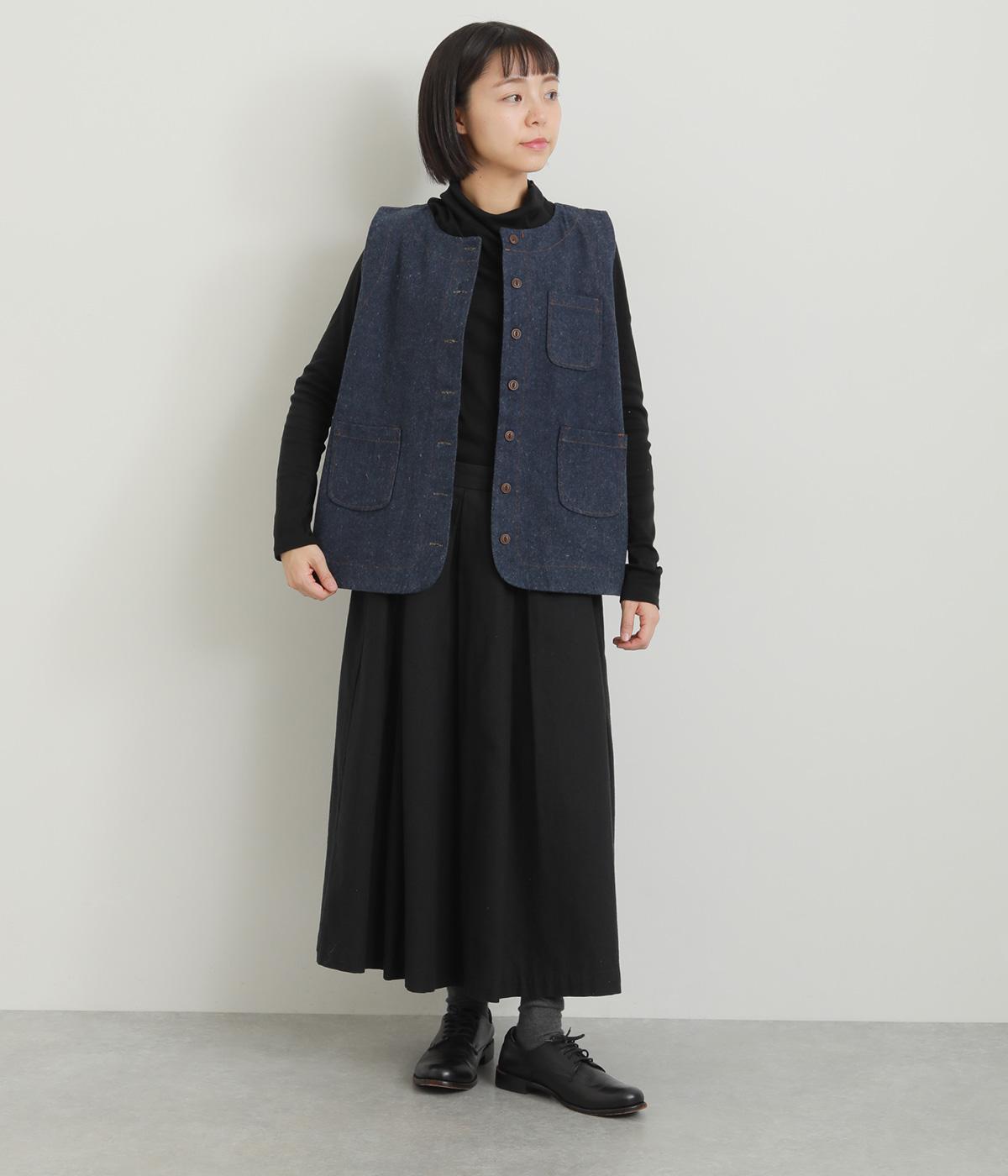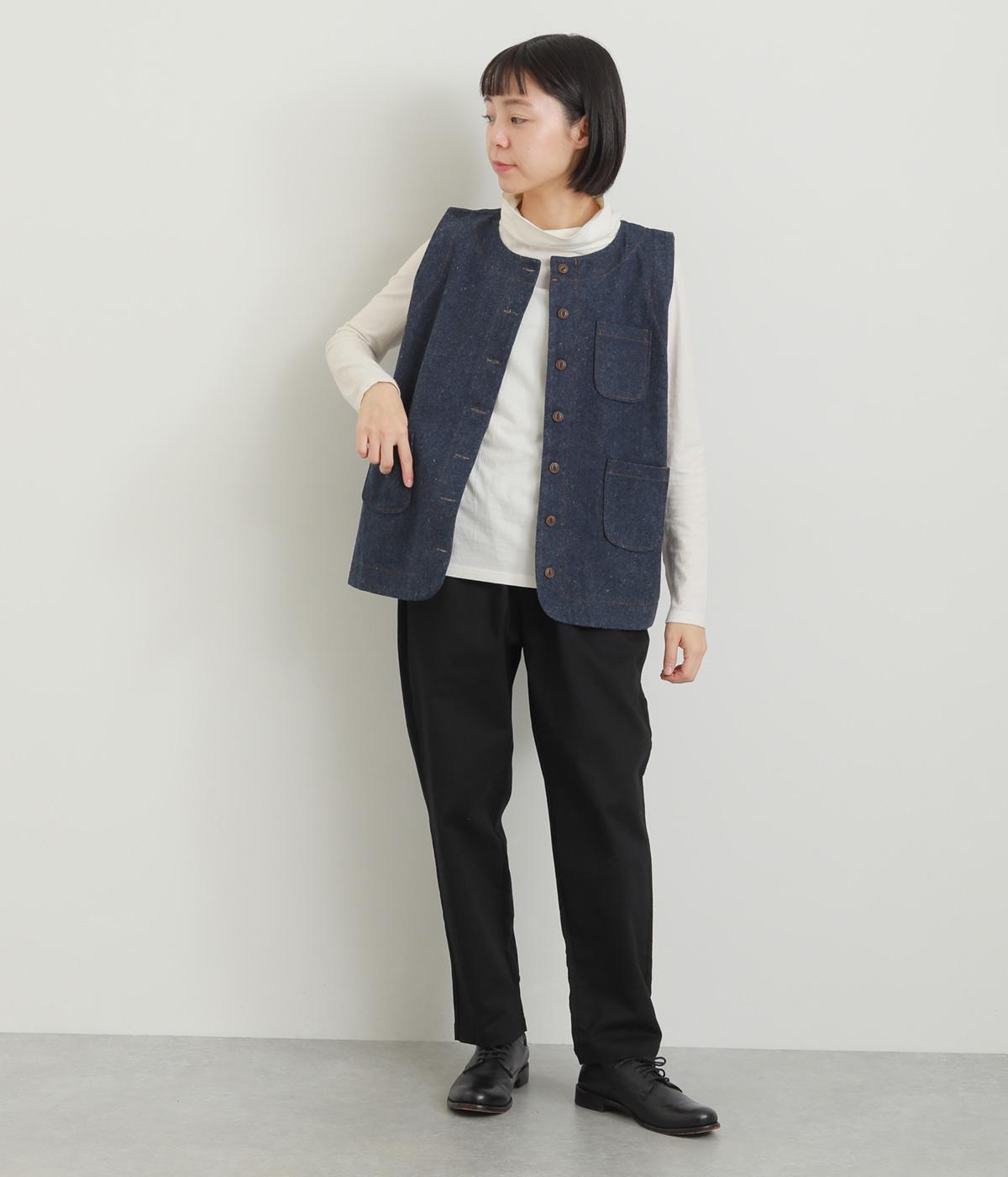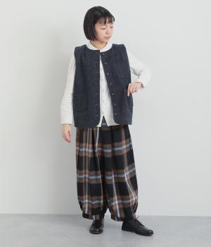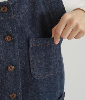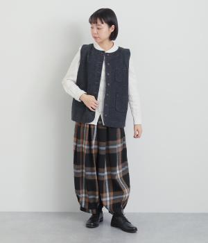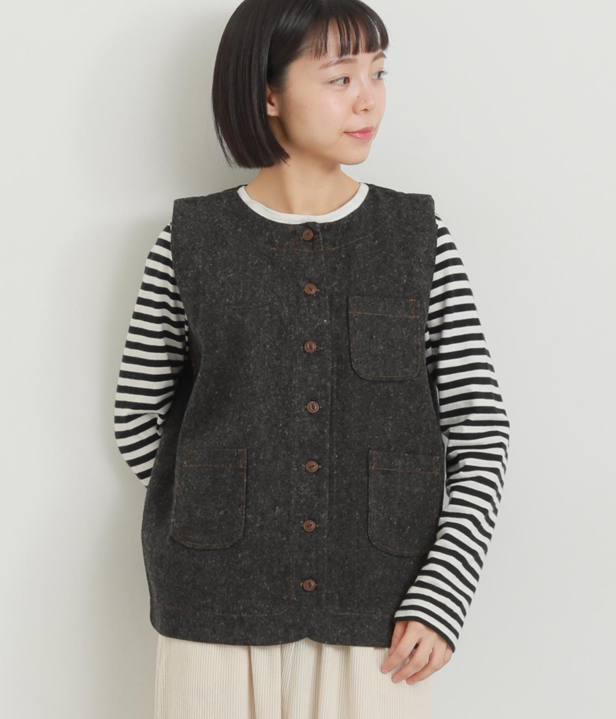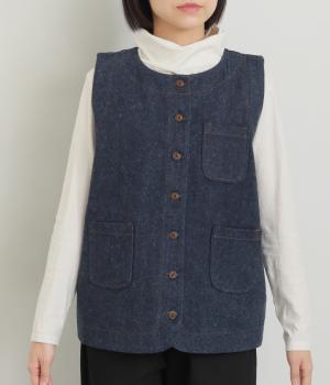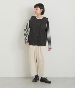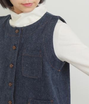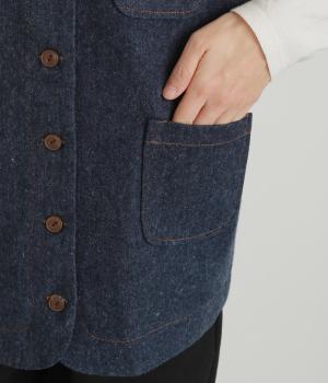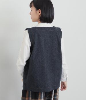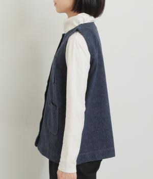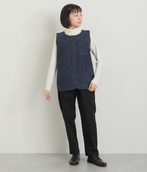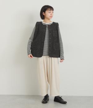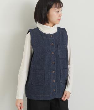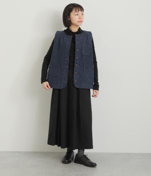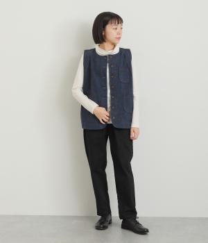 多ボタンやポケット、風合いのいい生地感で独特の存在感を醸すベスト。裾やポケットのラインに丸みをつけることで、カジュアルながらもやさしい雰囲気に。トップボタンまで留めてきちんと着こなしたくなる一枚です。