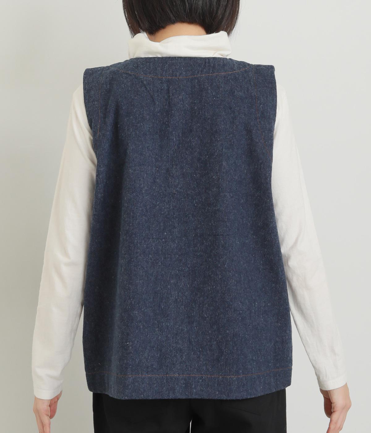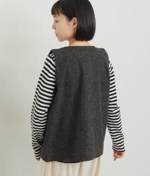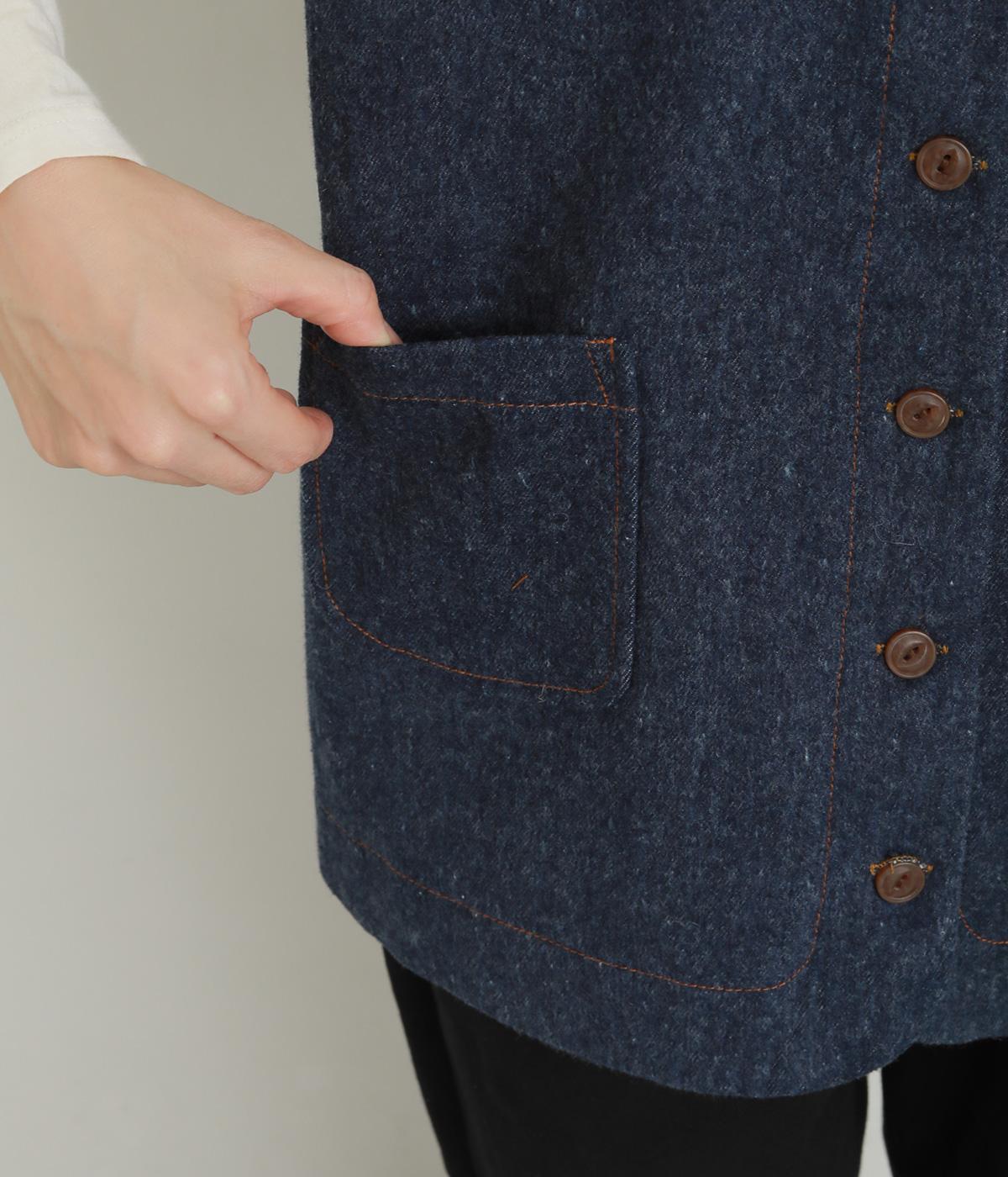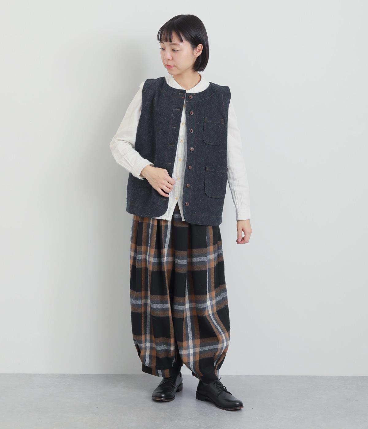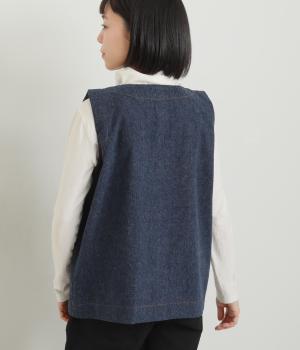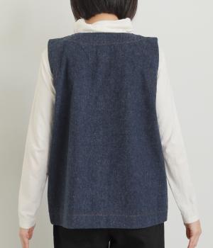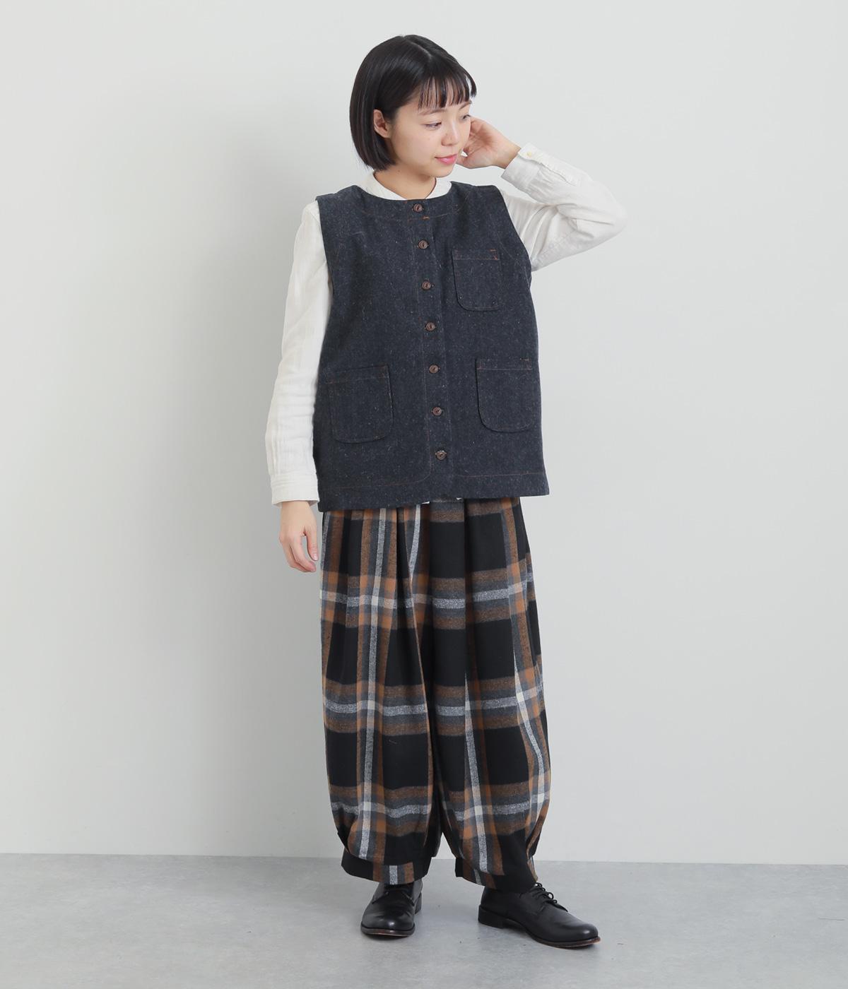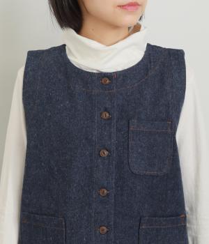 多ボタンやポケット、風合いのいい生地感で独特の存在感を醸すベスト。裾やポケットのラインに丸みをつけることで、カジュアルながらもやさしい雰囲気に。トップボタンまで留めてきちんと着こなしたくなる一枚です。