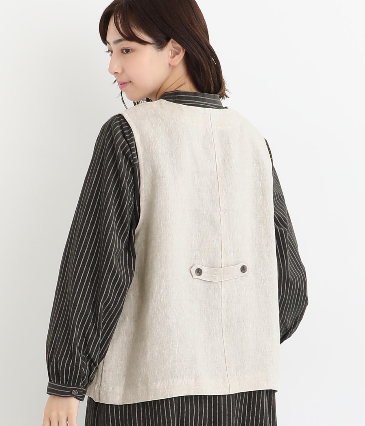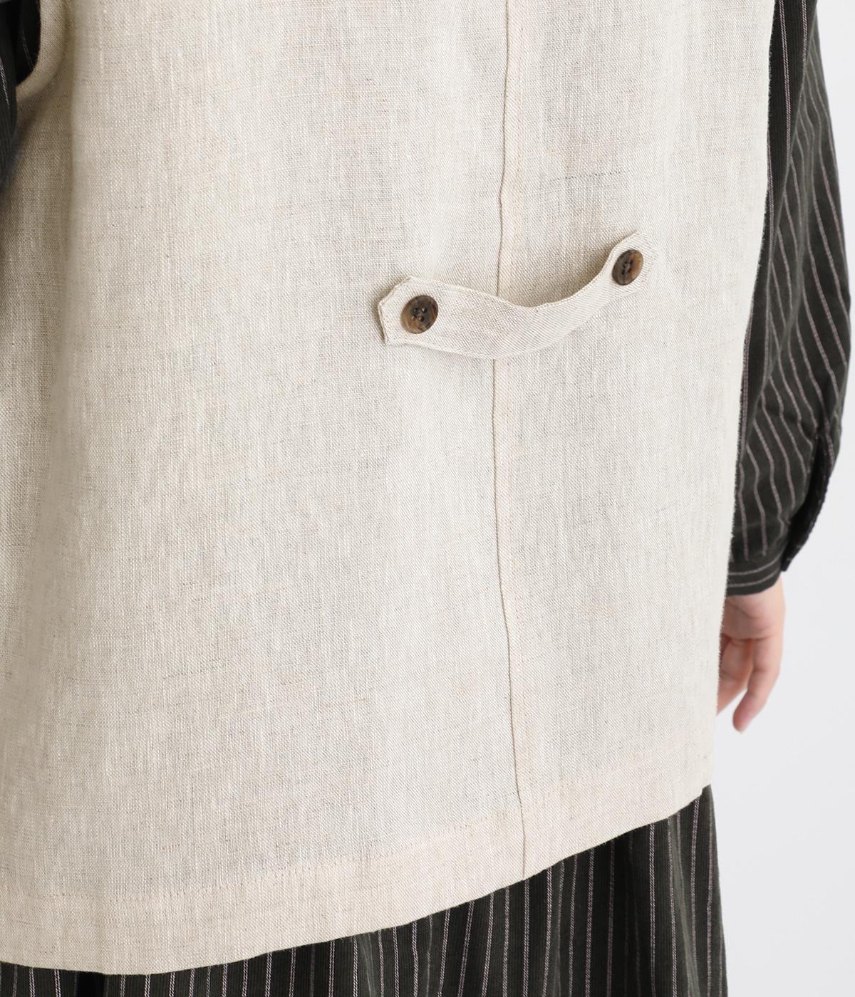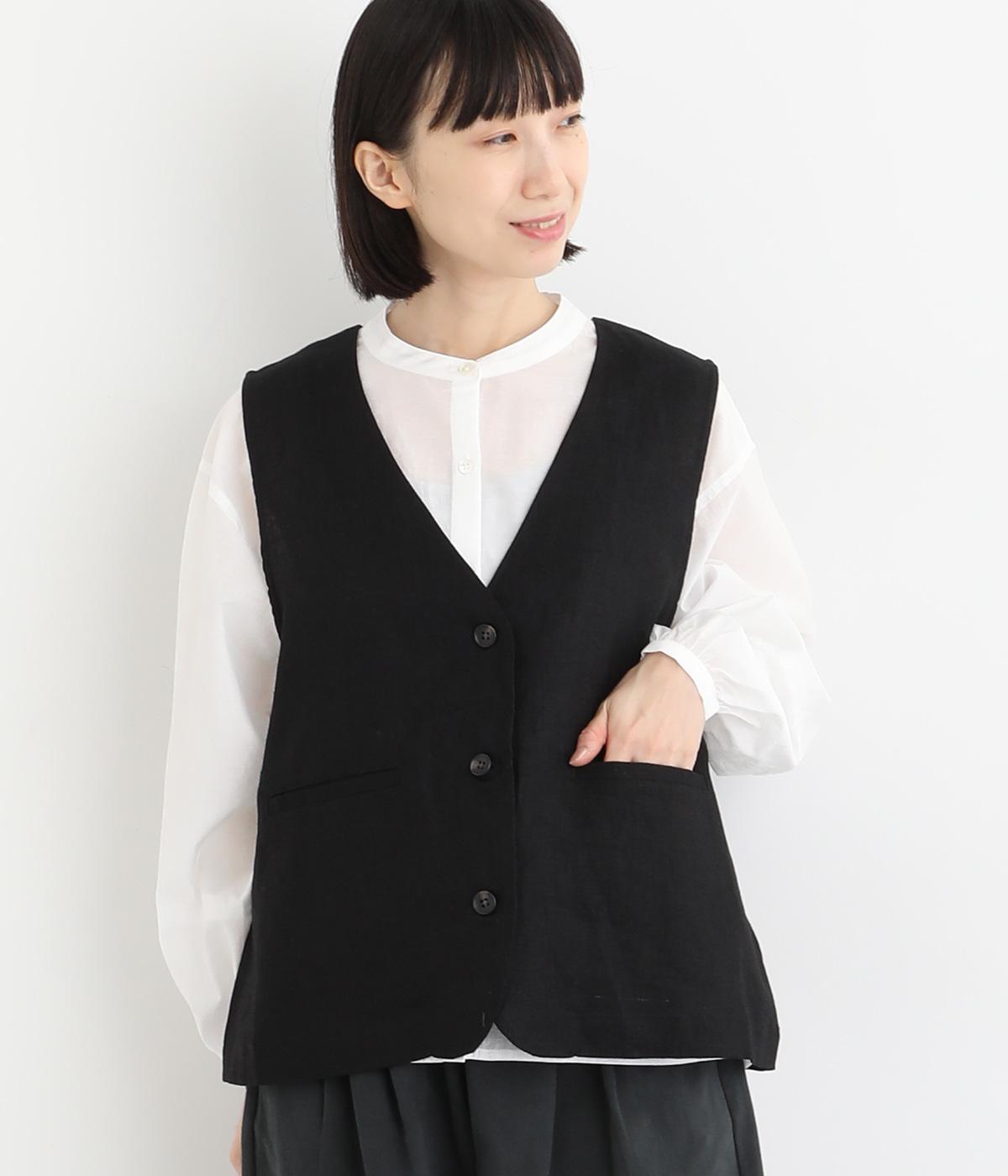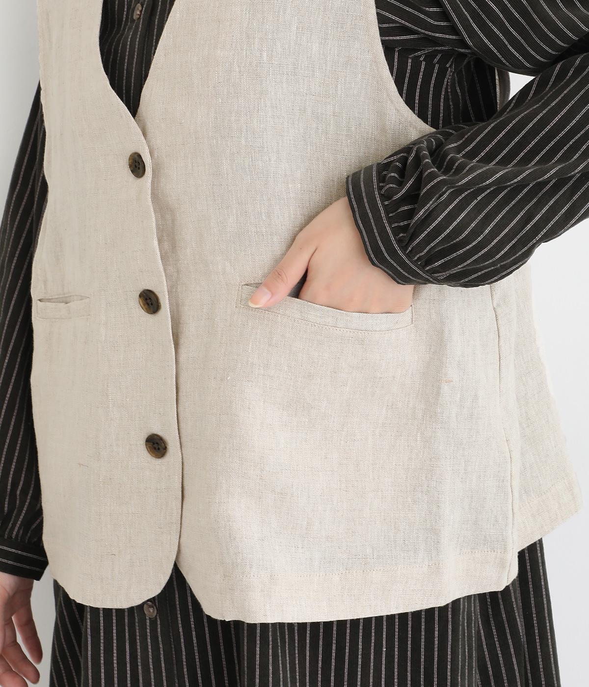 いつもの着こなしにナチュラル感と洒落感をプラスするリネンベスト。深めのVネックが顔まわりや身幅をすっきりと見せ、インナーとのバランスを整えてくれます。上からすぽっと手を入れやすい、便利なポケットつきです。