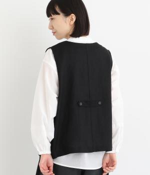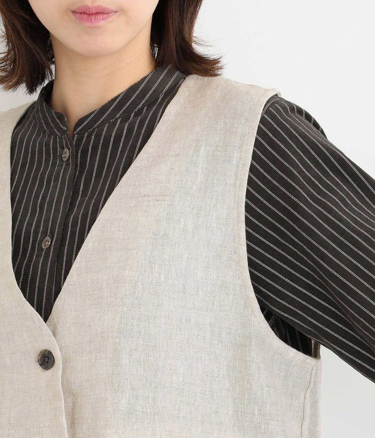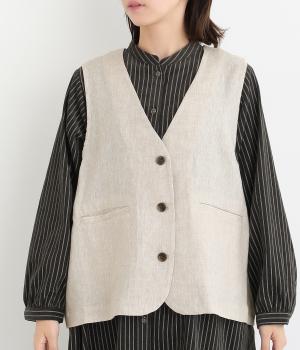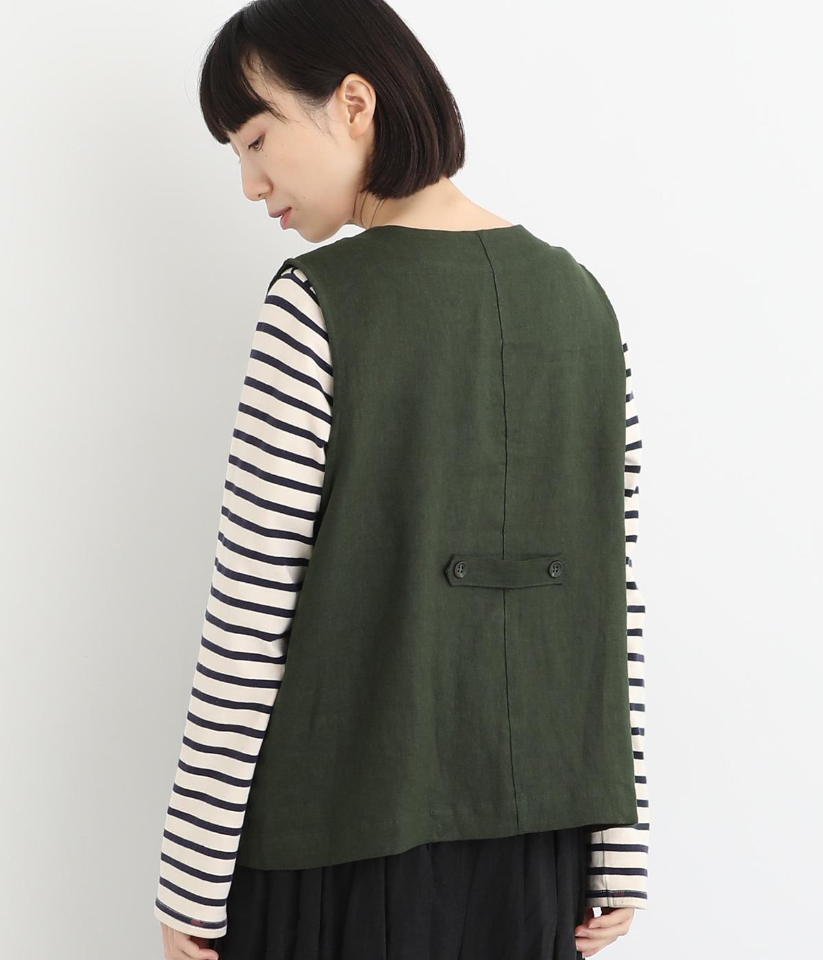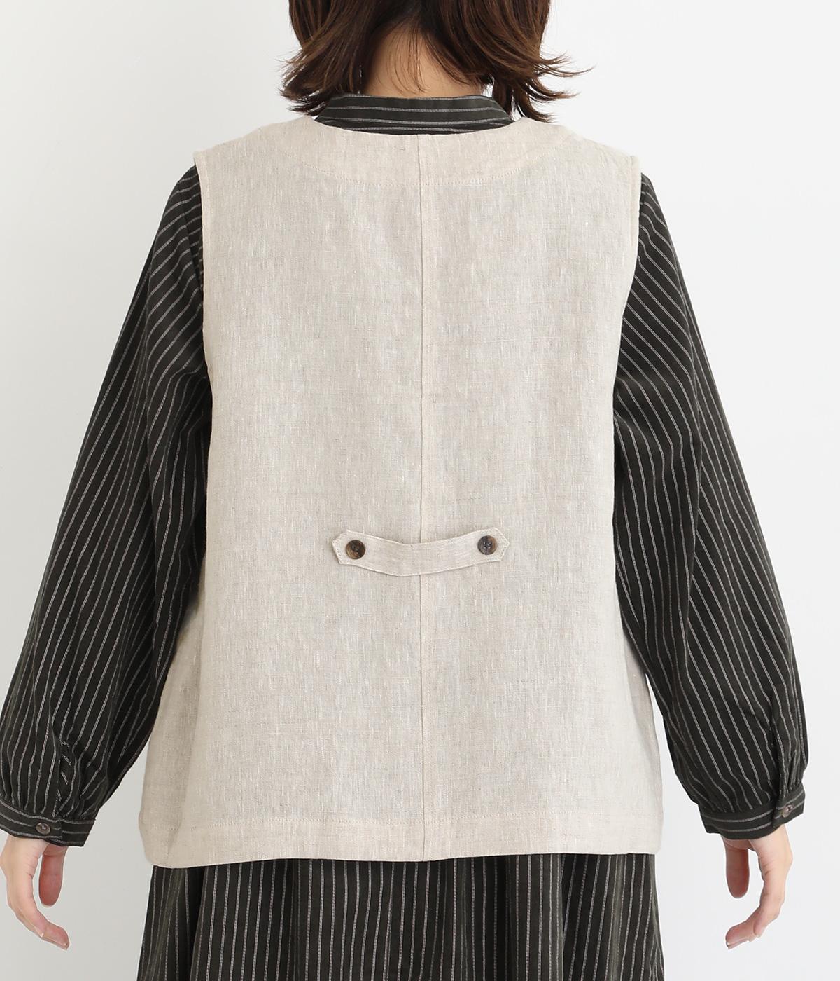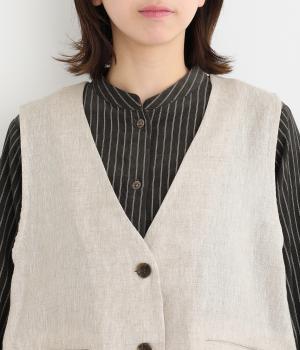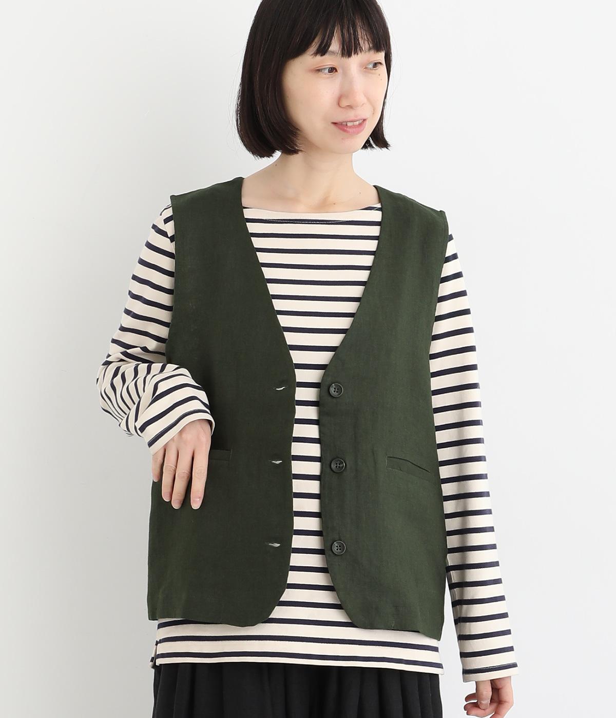 いつもの着こなしにナチュラル感と洒落感をプラスするリネンベスト。深めのVネックが顔まわりや身幅をすっきりと見せ、インナーとのバランスを整えてくれます。上からすぽっと手を入れやすい、便利なポケットつきです。