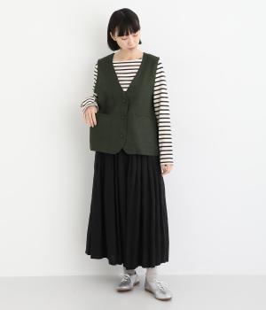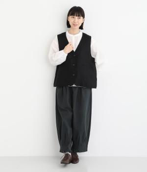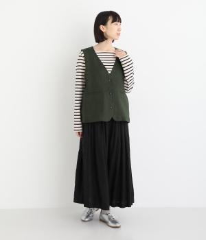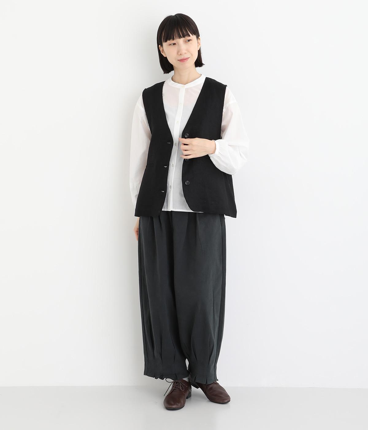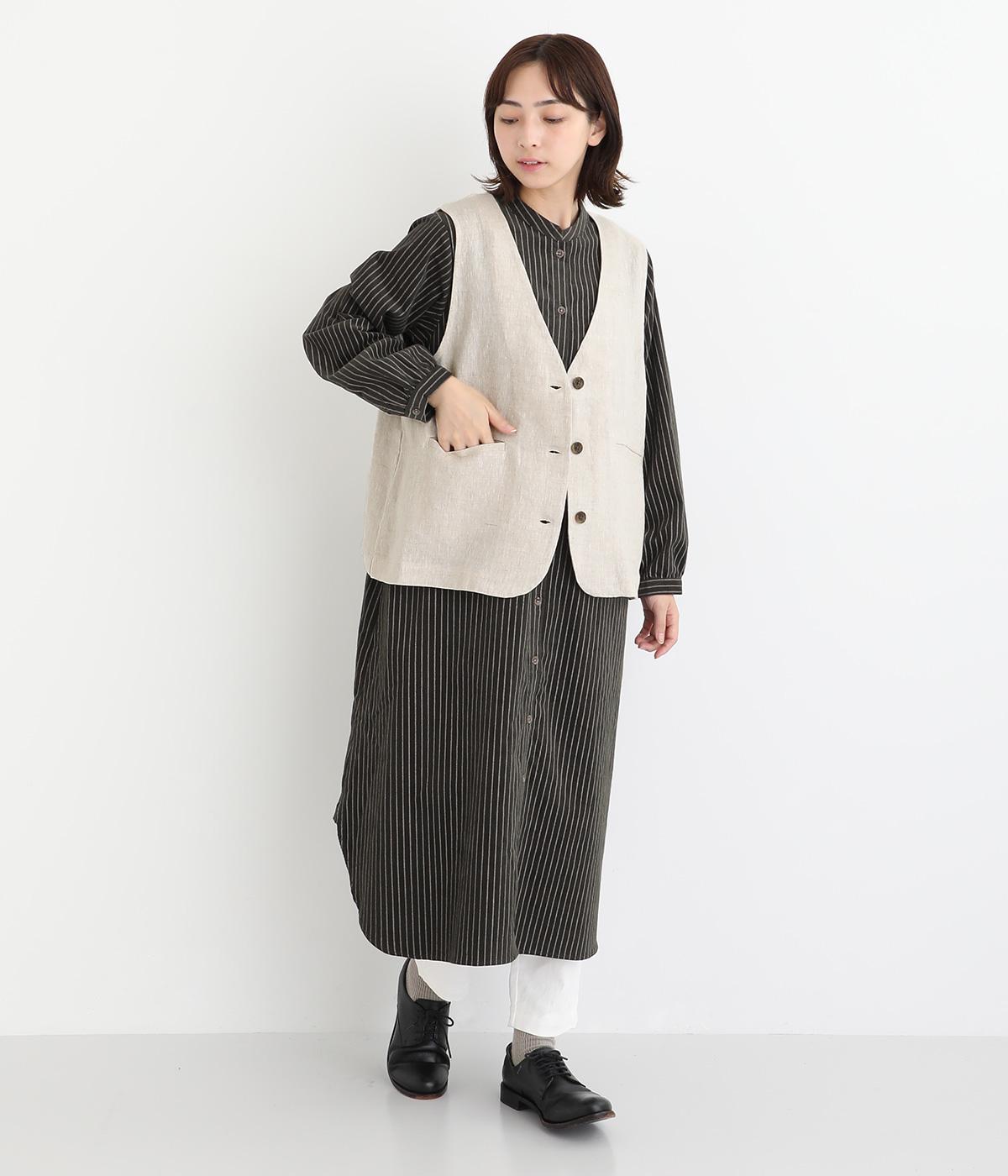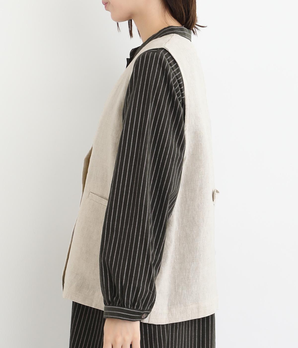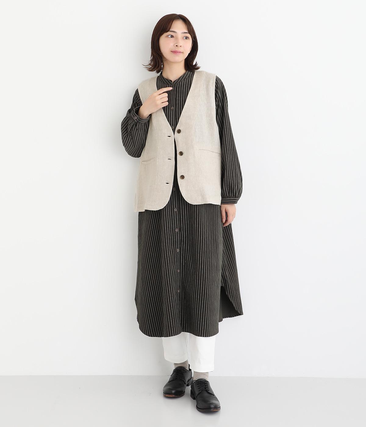 いつもの着こなしにナチュラル感と洒落感をプラスするリネンベスト。深めのVネックが顔まわりや身幅をすっきりと見せ、インナーとのバランスを整えてくれます。上からすぽっと手を入れやすい、便利なポケットつきです。