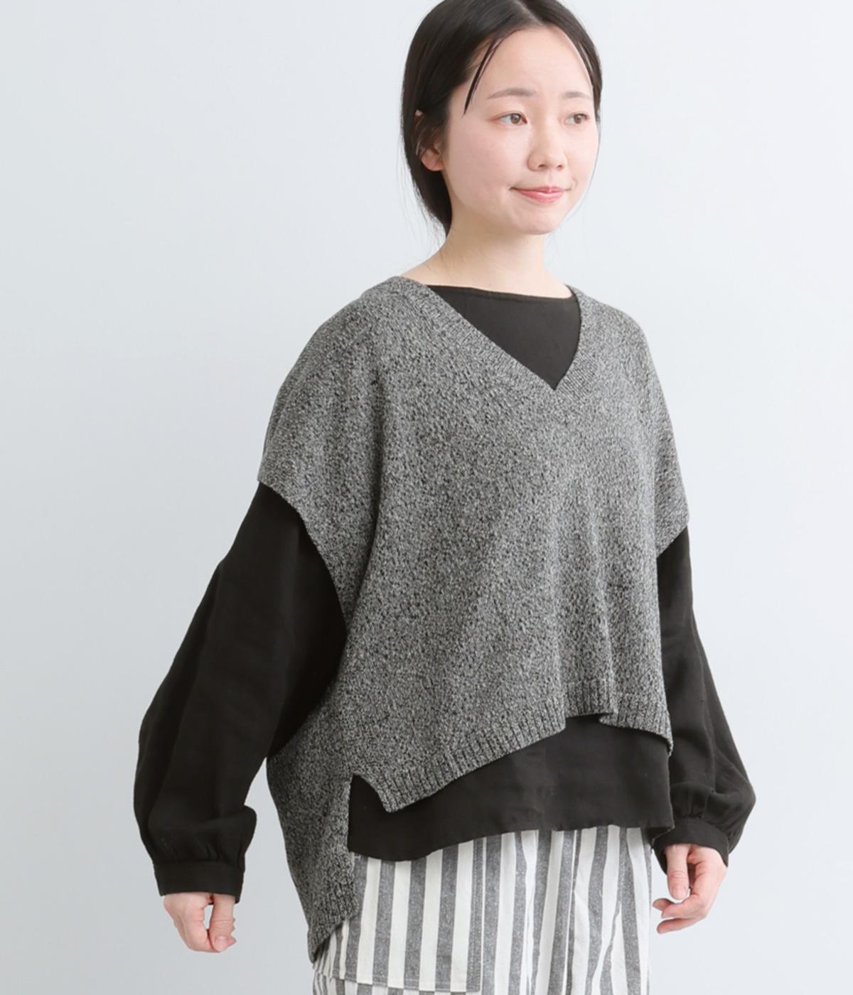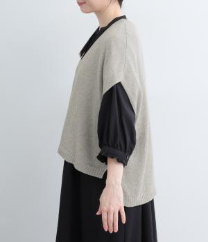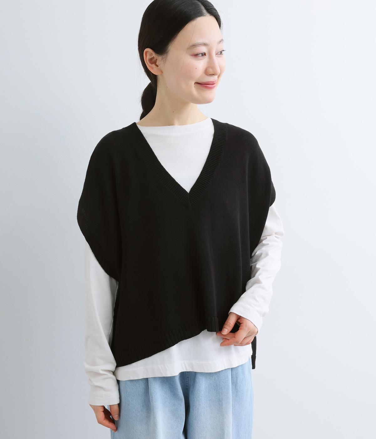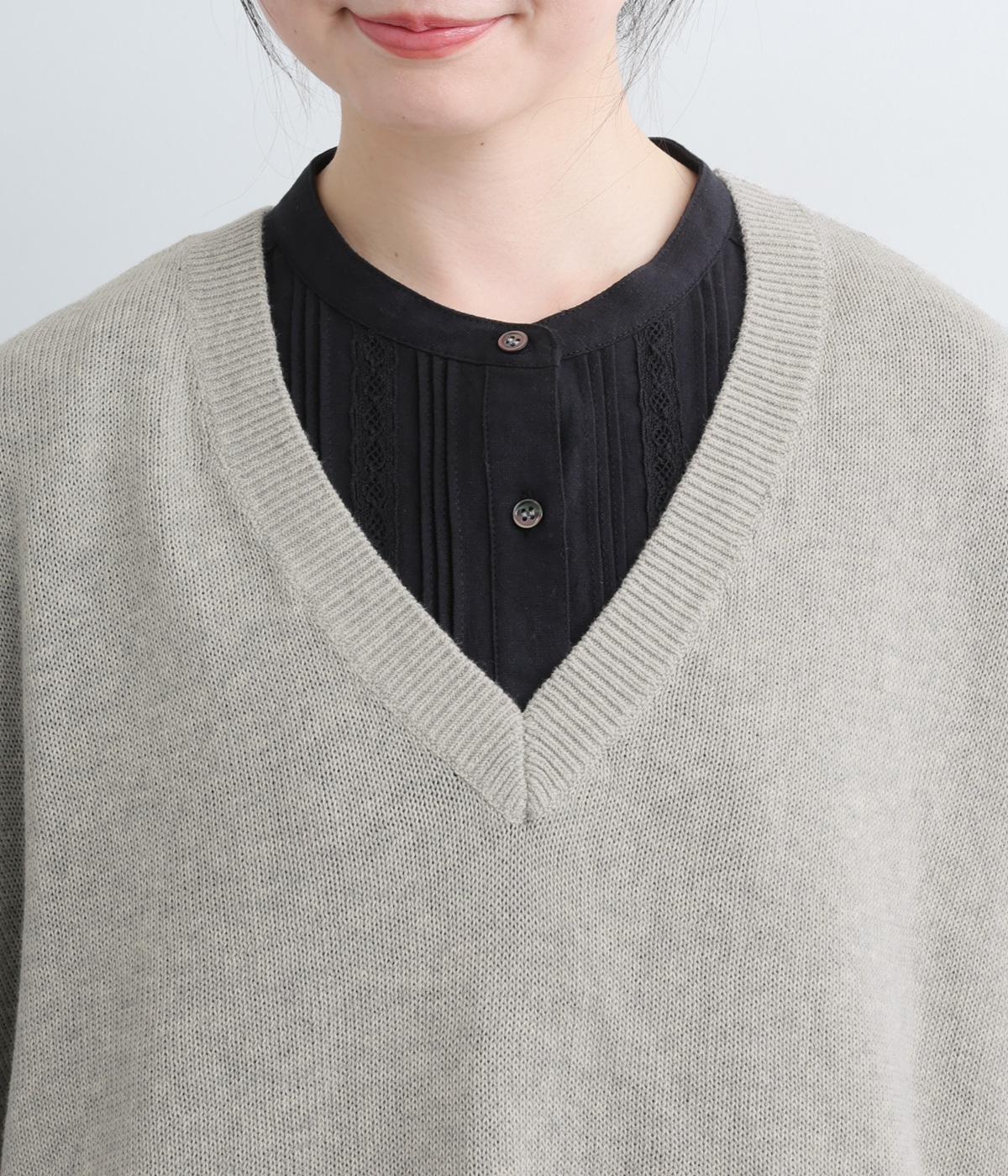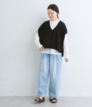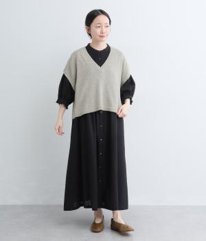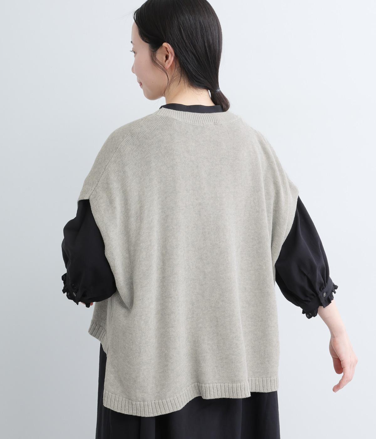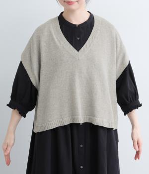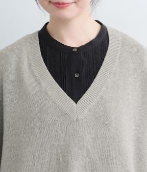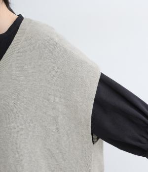 深めのVネックが顔まわりをすっきりと見せるワイドベスト。ゆったりとした身幅が体のラインを拾いにくく、肩まわりを優しくカバーする絶妙なシルエット。お手持ちのアイテムに重ねるだけで、装いに奥行きを添える一枚です。