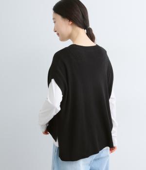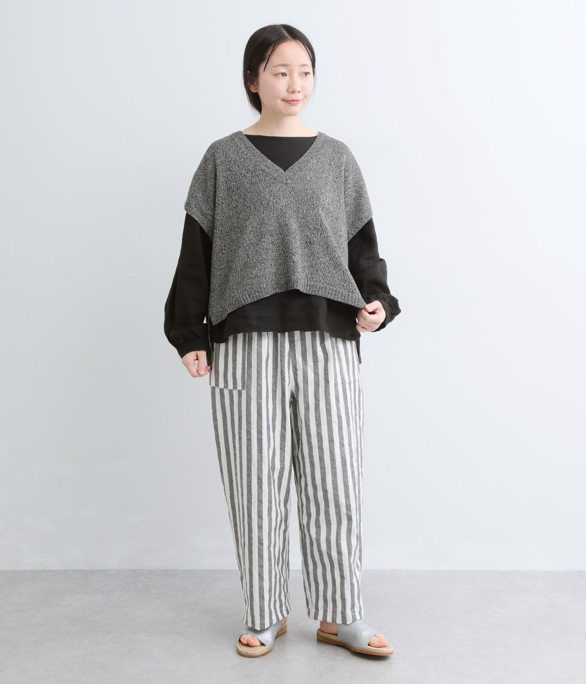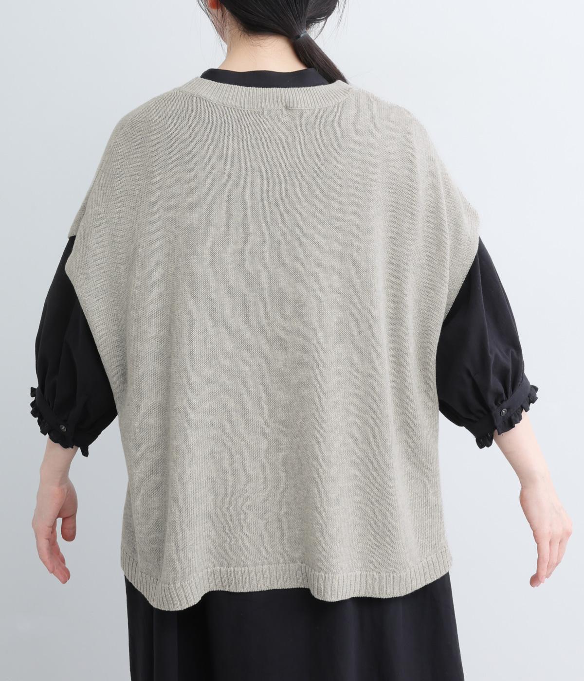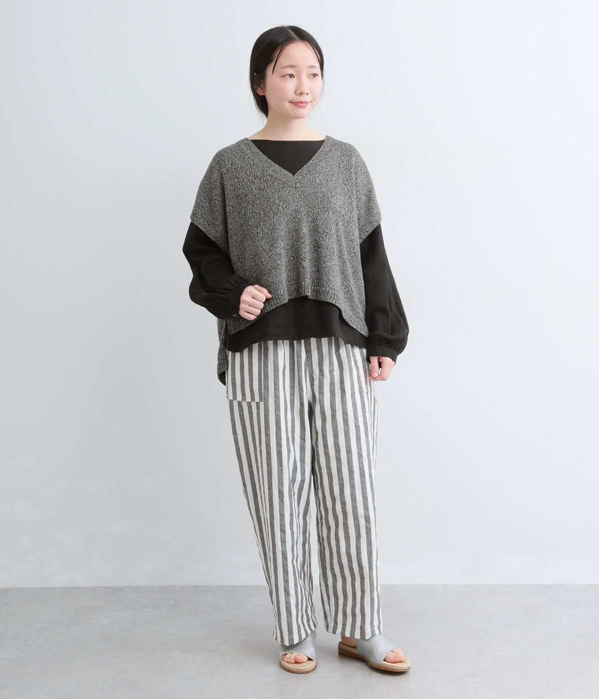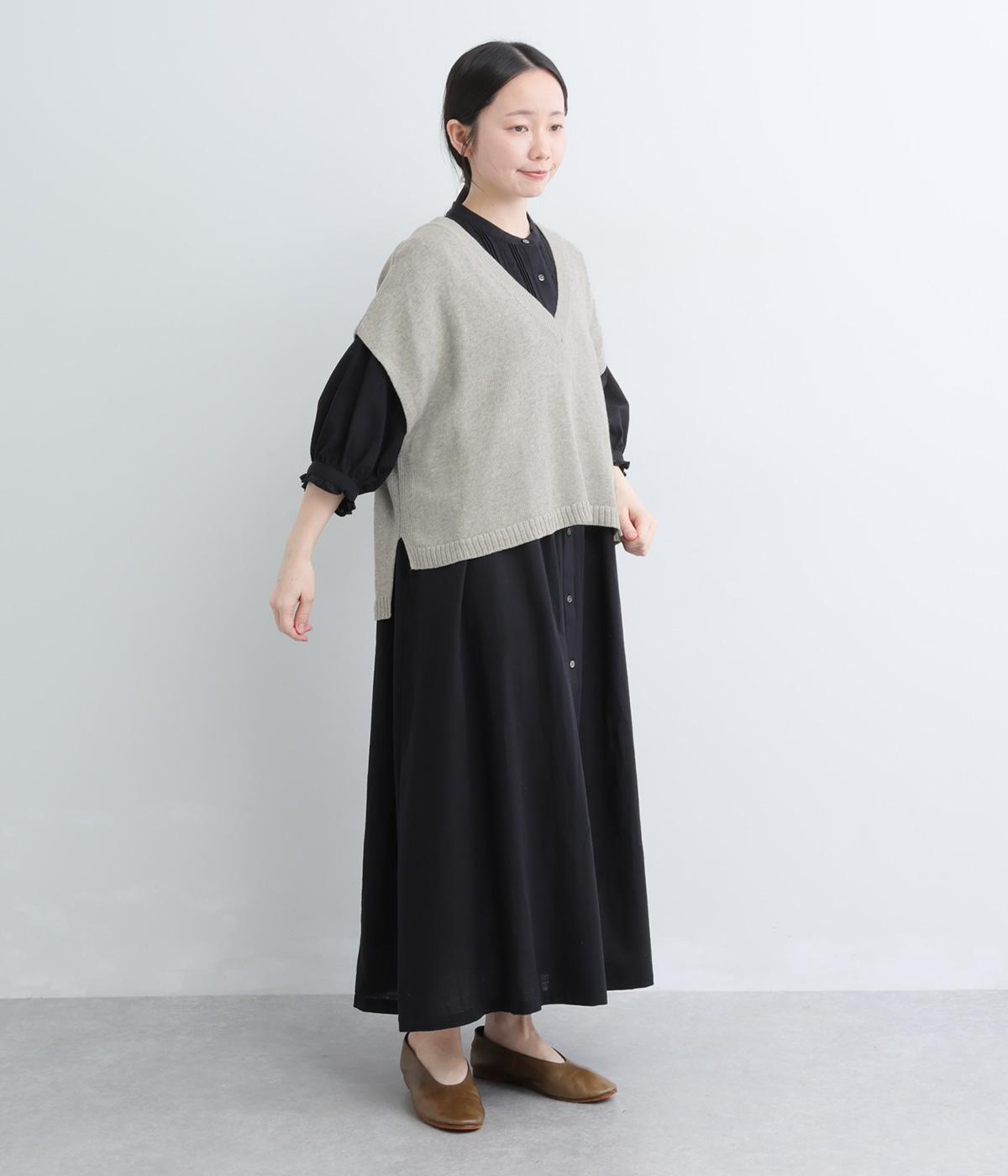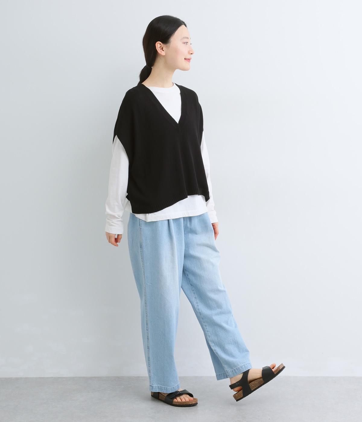 深めのVネックが顔まわりをすっきりと見せるワイドベスト。ゆったりとした身幅が体のラインを拾いにくく、肩まわりを優しくカバーする絶妙なシルエット。お手持ちのアイテムに重ねるだけで、装いに奥行きを添える一枚です。