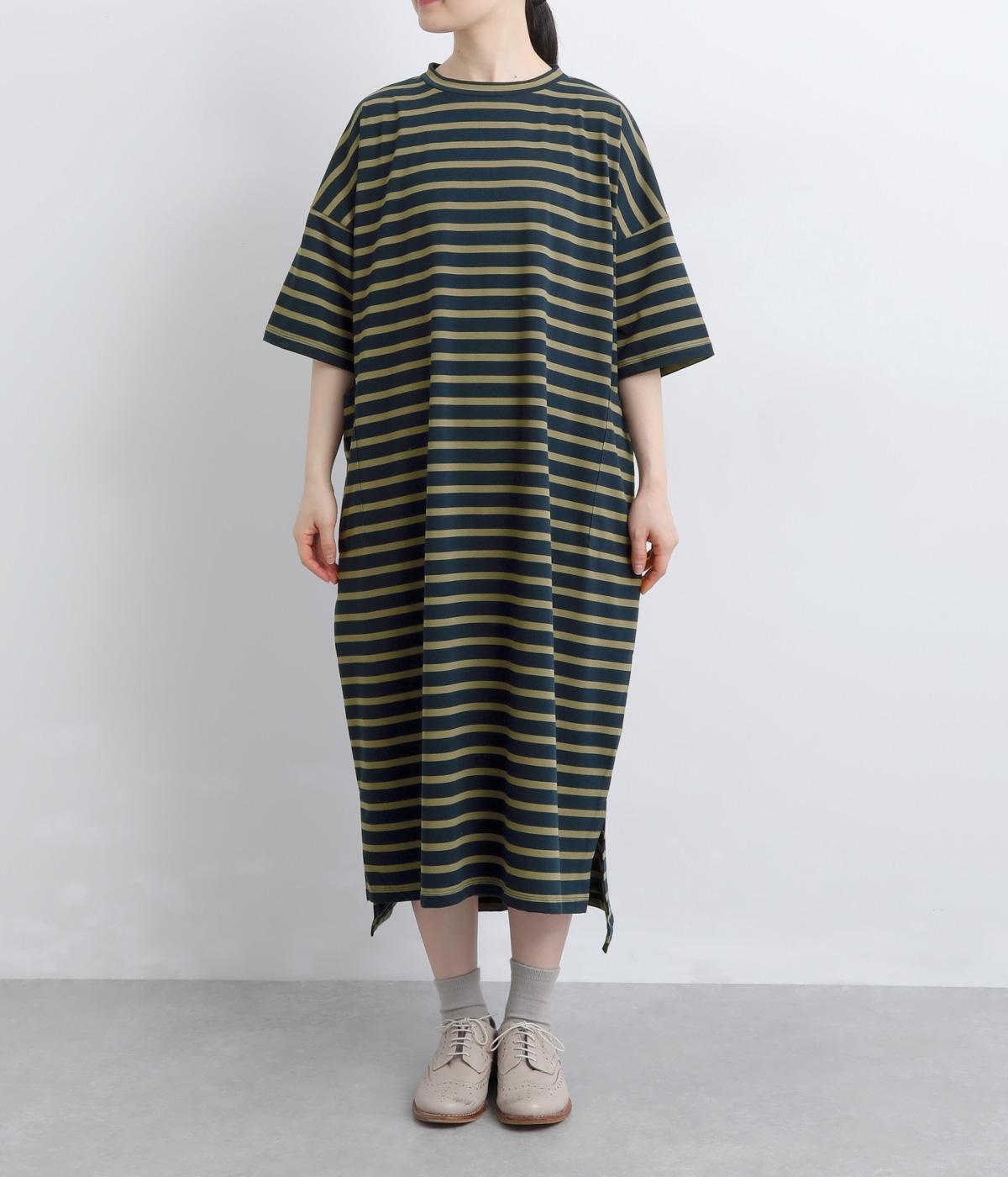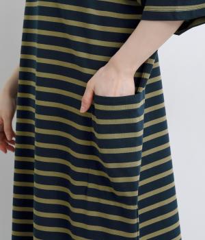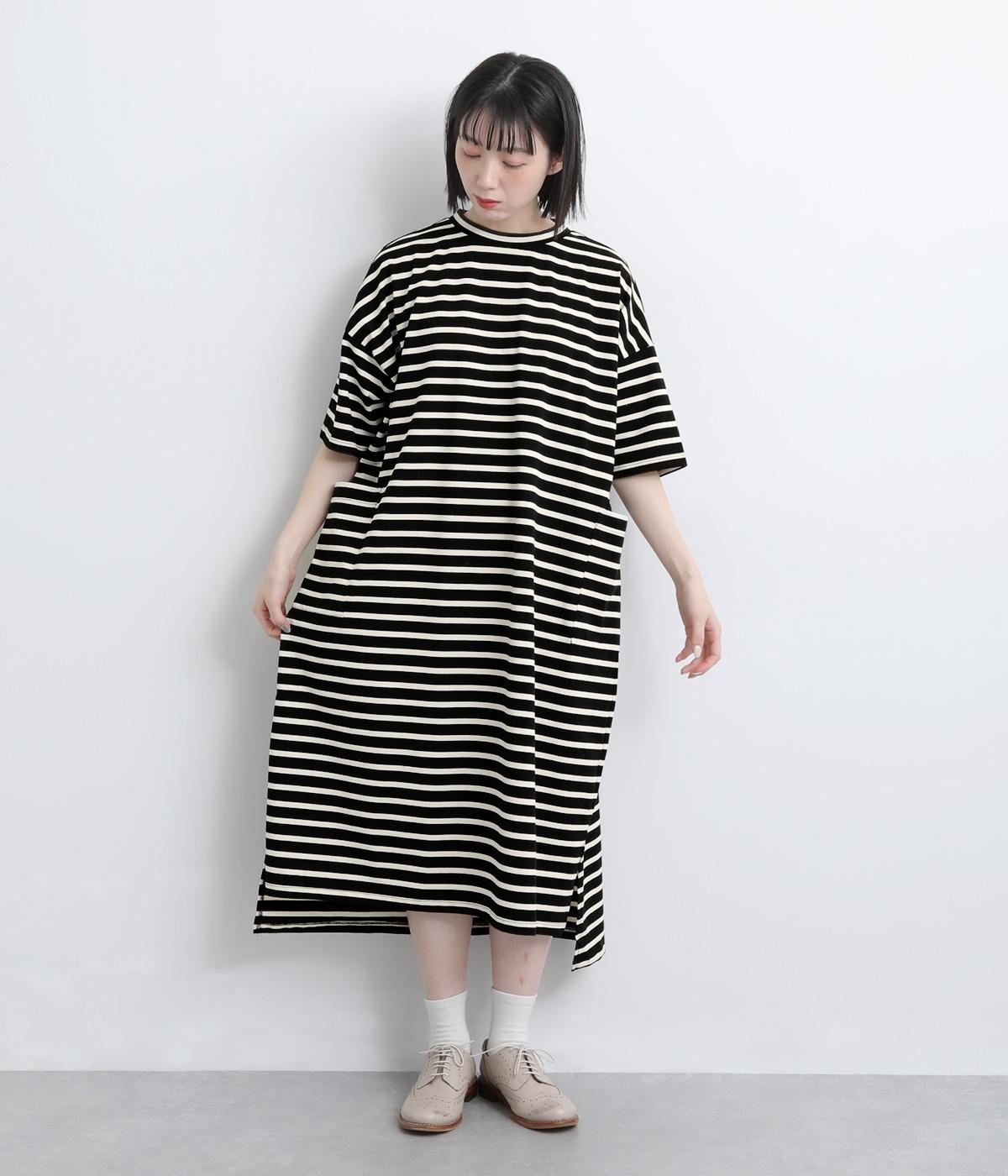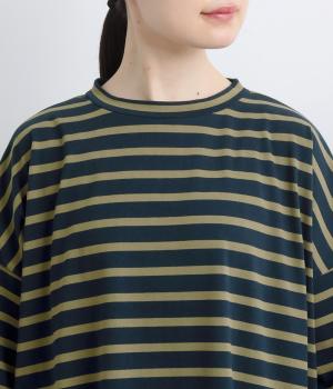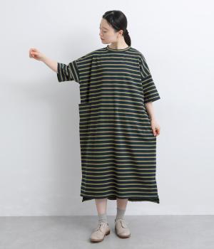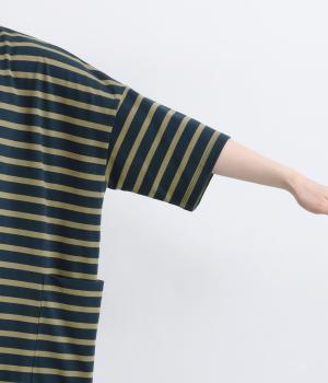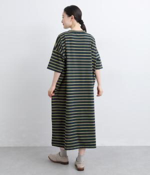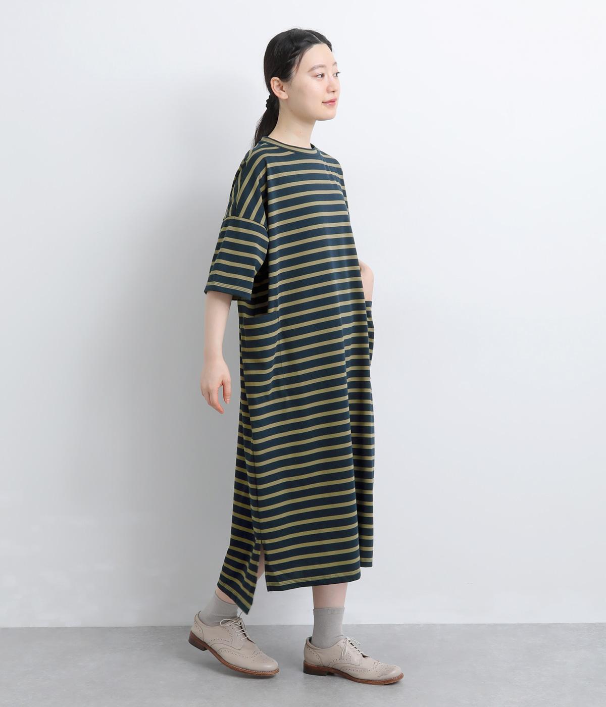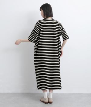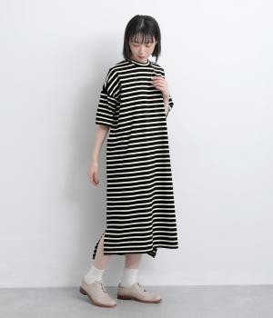 おうちでのリラックスタイムにも活躍する天竺ワンピースは、ボーダー柄でカジュアル感をさらに高めました。手元をすっきり見せた6分袖やスリット裾で適度に抜け感をつくり、インナーやボトムとのレイヤードもおすすめ。