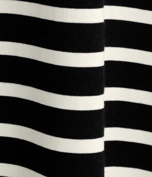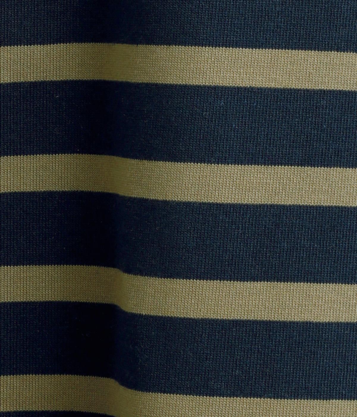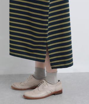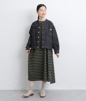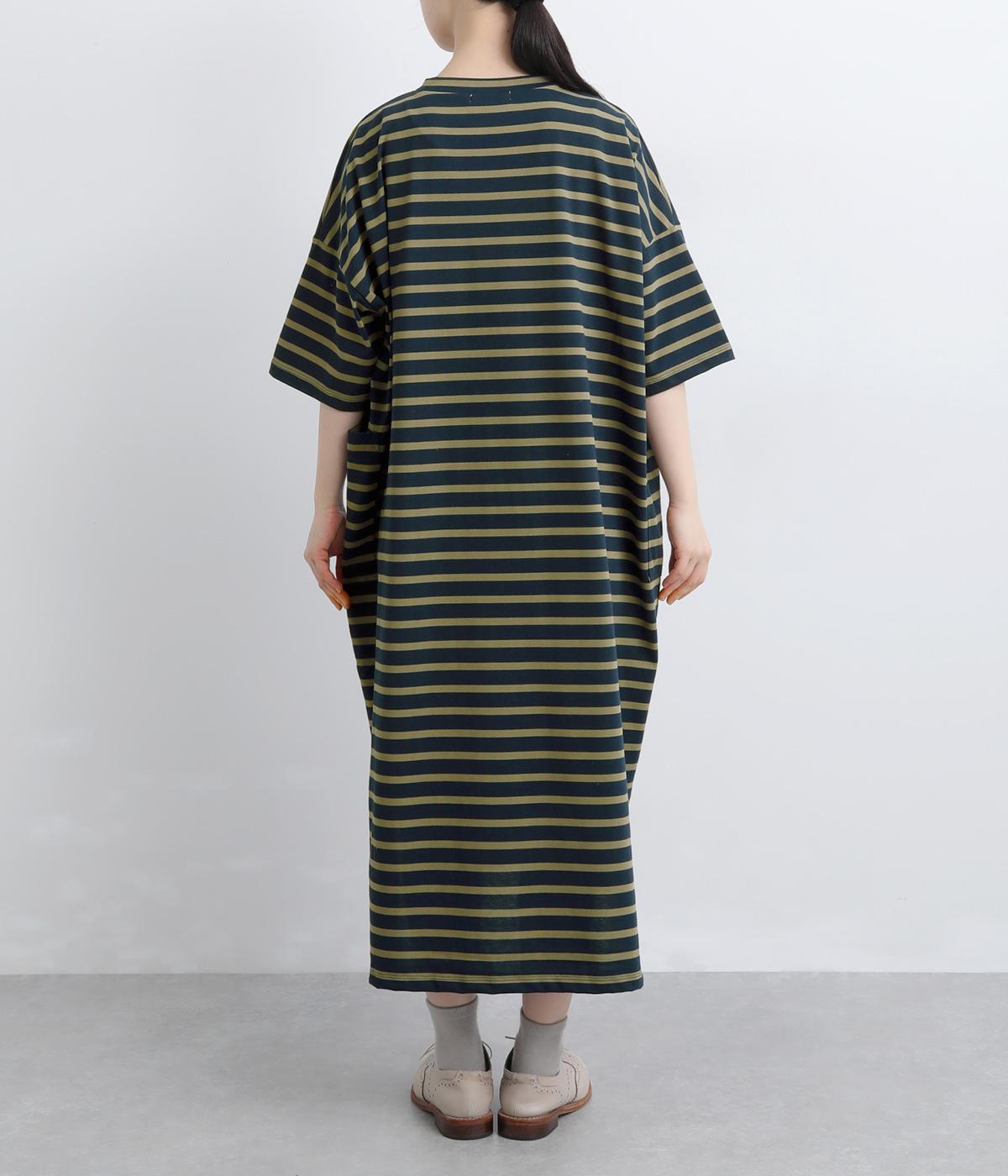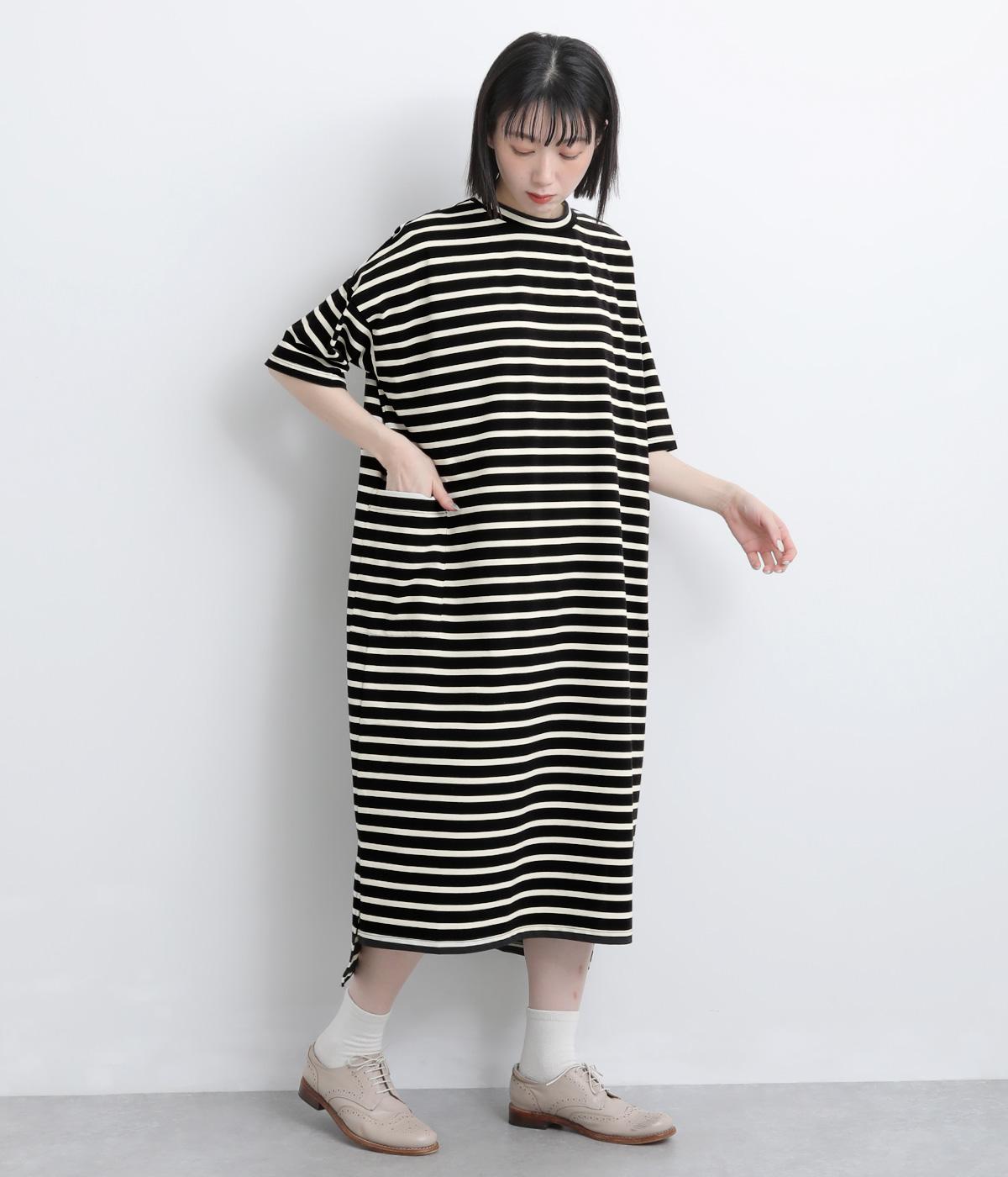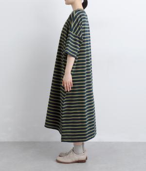 おうちでのリラックスタイムにも活躍する天竺ワンピースは、ボーダー柄でカジュアル感をさらに高めました。手元をすっきり見せた6分袖やスリット裾で適度に抜け感をつくり、インナーやボトムとのレイヤードもおすすめ。