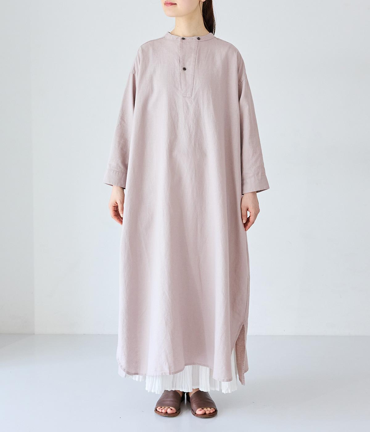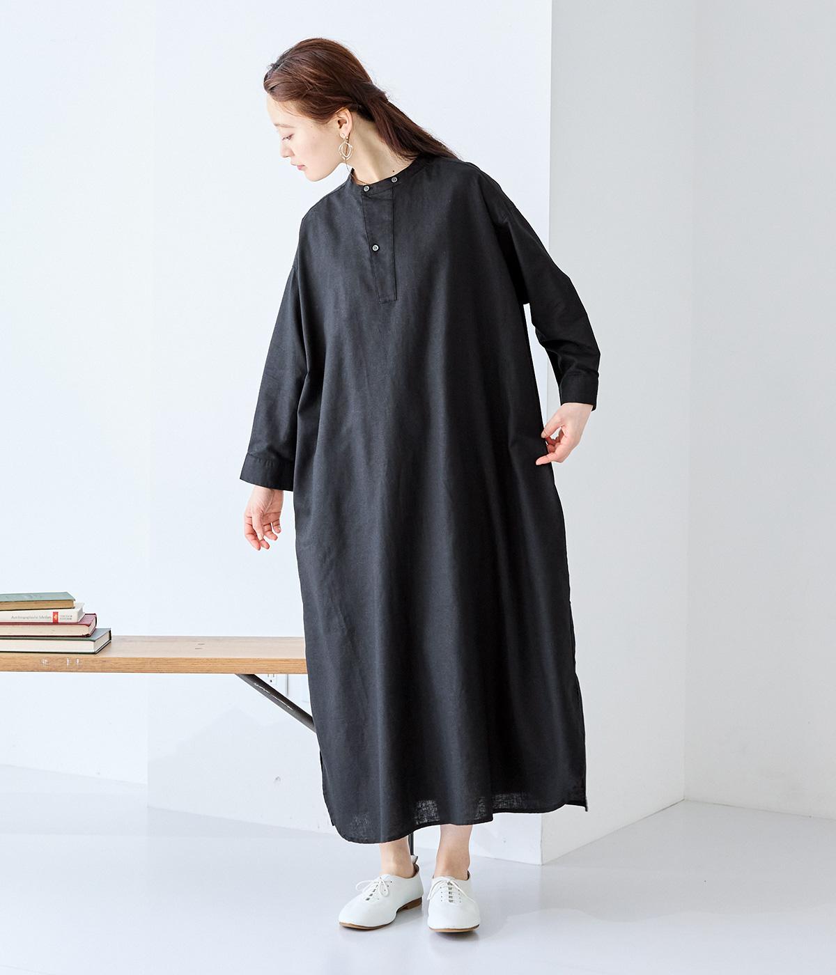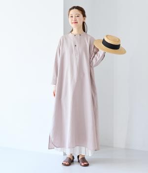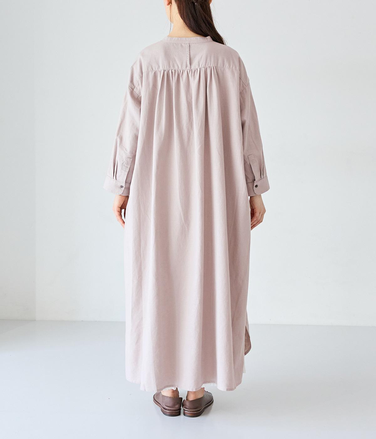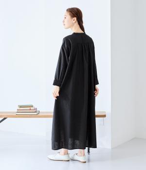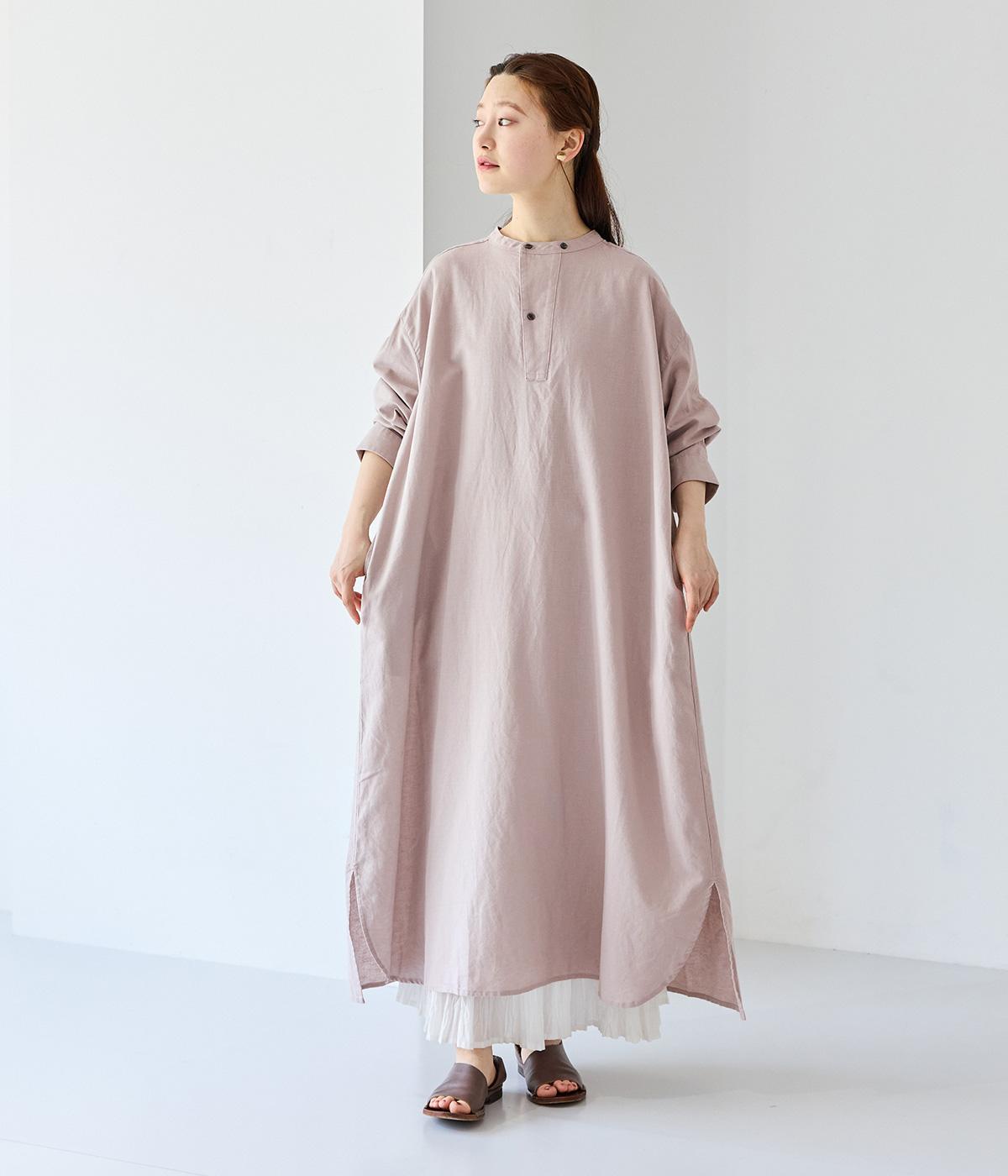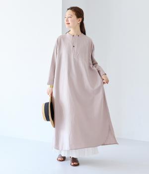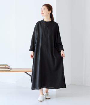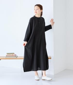 変形のヘンリーネックをポイントにしたロングワンピース。生地をたっぷりと使用し、ゆったりと体を包み込むシルエットが素敵です。バックヨーク下にはギャザーを入れ、後ろ姿も華やか。透け感がなく着丈も長めなので、一枚で安心して着用できます。