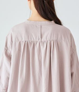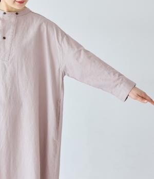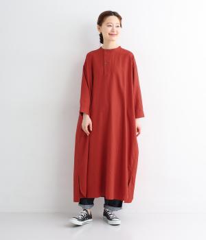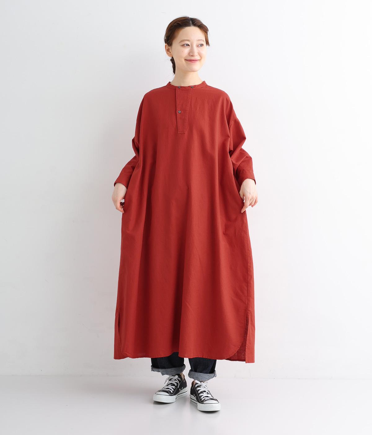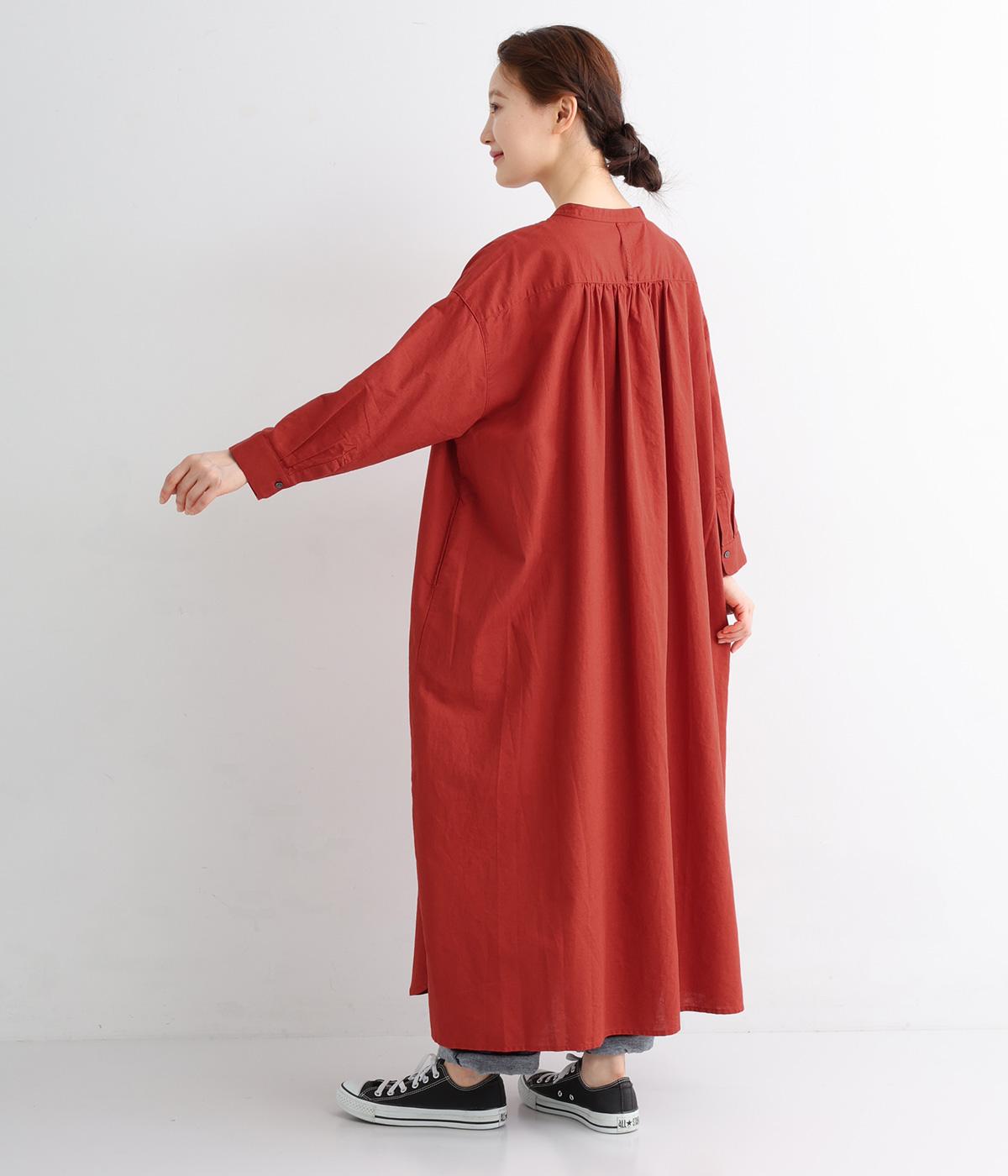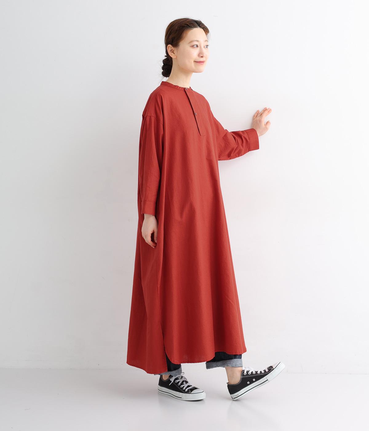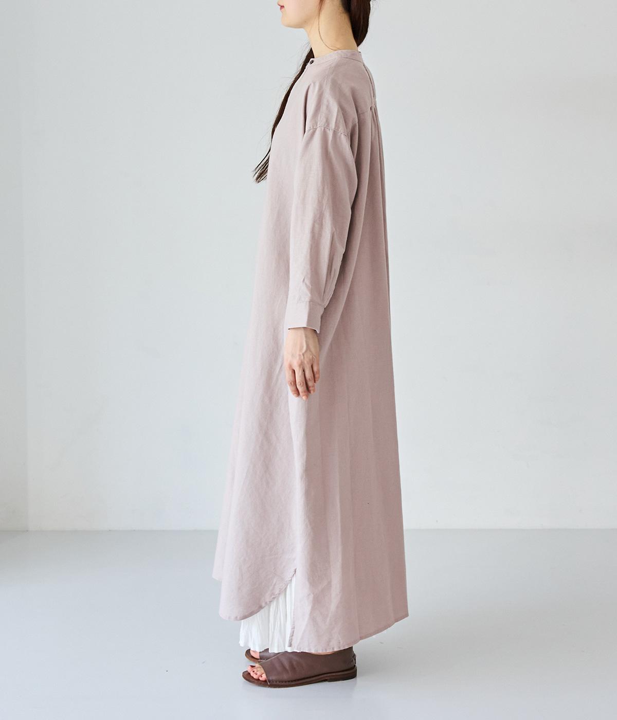 変形のヘンリーネックをポイントにしたロングワンピース。生地をたっぷりと使用し、ゆったりと体を包み込むシルエットが素敵です。バックヨーク下にはギャザーを入れ、後ろ姿も華やか。透け感がなく着丈も長めなので、一枚で安心して着用できます。