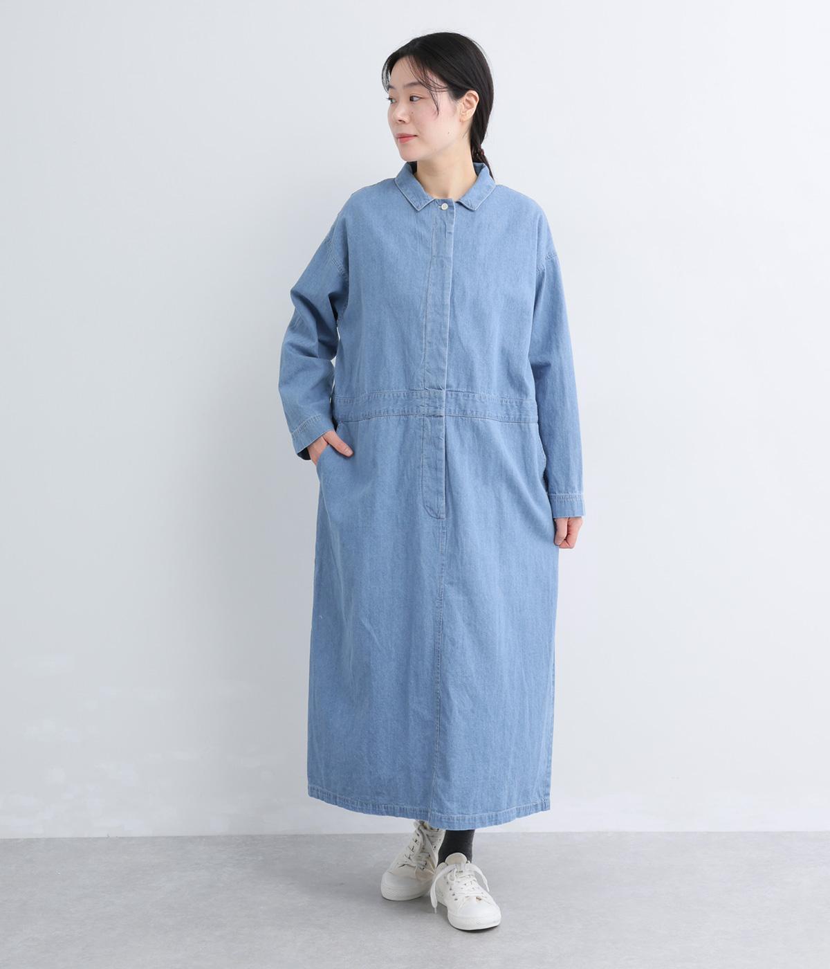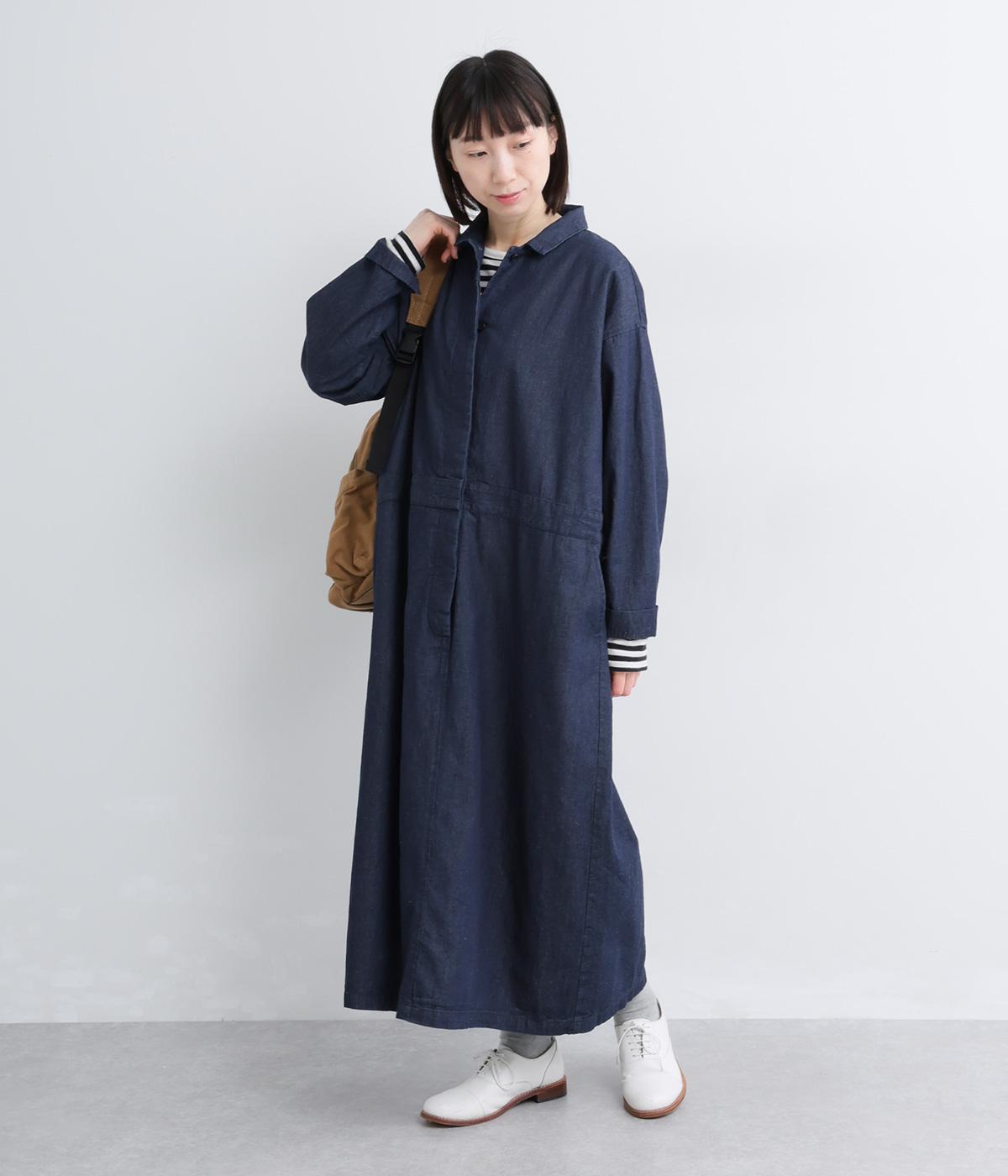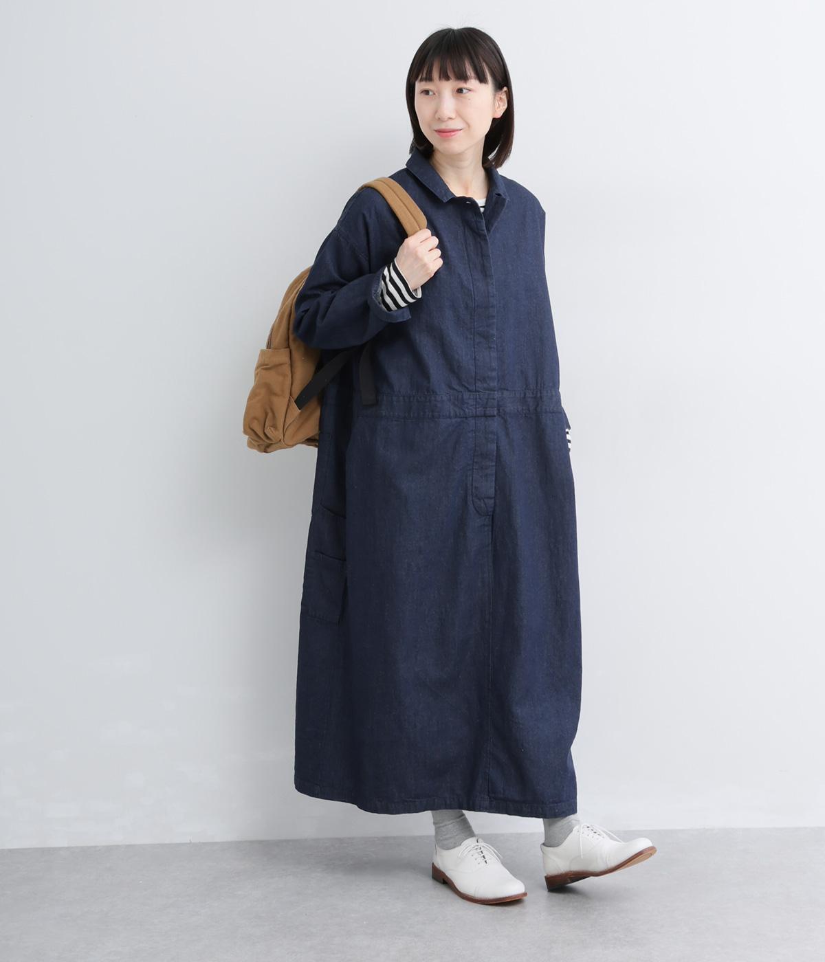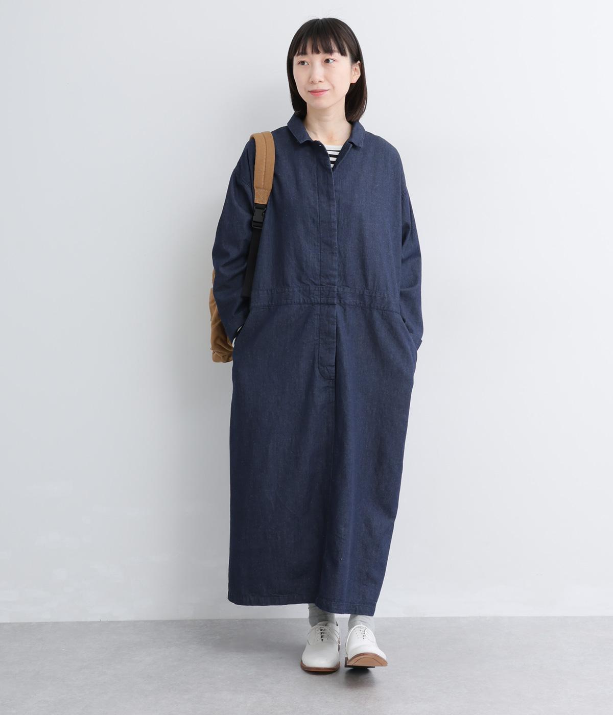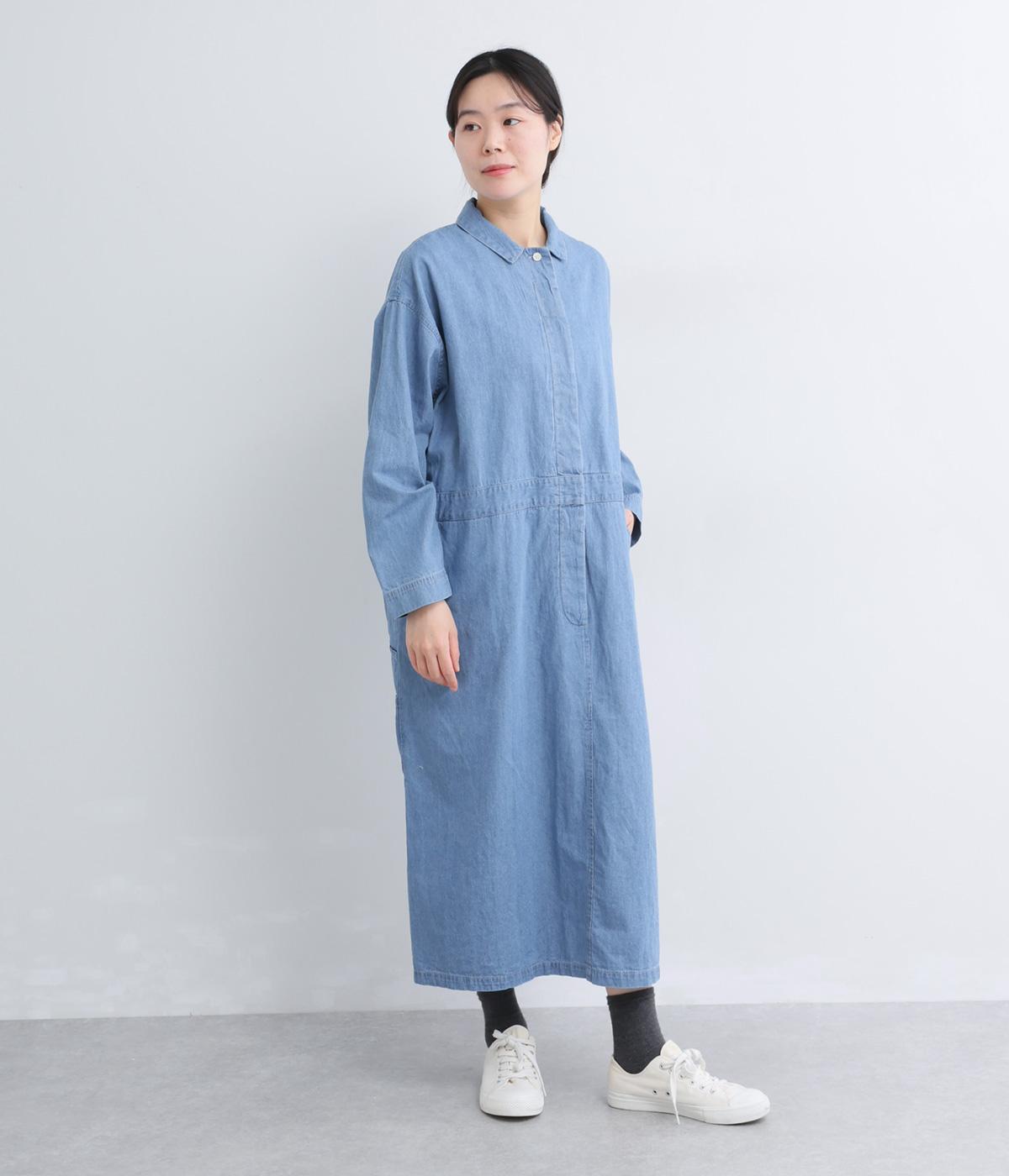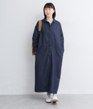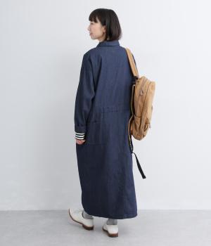 ウエストラインのベルト切り替えやヒップポケットでカジュアルに仕立てたワンピース。すっきりとしたシンプルなデザインが好印象で、比翼ボタンをあけて羽織ったレイヤードスタイルもおすすめ。袖口はラフに折り返しても◎。