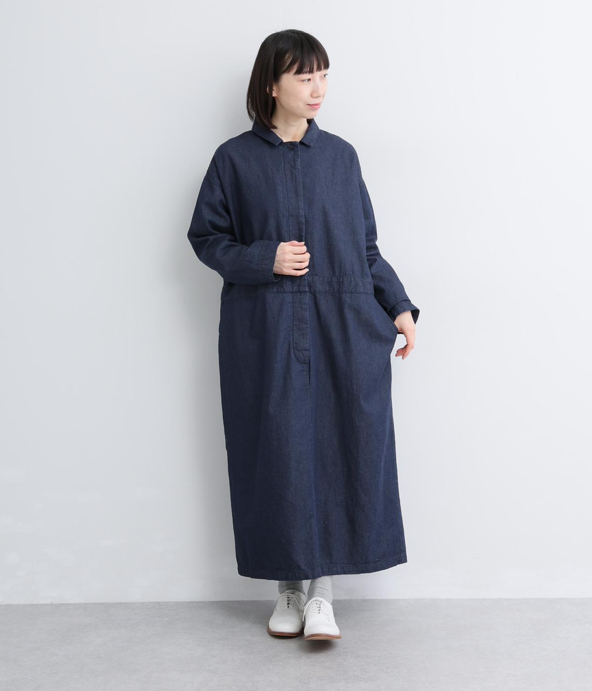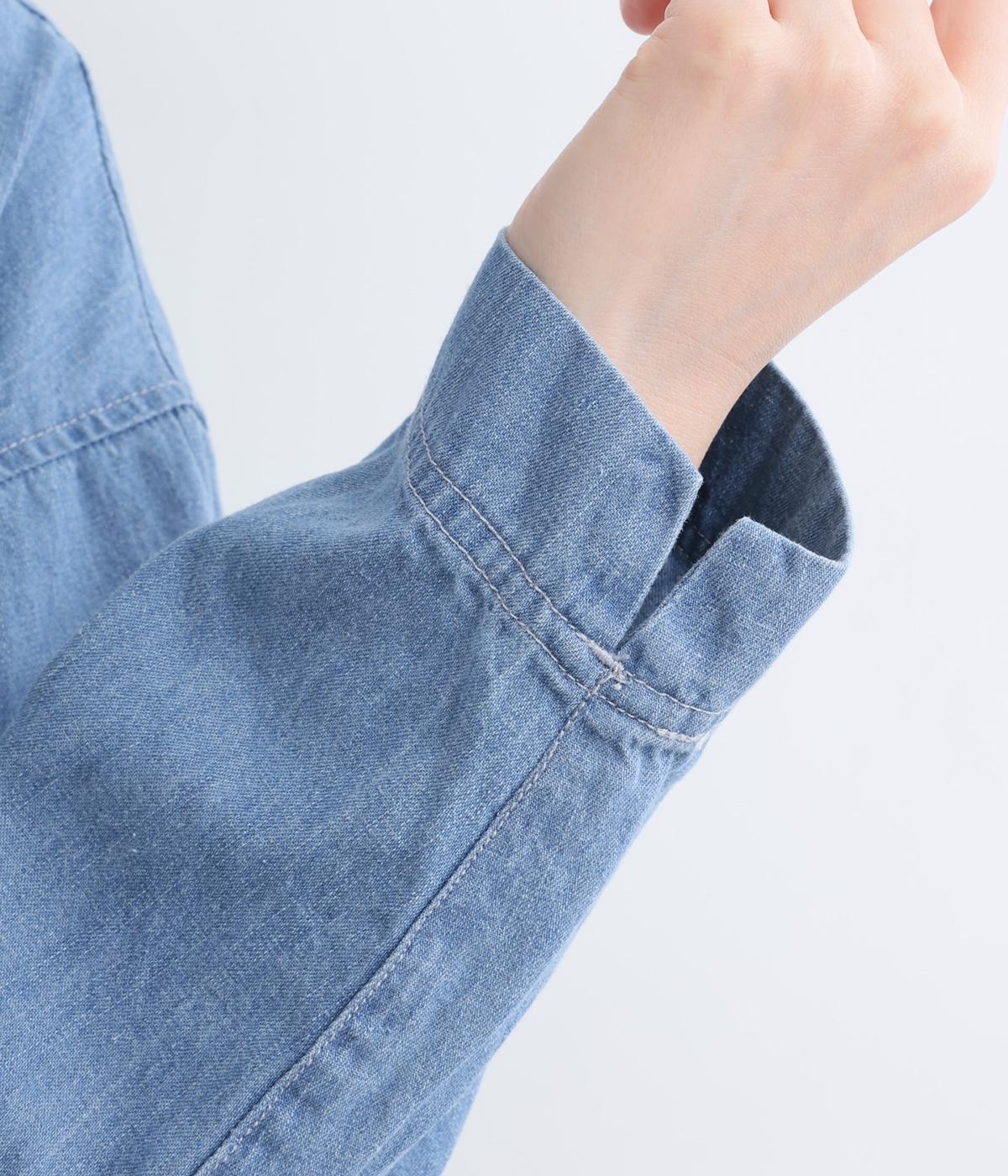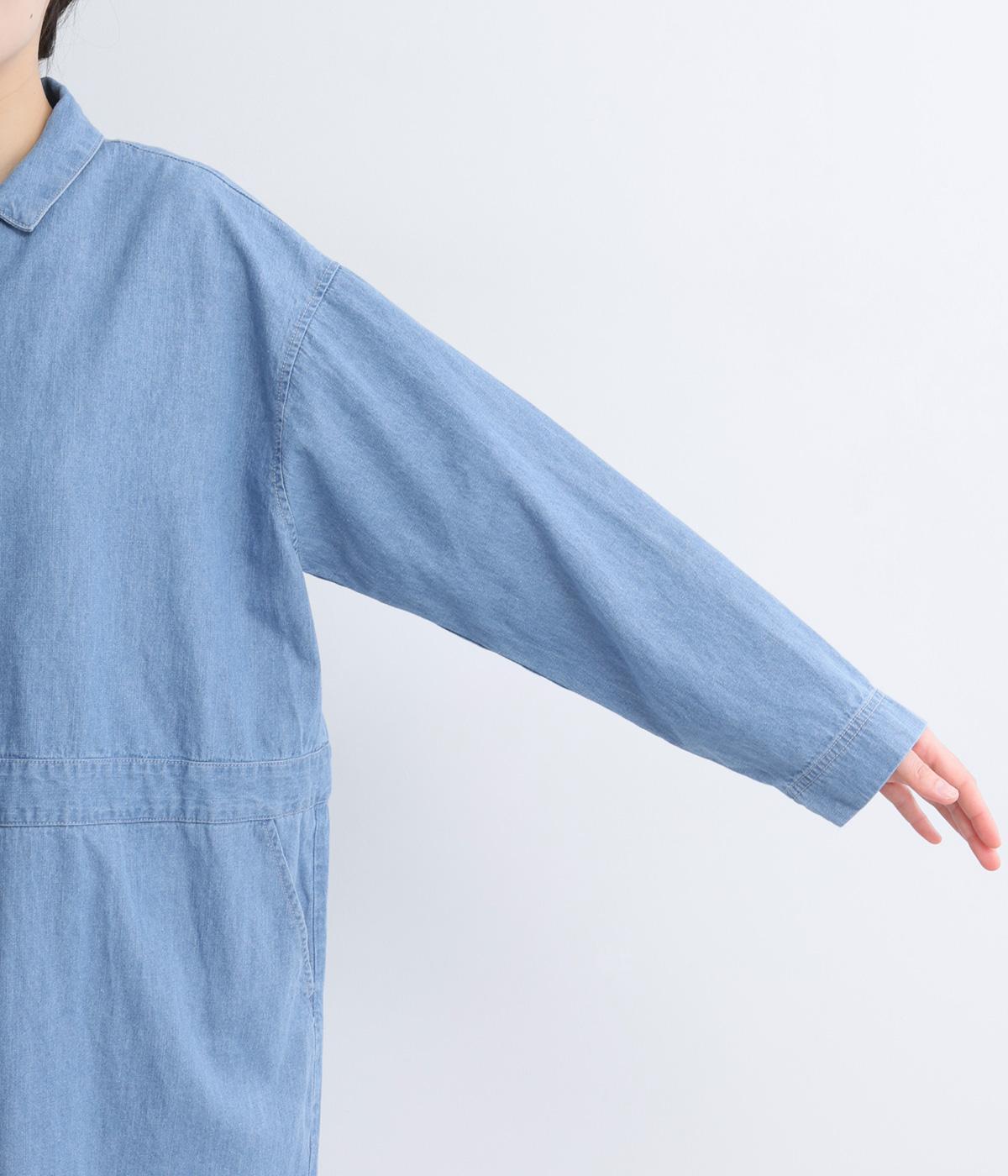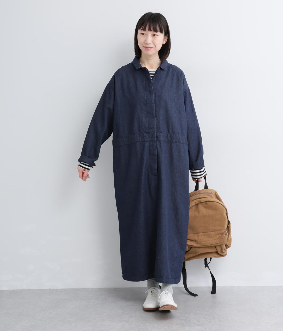 ウエストラインのベルト切り替えやヒップポケットでカジュアルに仕立てたワンピース。すっきりとしたシンプルなデザインが好印象で、比翼ボタンをあけて羽織ったレイヤードスタイルもおすすめ。袖口はラフに折り返しても◎。