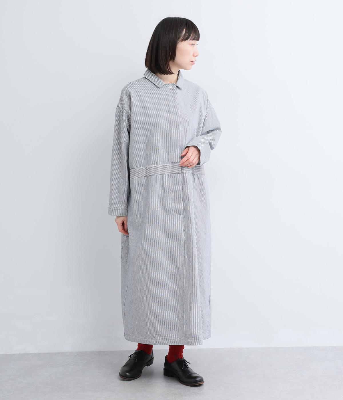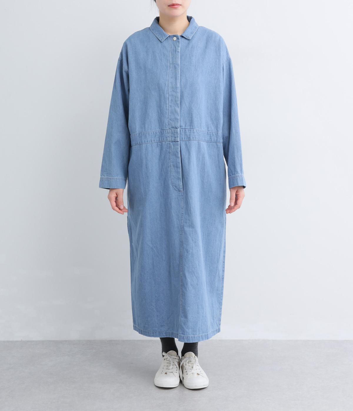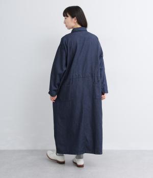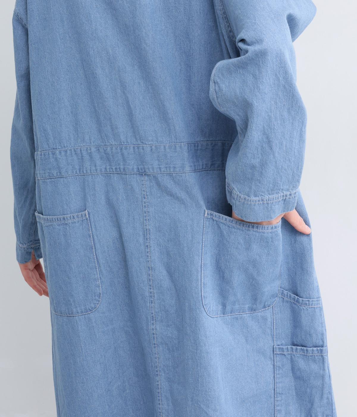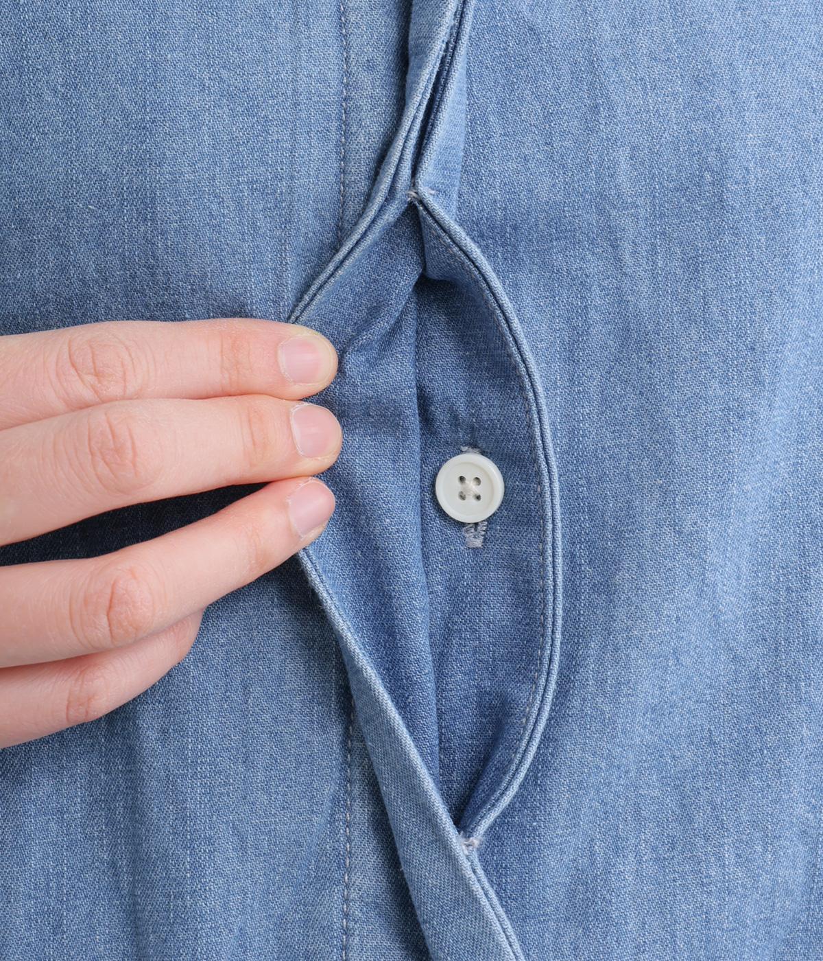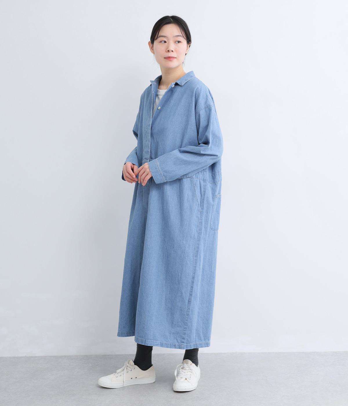 ウエストラインのベルト切り替えやヒップポケットでカジュアルに仕立てたワンピース。すっきりとしたシンプルなデザインが好印象で、比翼ボタンをあけて羽織ったレイヤードスタイルもおすすめ。袖口はラフに折り返しても◎。