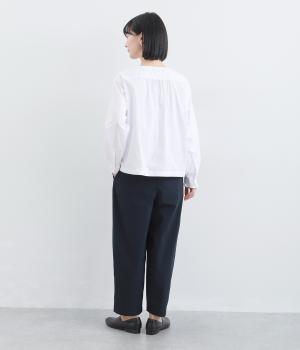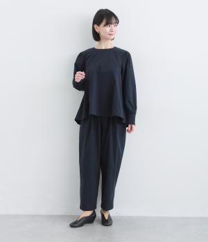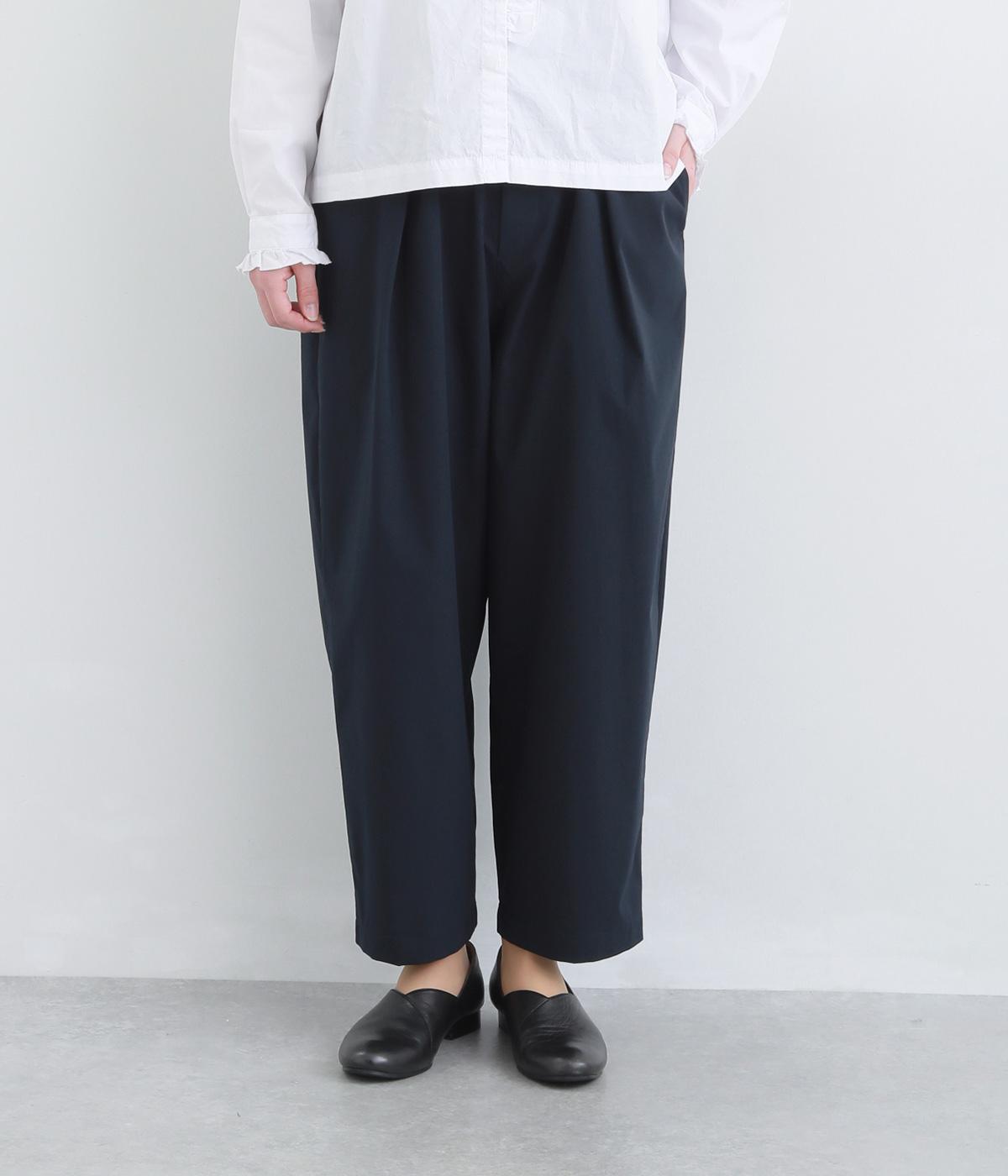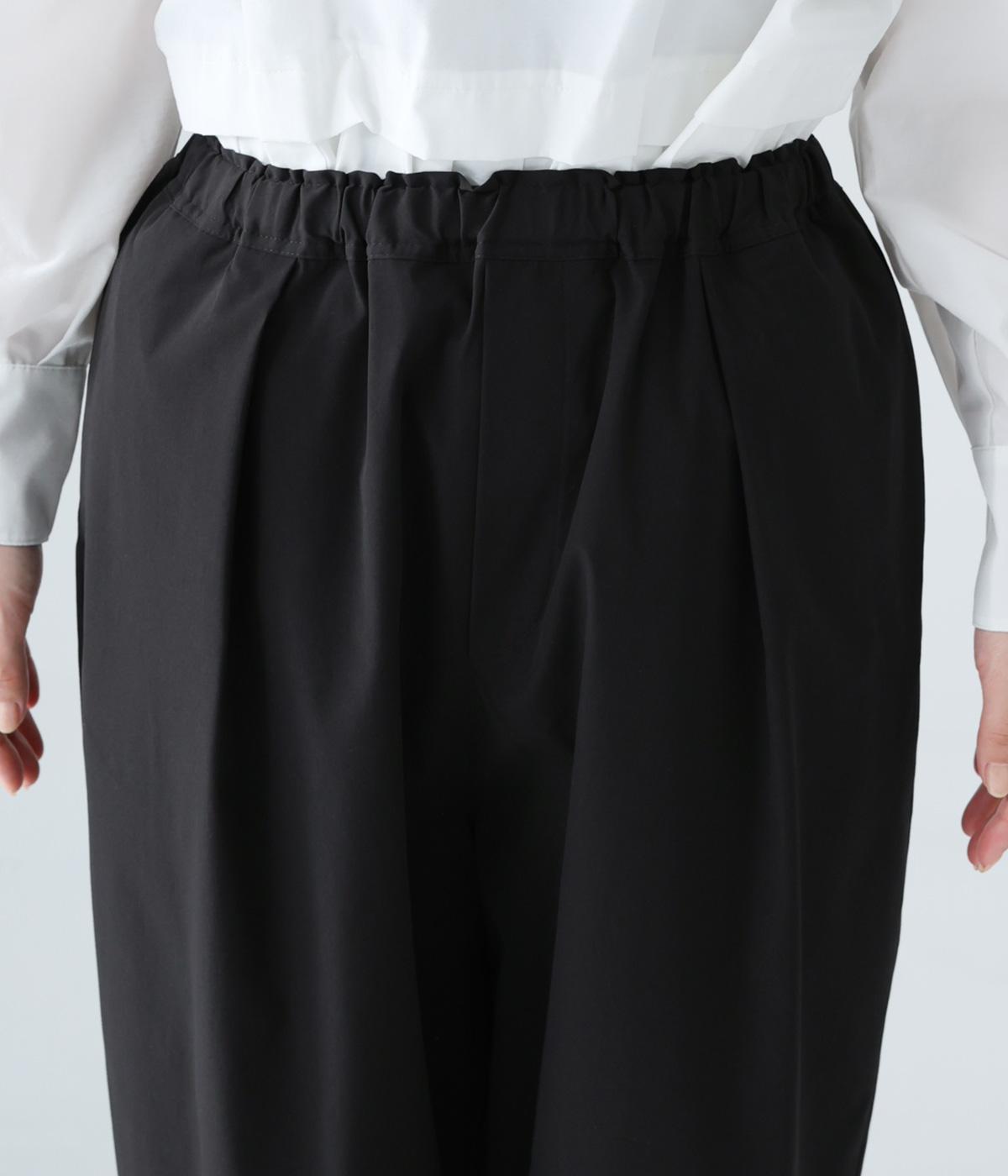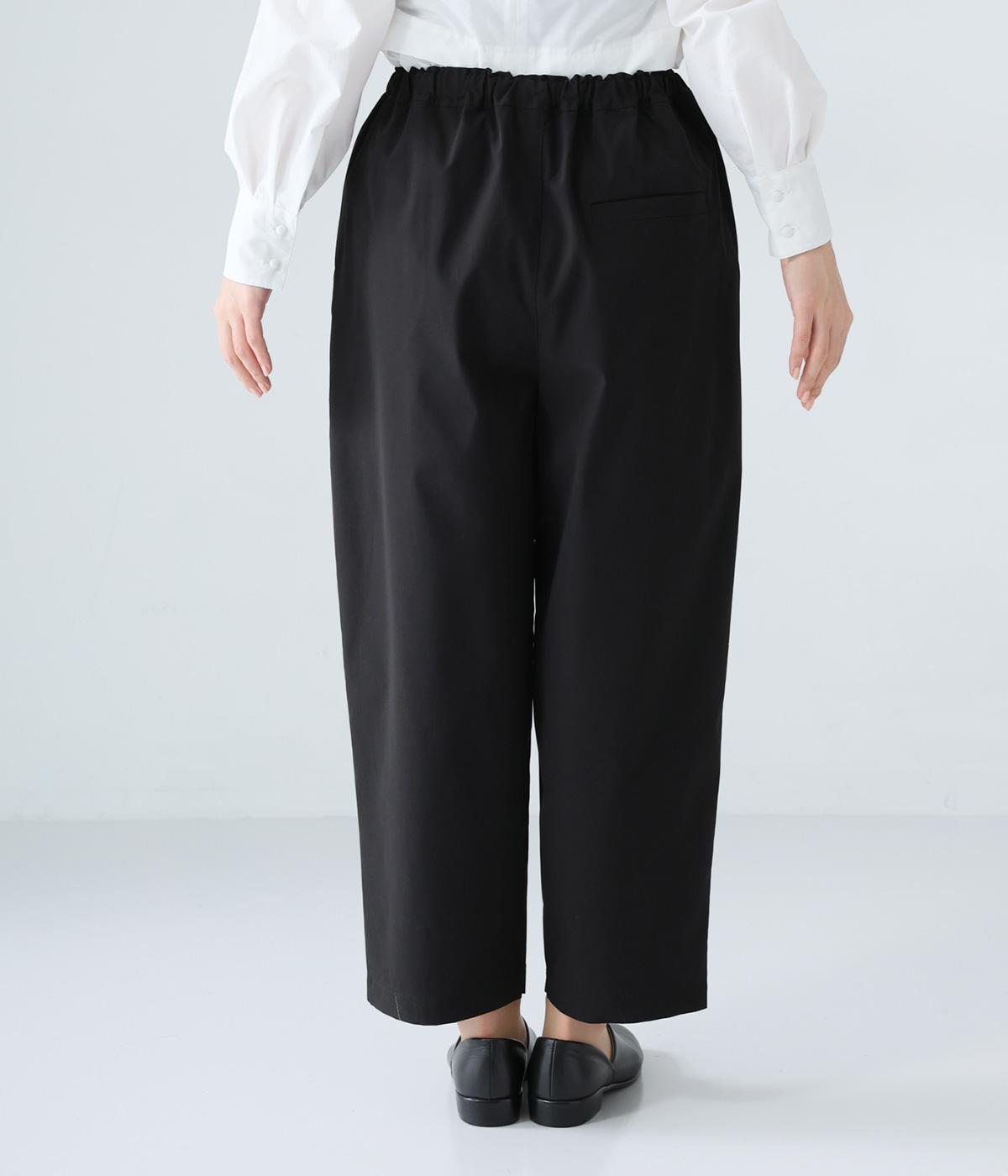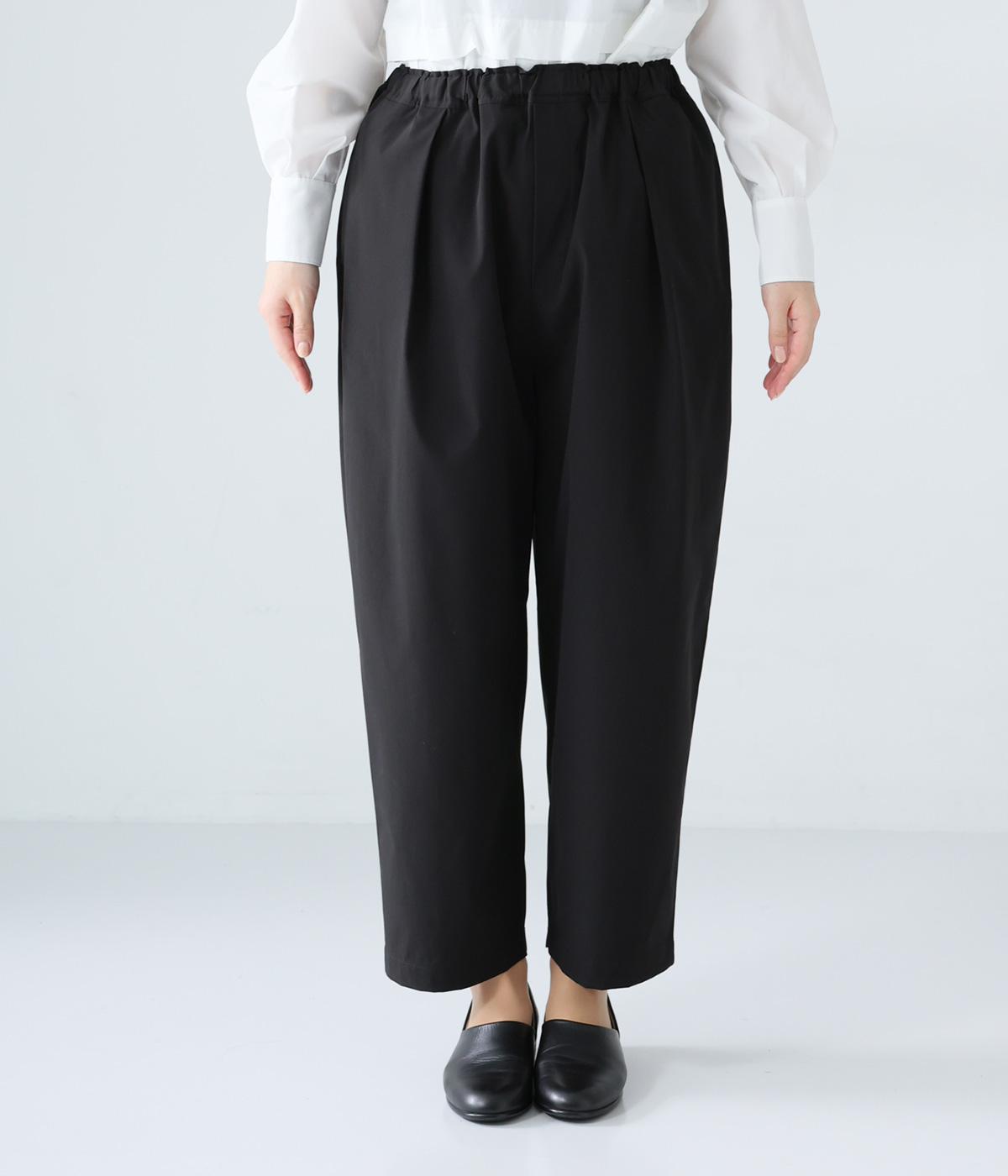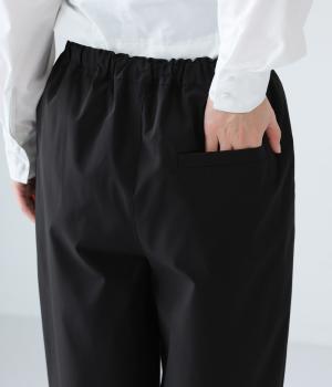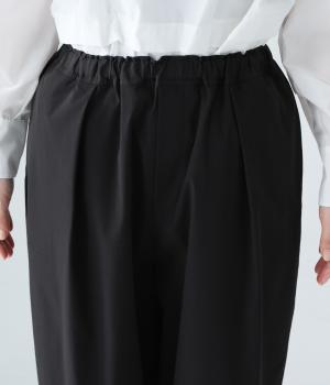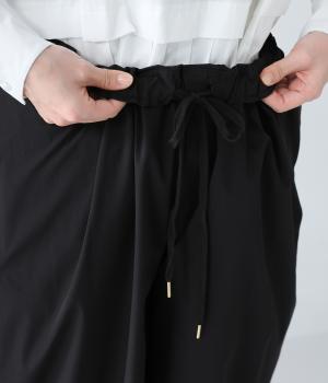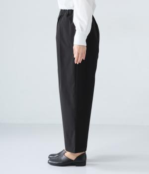 足元に抜け感を与え、全体をすっきりとした印象に仕上げるテーパードパンツ。前ウエストにタックを入れて、気になる太ももをカバーする立体的なシルエットを表現しました。ウエストは総ゴム仕様で楽なはき心地に。内側の紐を絞ればフィット感を調整できます。