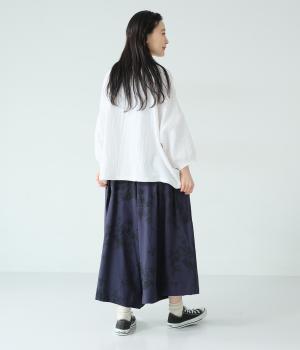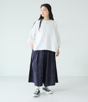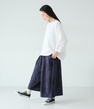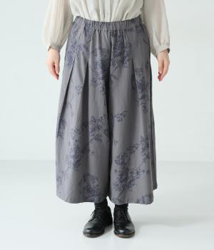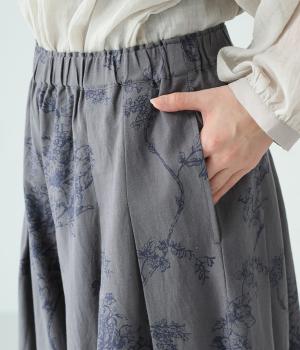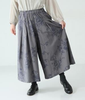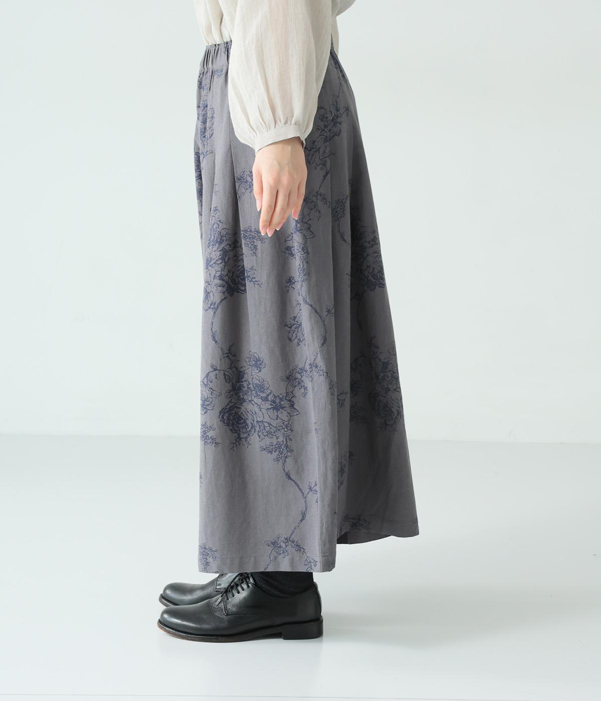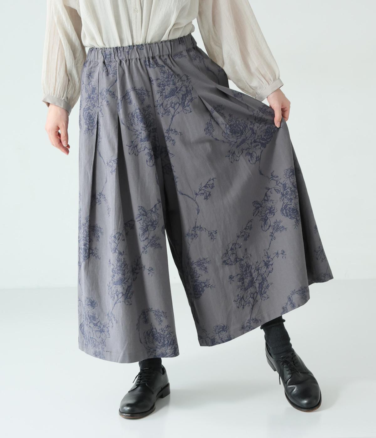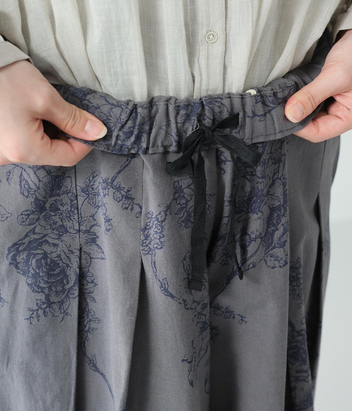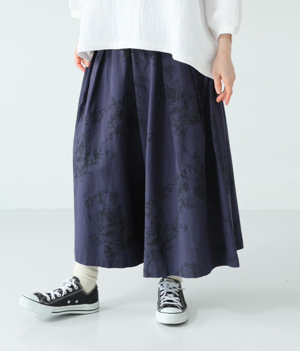 落ち着いた華やかさをまとう花柄が大人な表情をつくり、たっぷりとした生地感が華やぎを引き立てます。シンプルなトップスと合わせるだけで装いが決まります。ウエストはゴム仕様で、紐によるサイズ調節が可能です。
