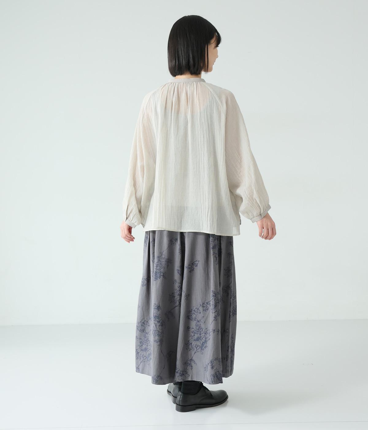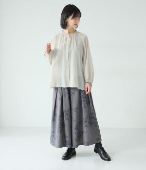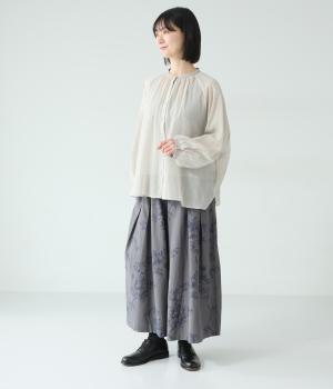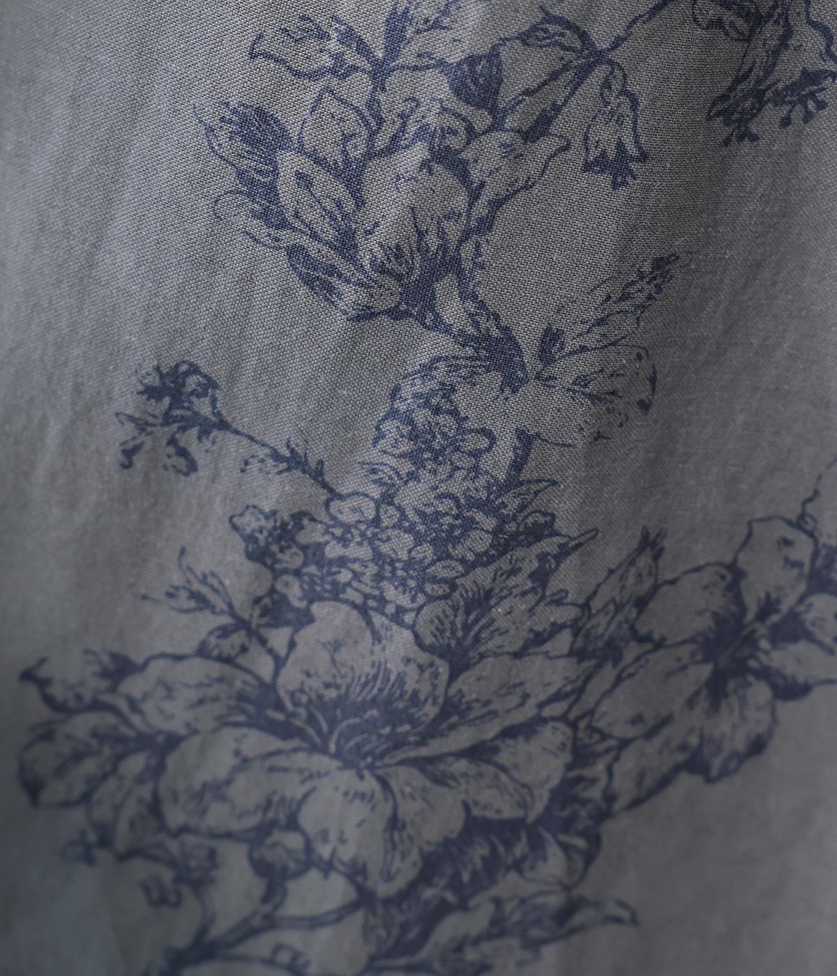 レーヨンにリネンをミックスした、しなやかで落ち感のある生地です。ナチュラルな風合いで、やわらかな手ざわりです。レトロ感のある落ち着いた花柄プリントをほどこしました。