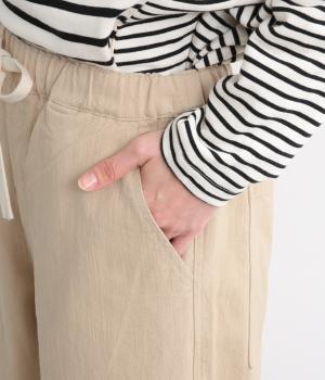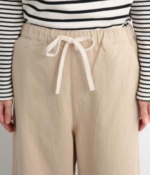 はき心地のいいゆったりさとすっきり見えを両立させたワイドストレートパンツ。足元を軽やかに見せてくれる9分丈で、軽くロールアップさせて裏の別生地をのぞかせても◎。フィット感のいい総ゴムで、アウト紐がポイントに。