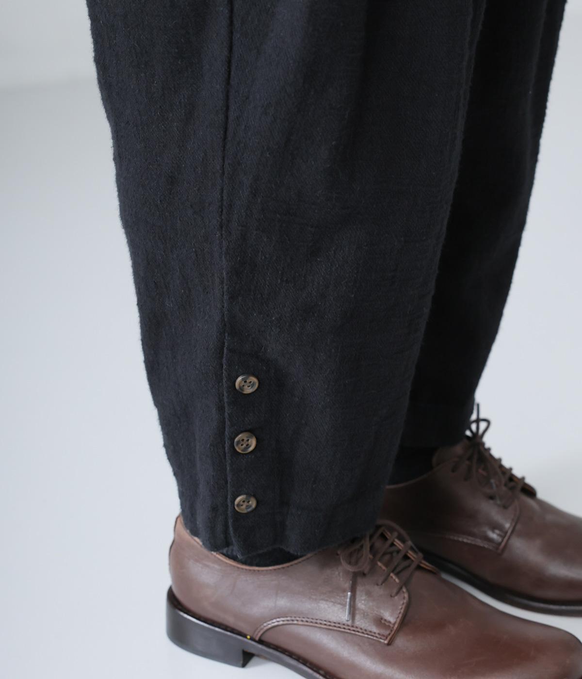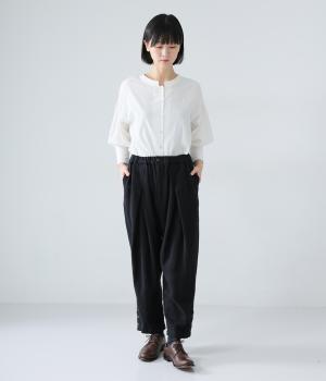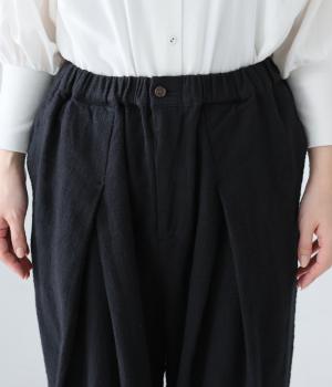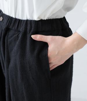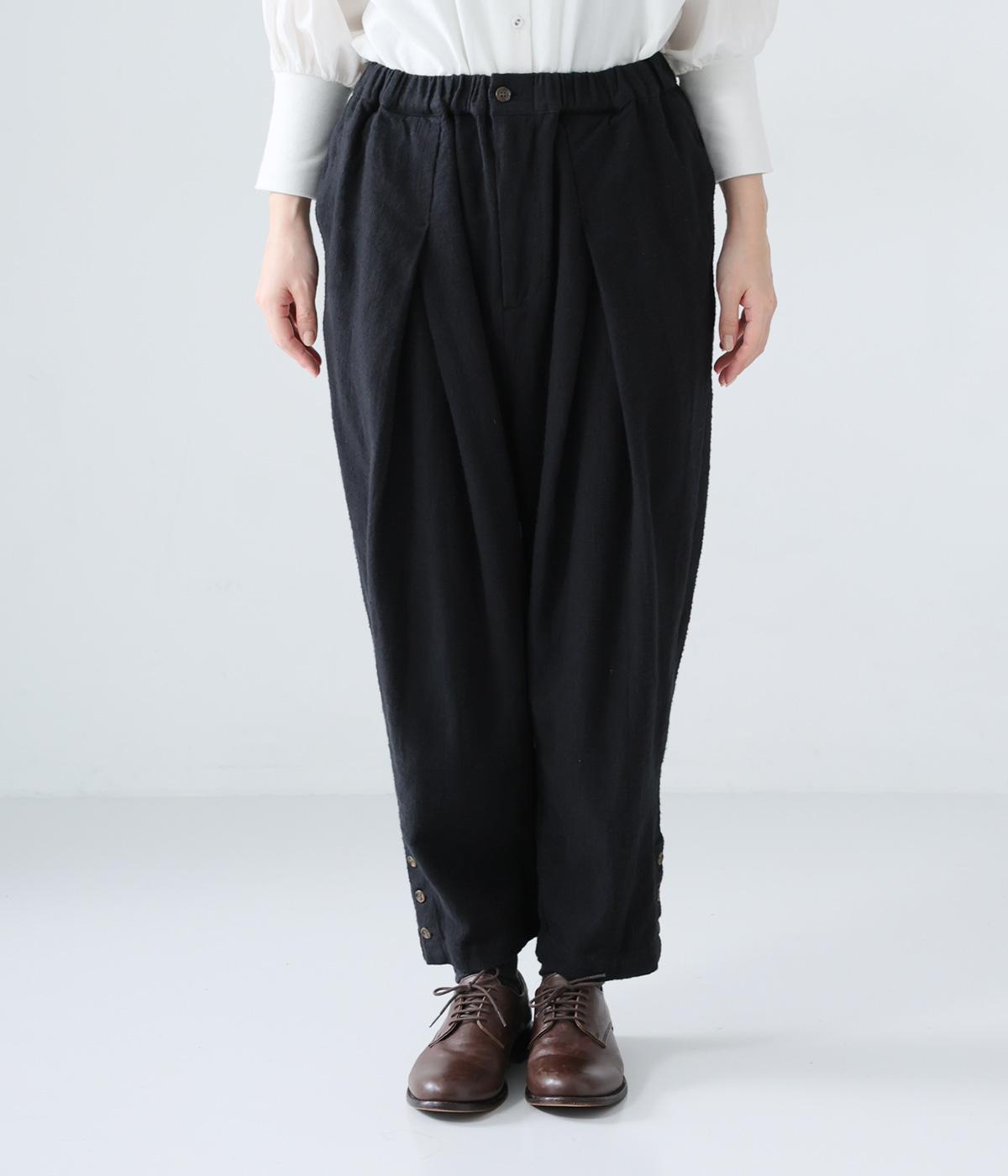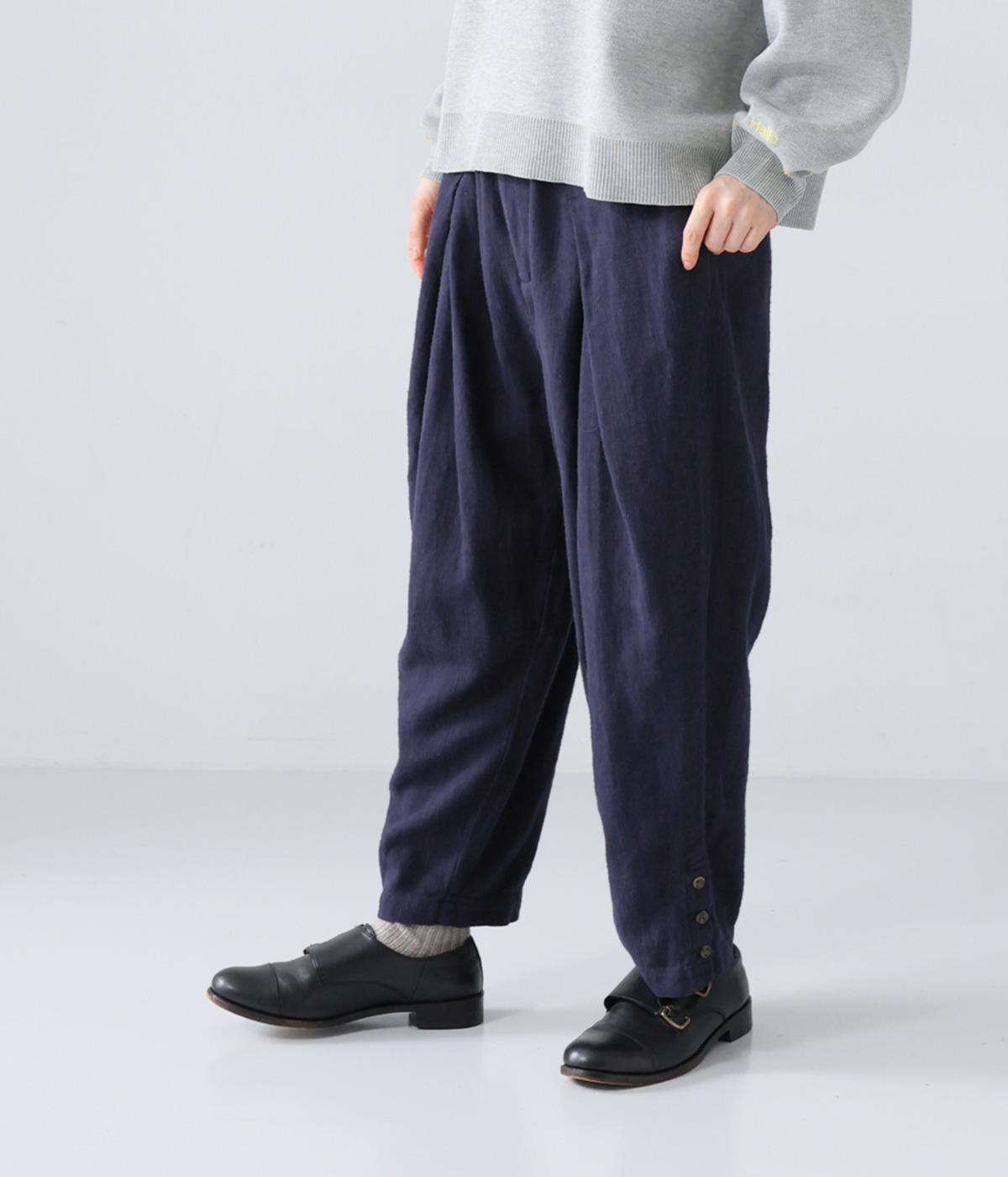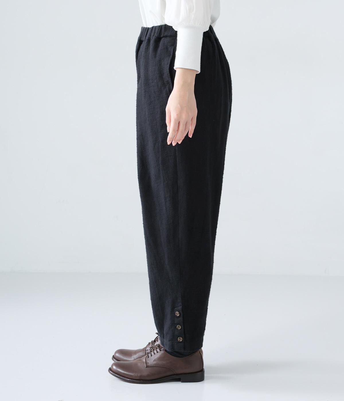 裾に向かって細くなるシルエットがすっきり見えを叶えるテーパードパンツ。前の深いタックが生地に動きをプラスし、気になる腰まわりをカバーしてくれます。裾のボタン開きがアクセントに。ウエストは総ゴム仕様で、前にファスナーをつけています。