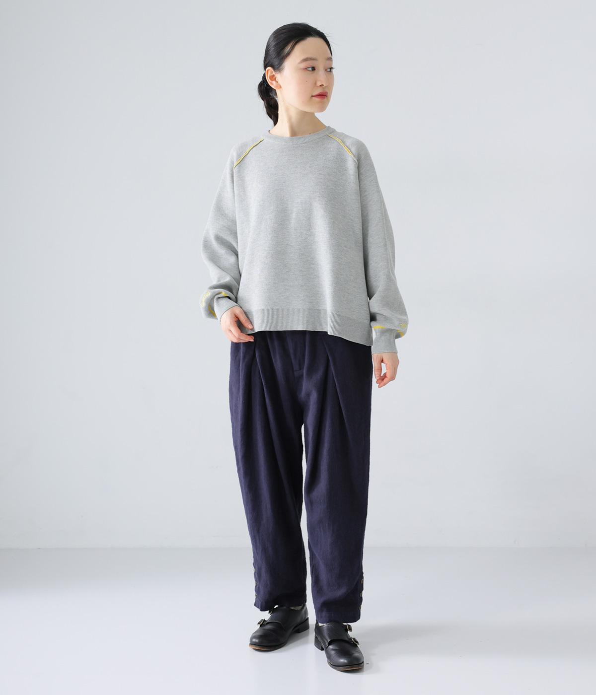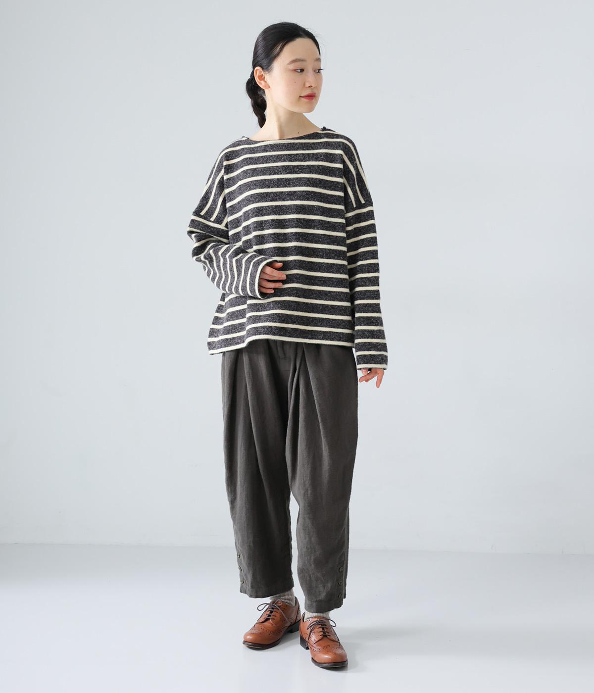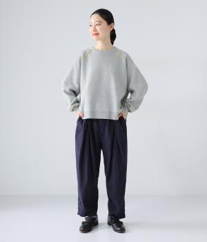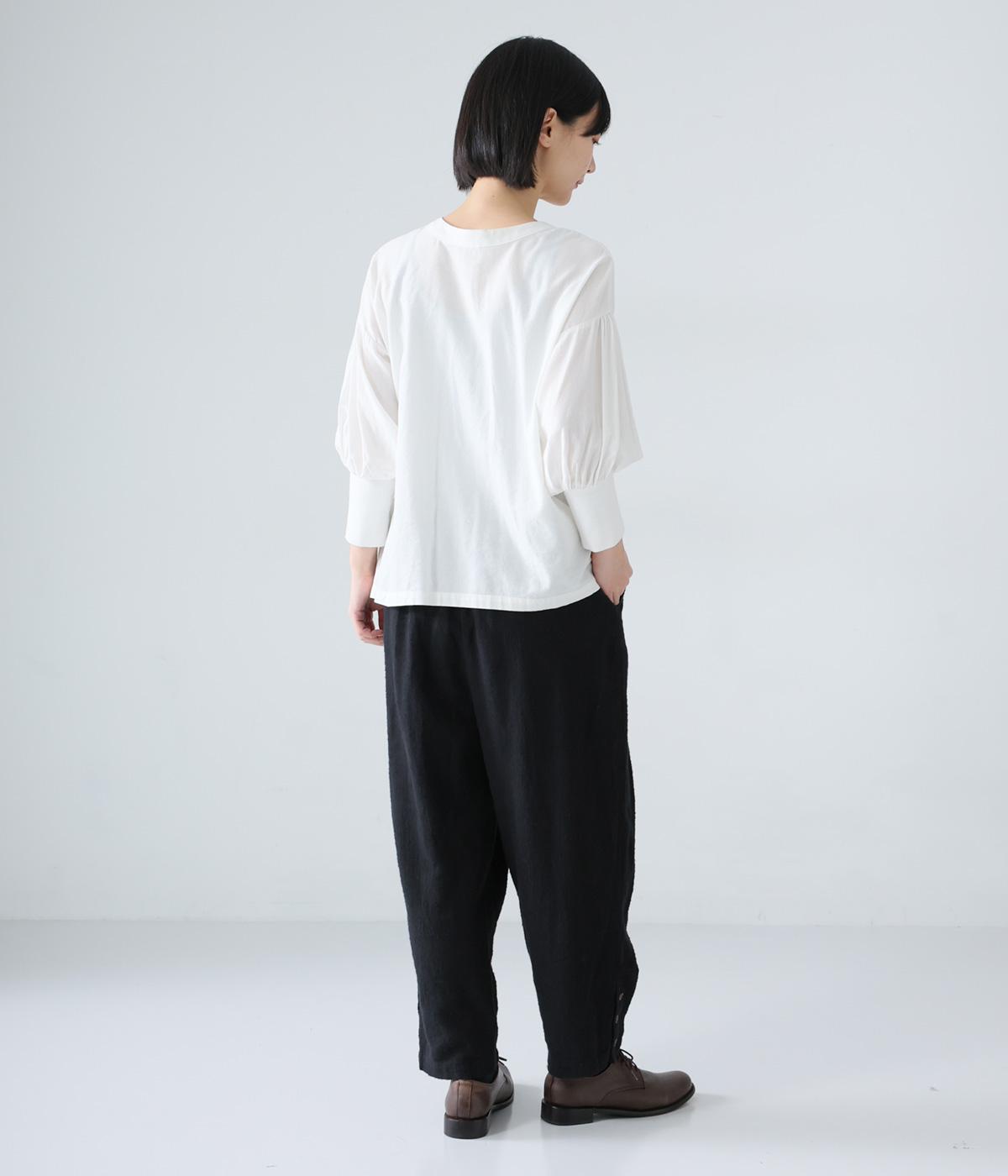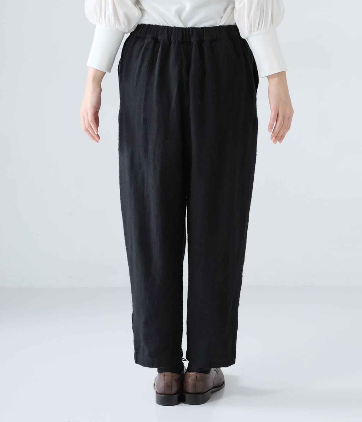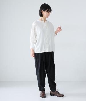 裾に向かって細くなるシルエットがすっきり見えを叶えるテーパードパンツ。前の深いタックが生地に動きをプラスし、気になる腰まわりをカバーしてくれます。裾のボタン開きがアクセントに。ウエストは総ゴム仕様で、前にファスナーをつけています。