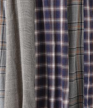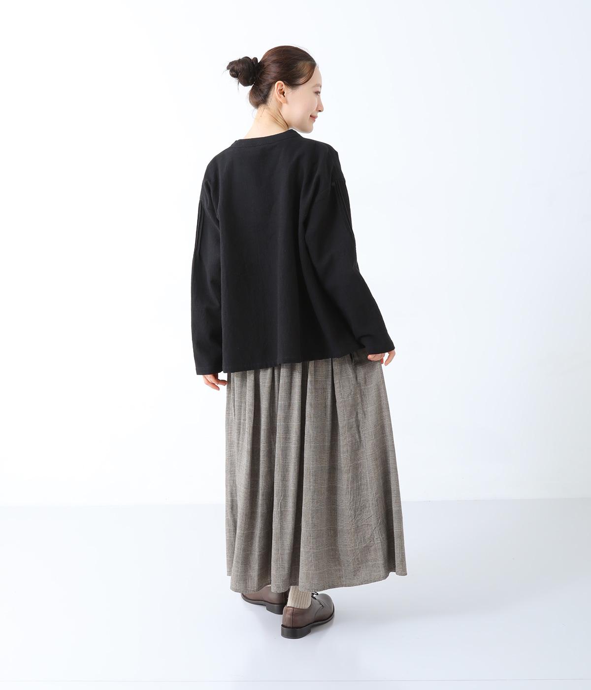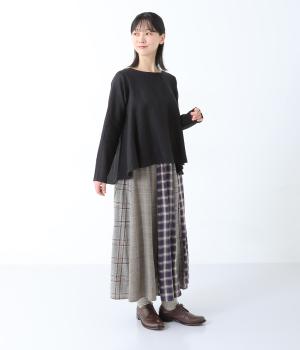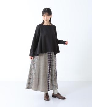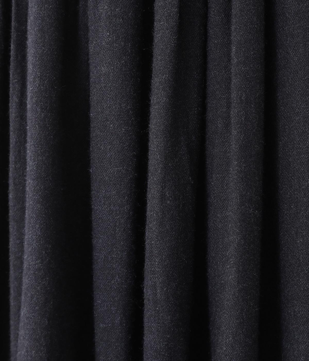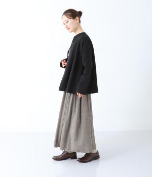 薄手ながらもほんのりとした起毛感があたたかみを感じさせるレーヨンウール生地。広がりをおさえ、すっきりとしたシルエットを表現するしなやかな落ち感があります。