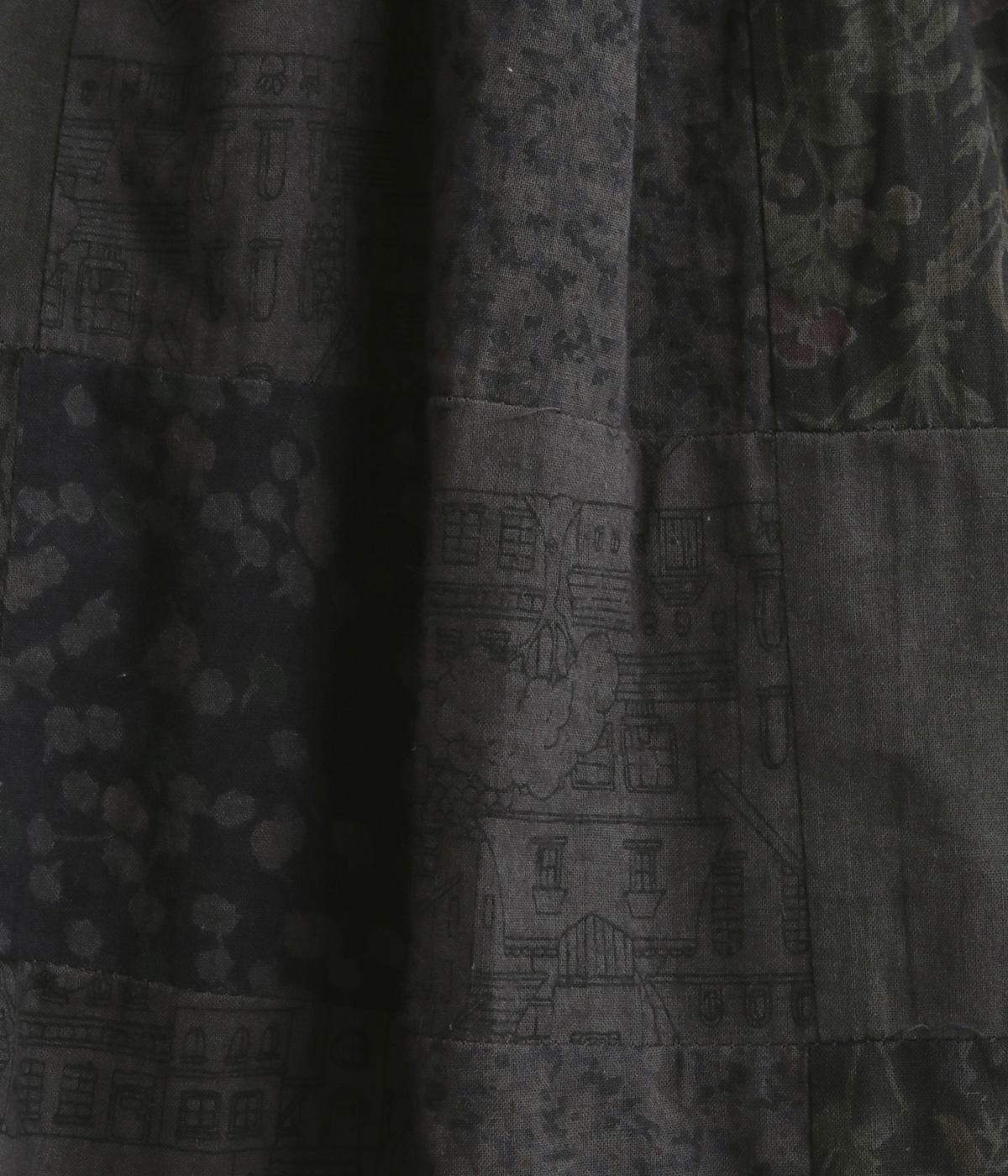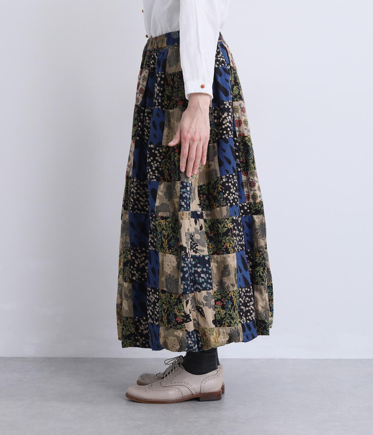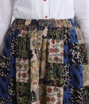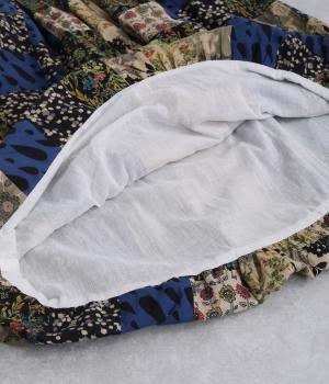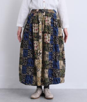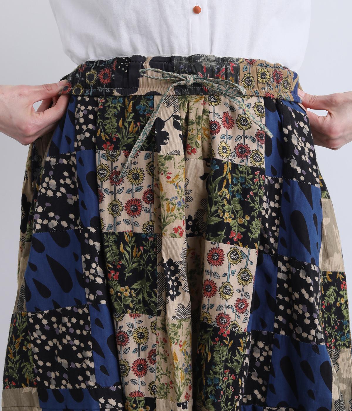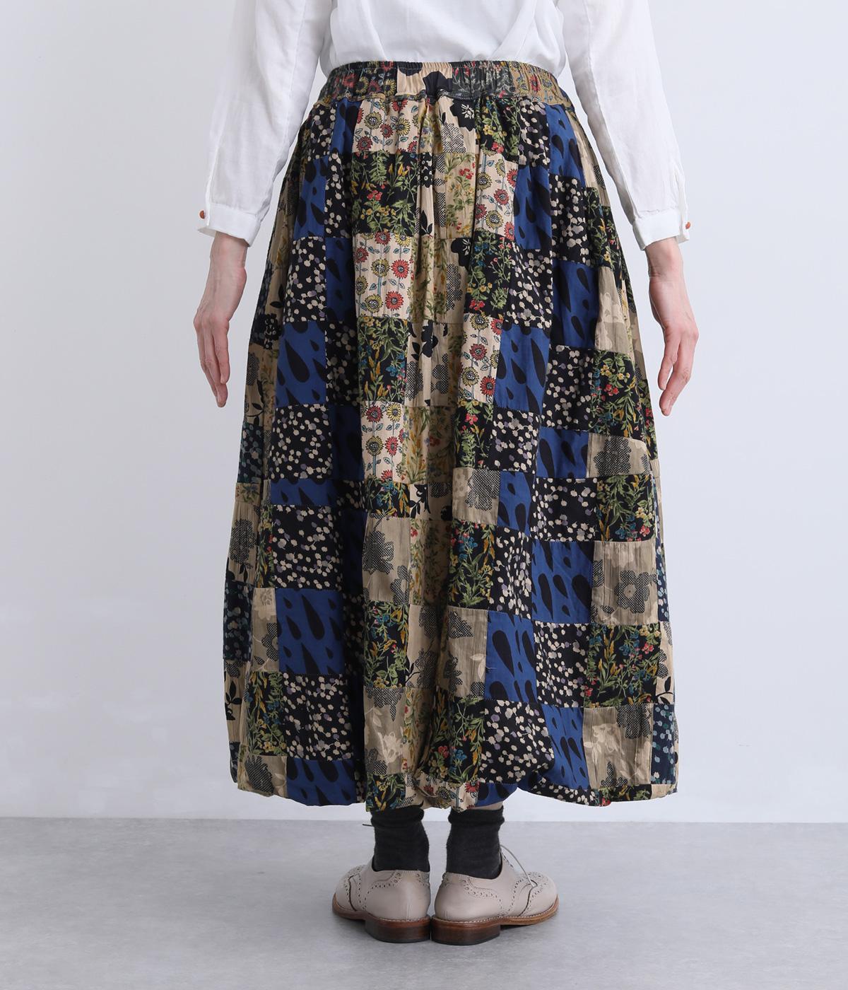 さまざまな柄生地を組み合わせたパッチワークデザインがノスタルジックな雰囲気を運びます。裏布をつけたバルーン仕立てでシルエットもふっくらとやわらかく。ウエストオールゴム&調整紐入りのイージー仕様。