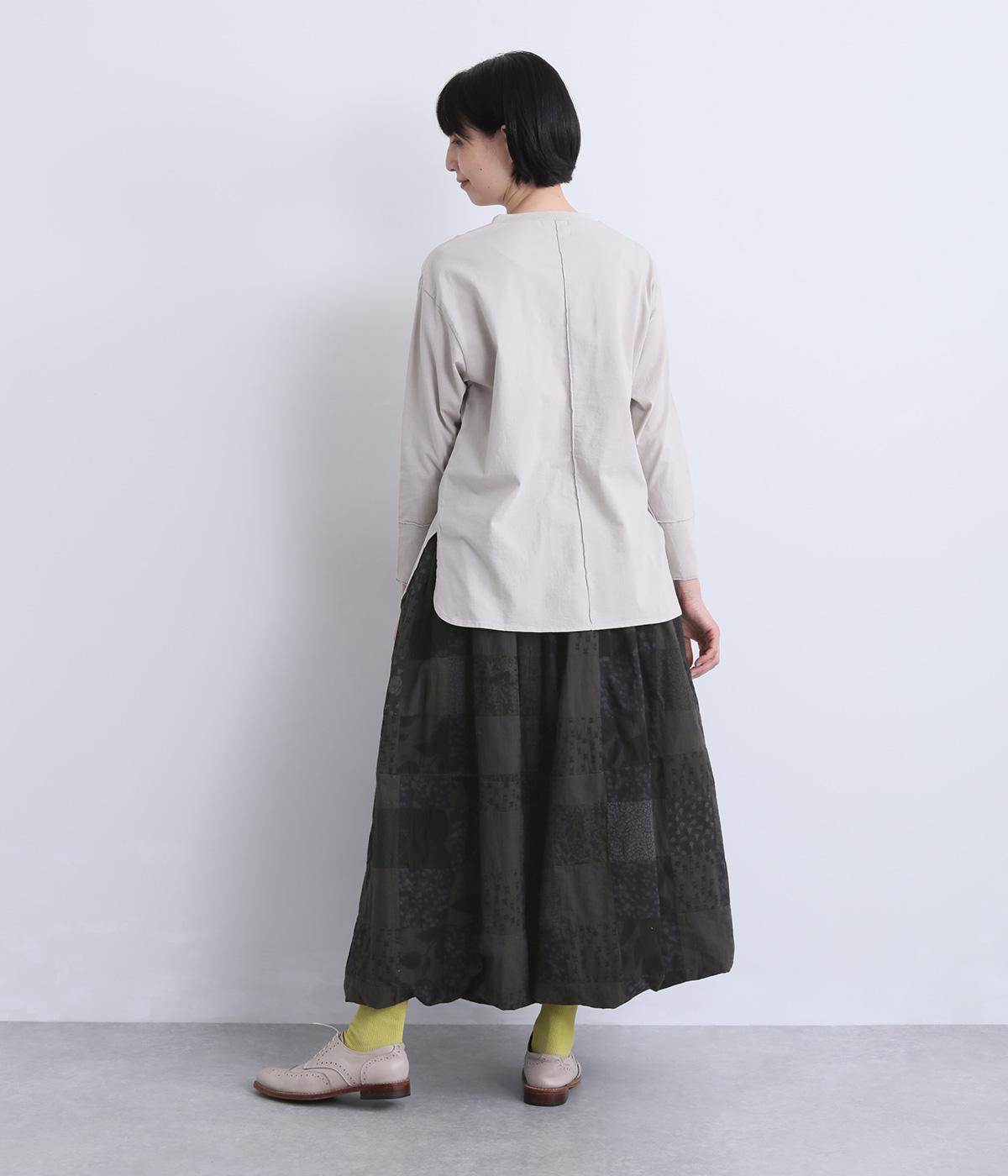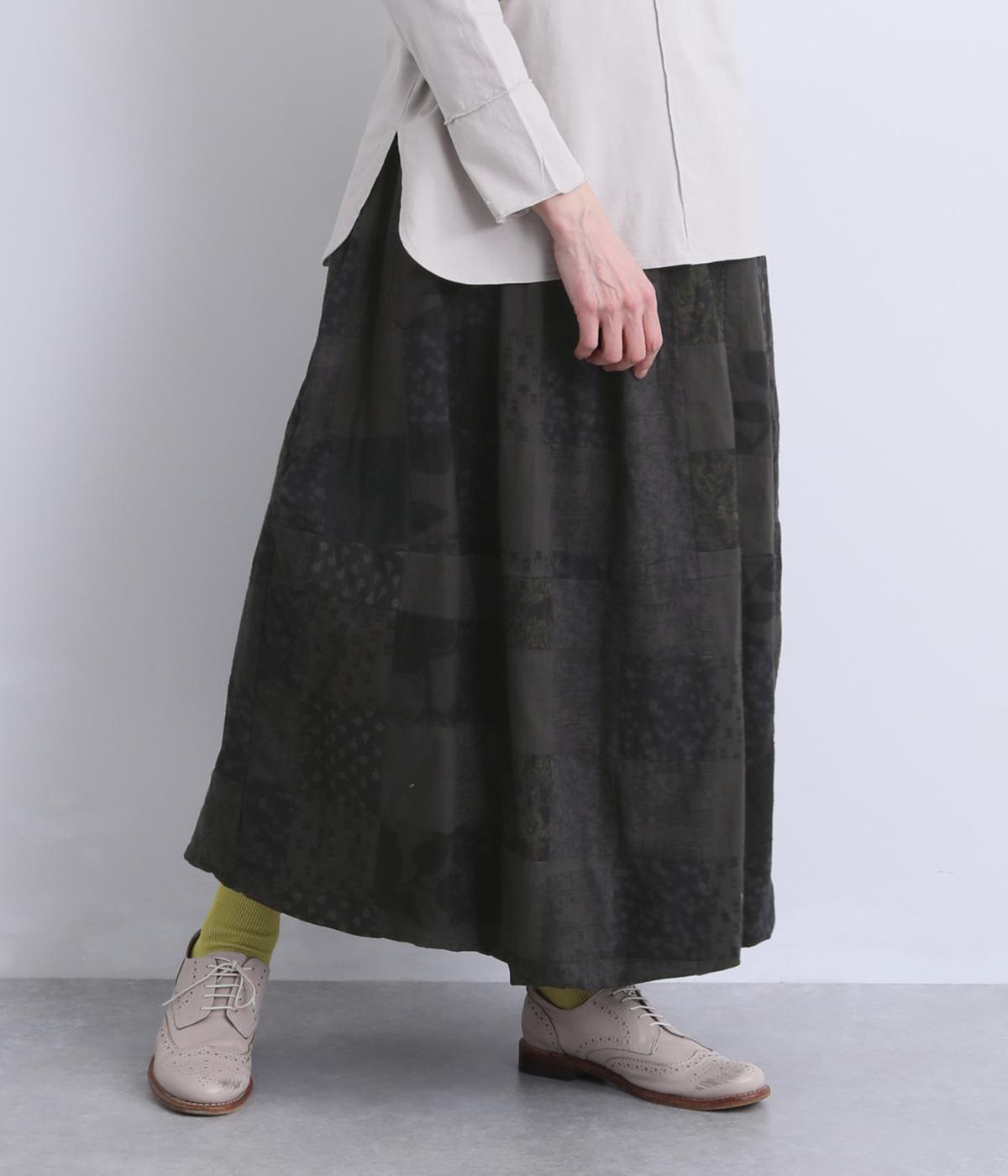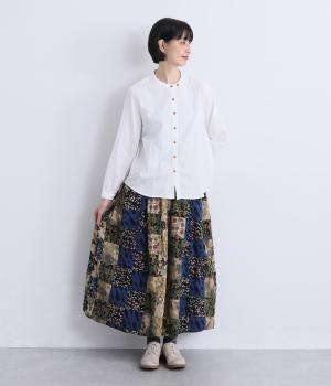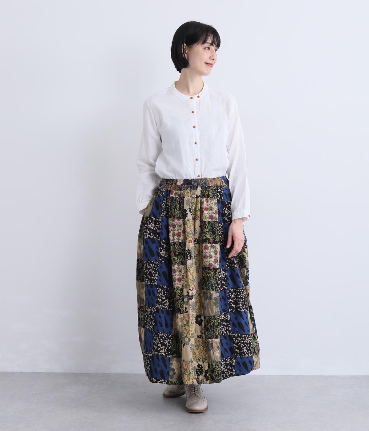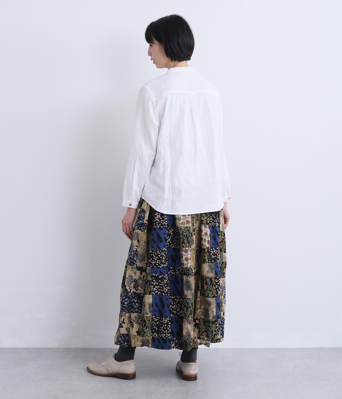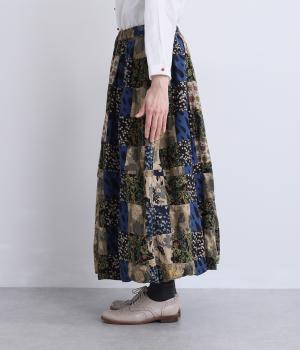 さまざまな柄生地を組み合わせたパッチワークデザインがノスタルジックな雰囲気を運びます。裏布をつけたバルーン仕立てでシルエットもふっくらとやわらかく。ウエストオールゴム&調整紐入りのイージー仕様。