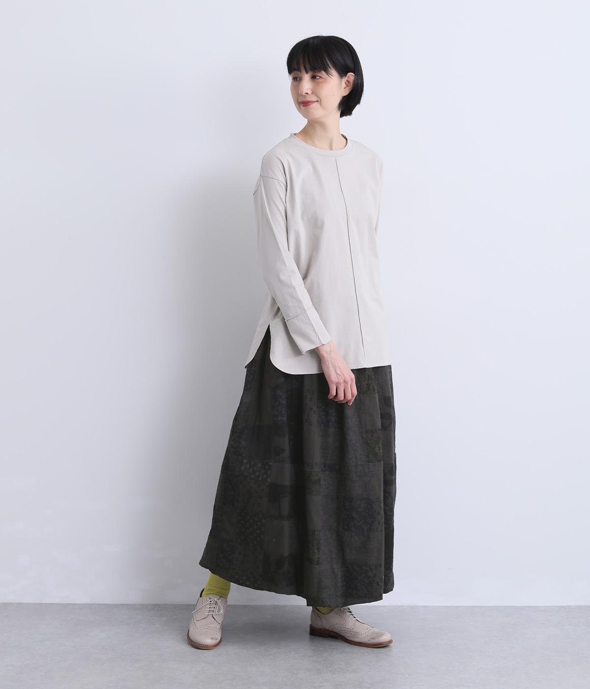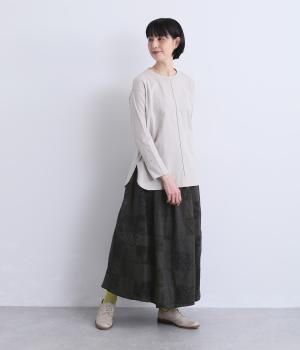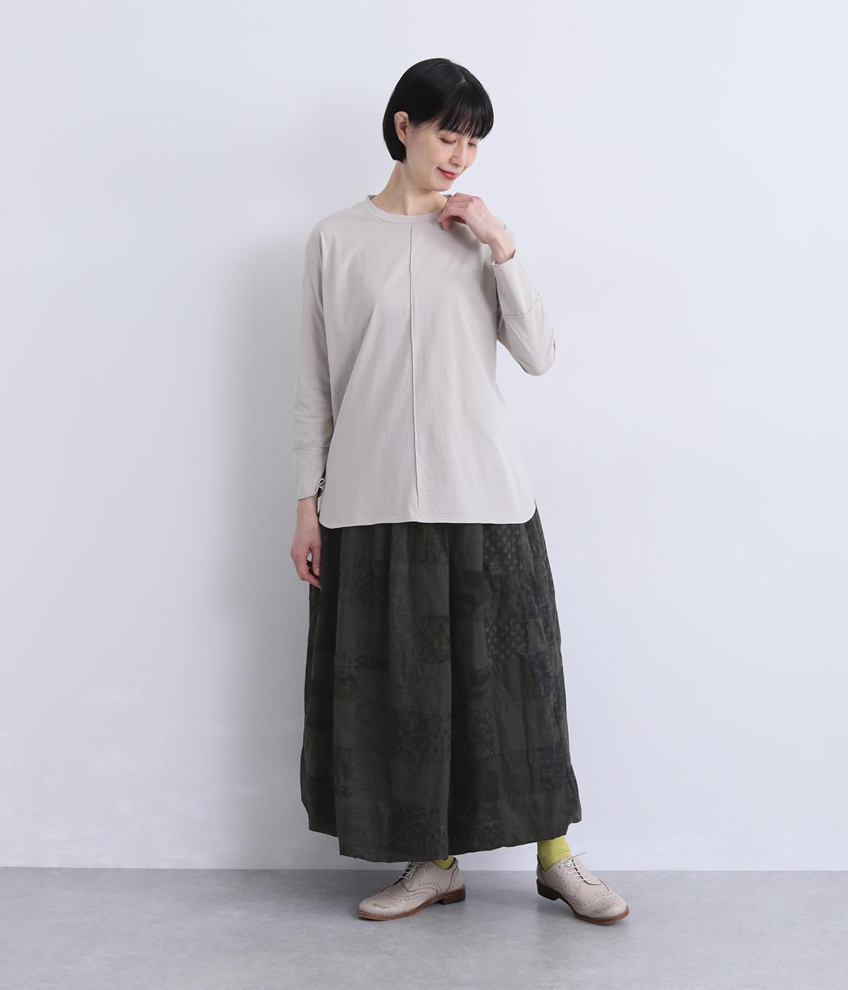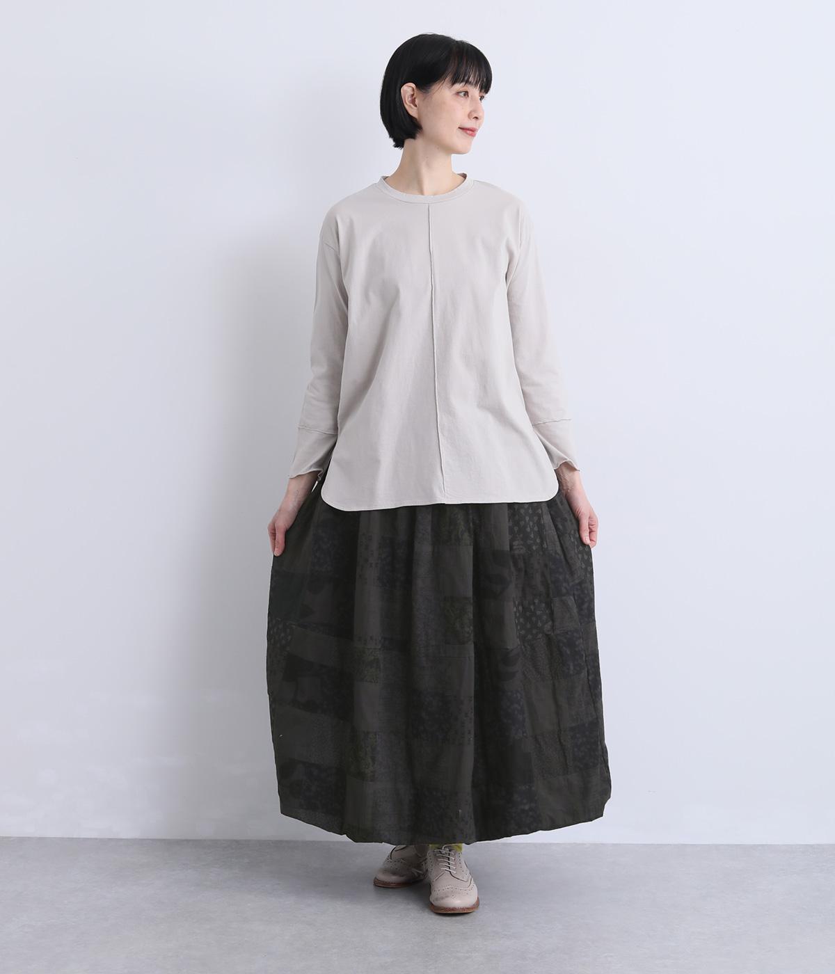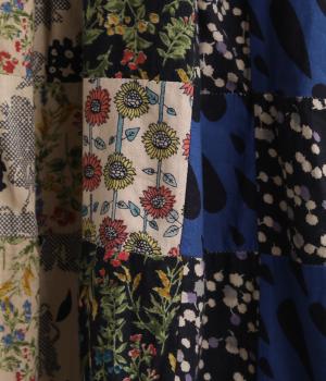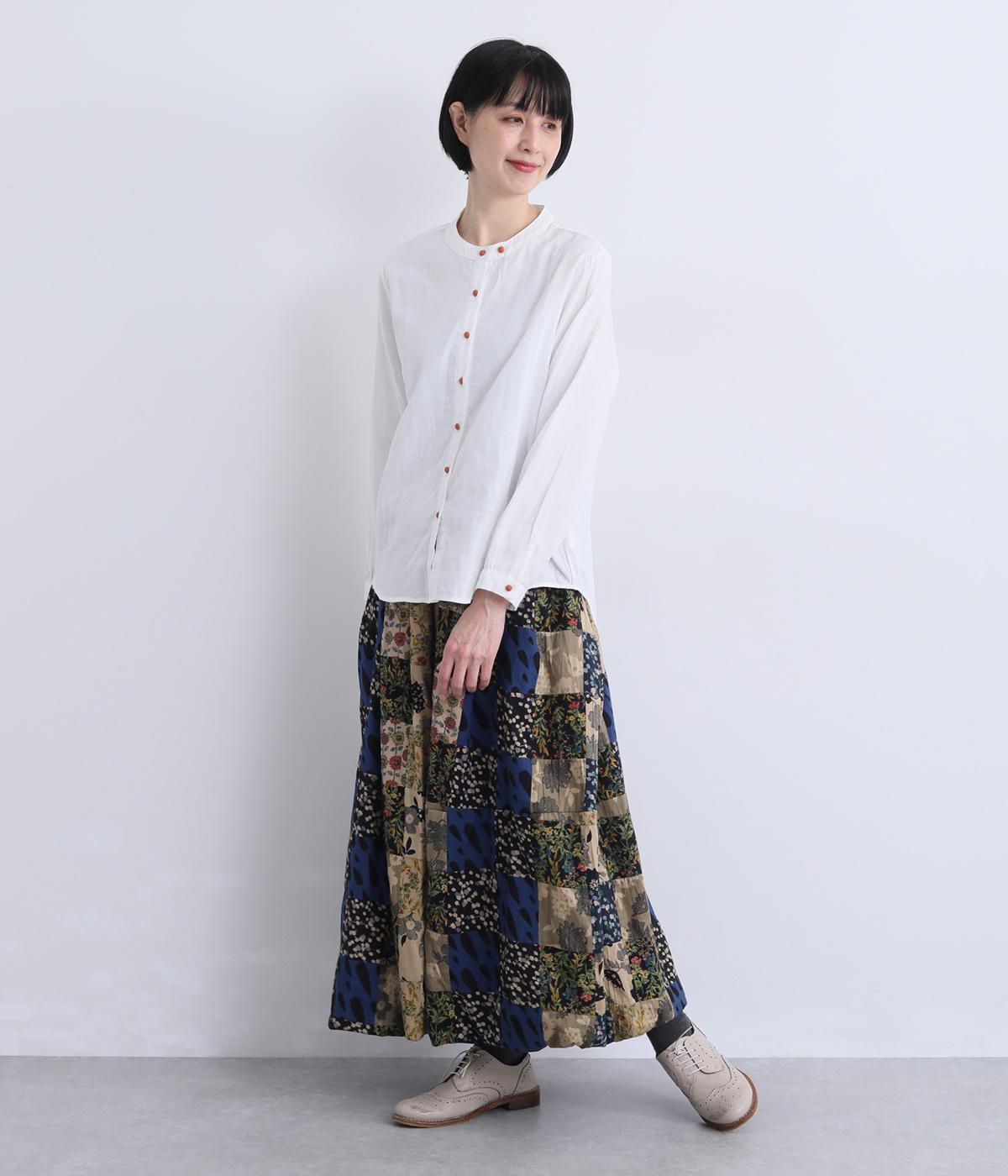 さまざまな柄生地を組み合わせたパッチワークデザインがノスタルジックな雰囲気を運びます。裏布をつけたバルーン仕立てでシルエットもふっくらとやわらかく。ウエストオールゴム&調整紐入りのイージー仕様。