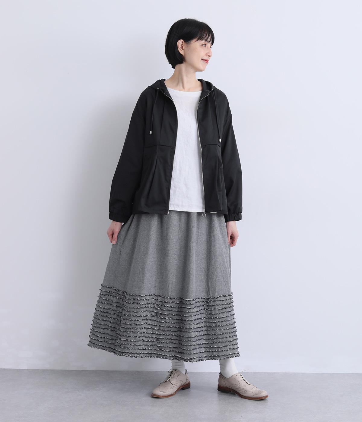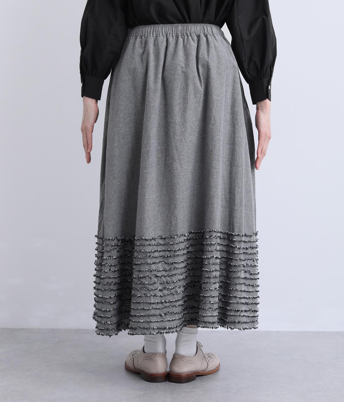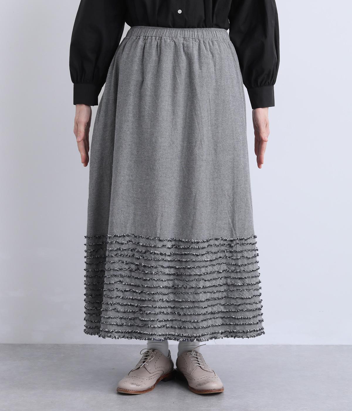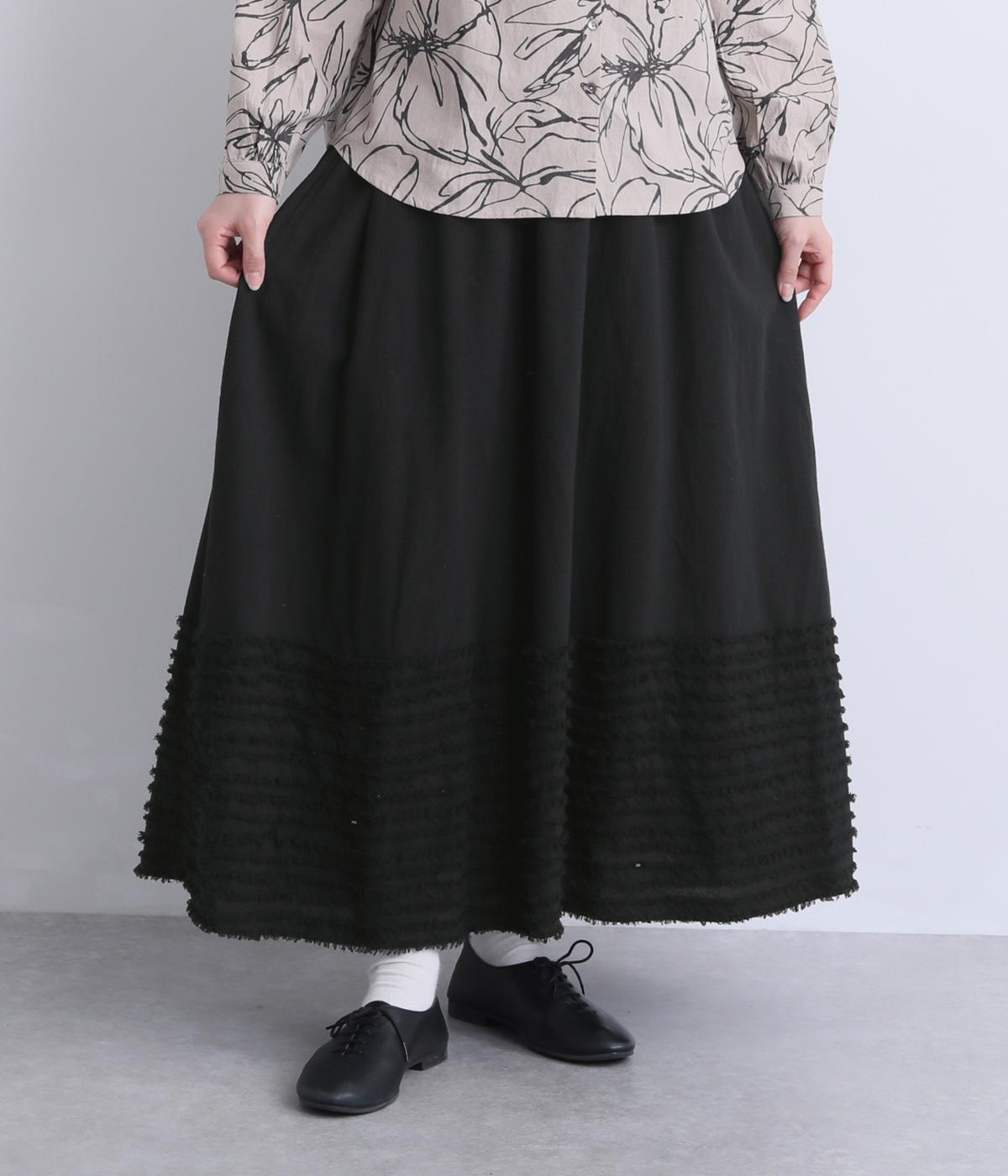 裾にたっぷりと走らせたフリンジラインがデザインポイントのスカート。適度なフレア感とすっきりと見えるロング丈のバランスが良く、大人のナチュラルスタイルになじみます。ウエストは総ゴム&内側に調整紐入りです。