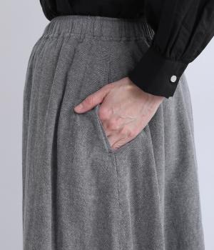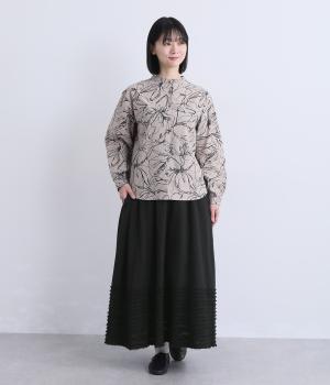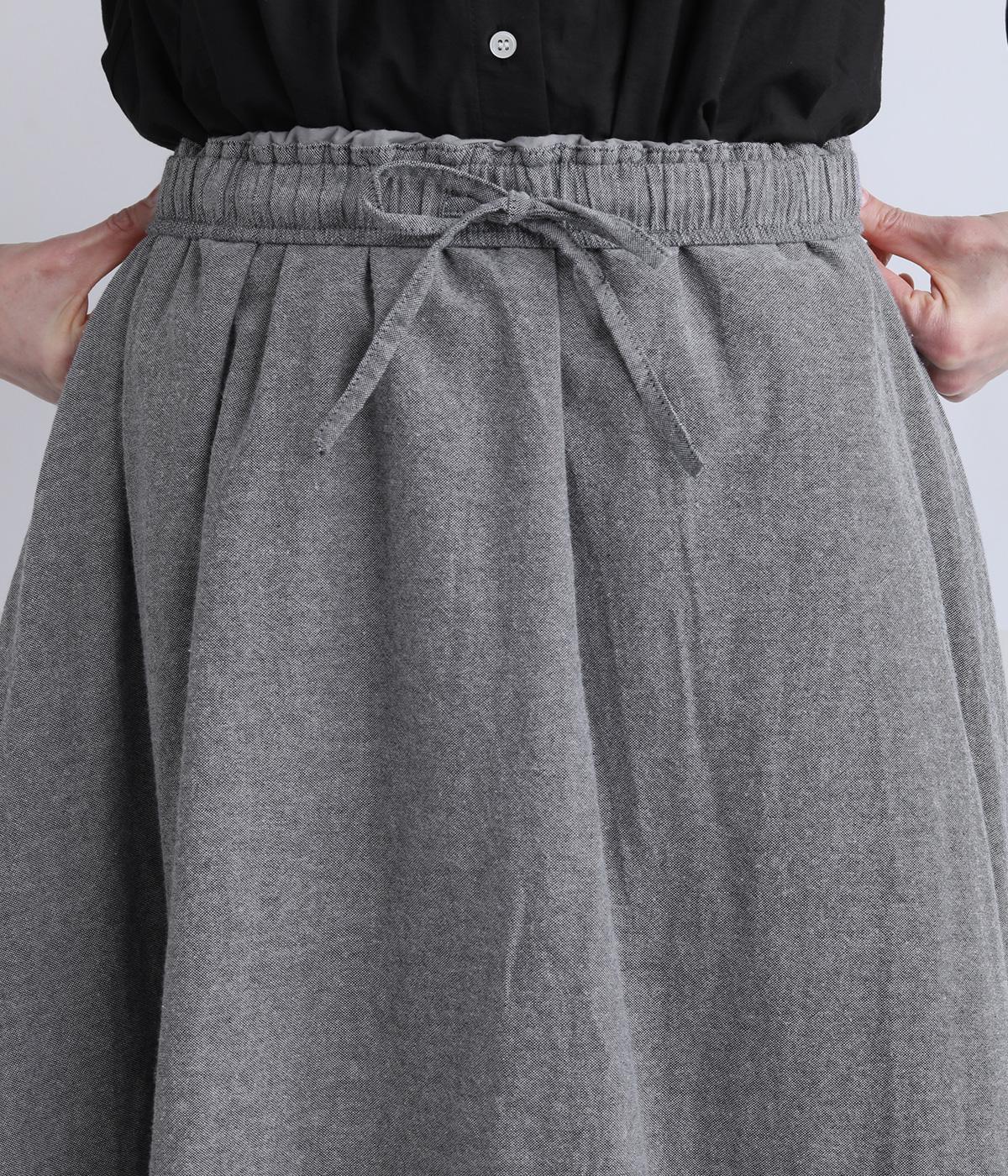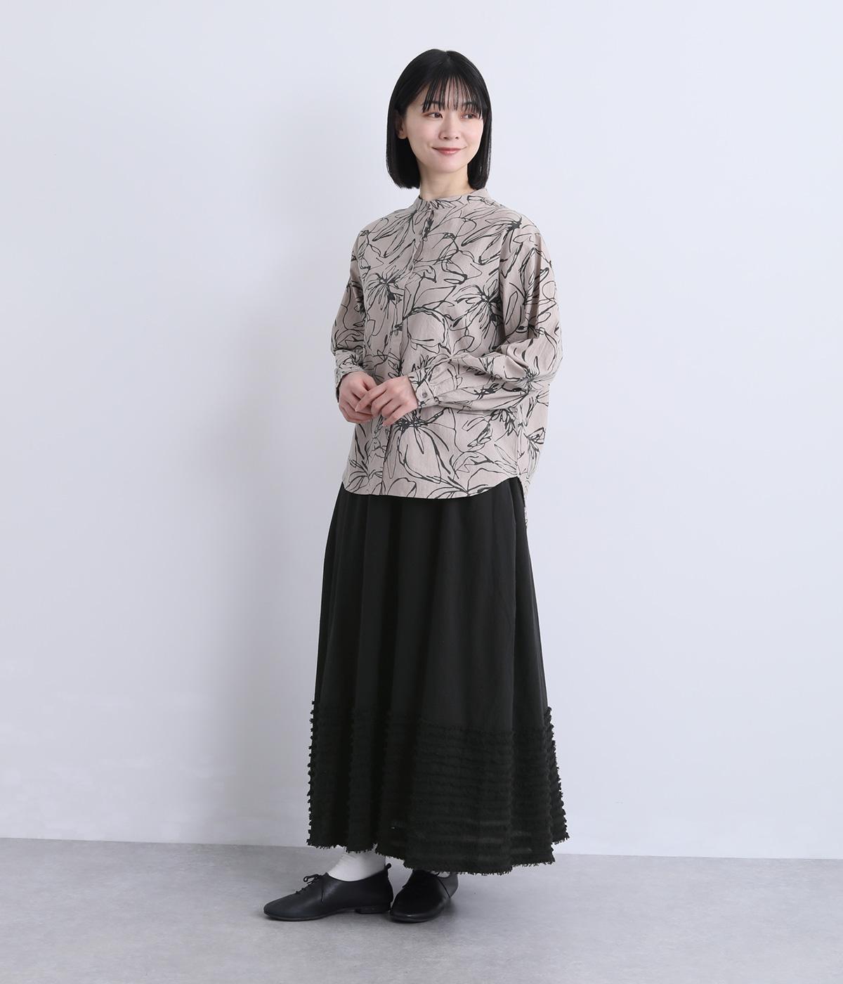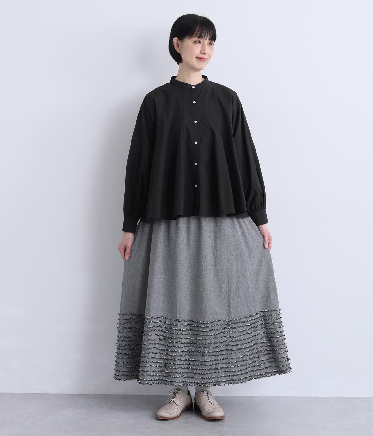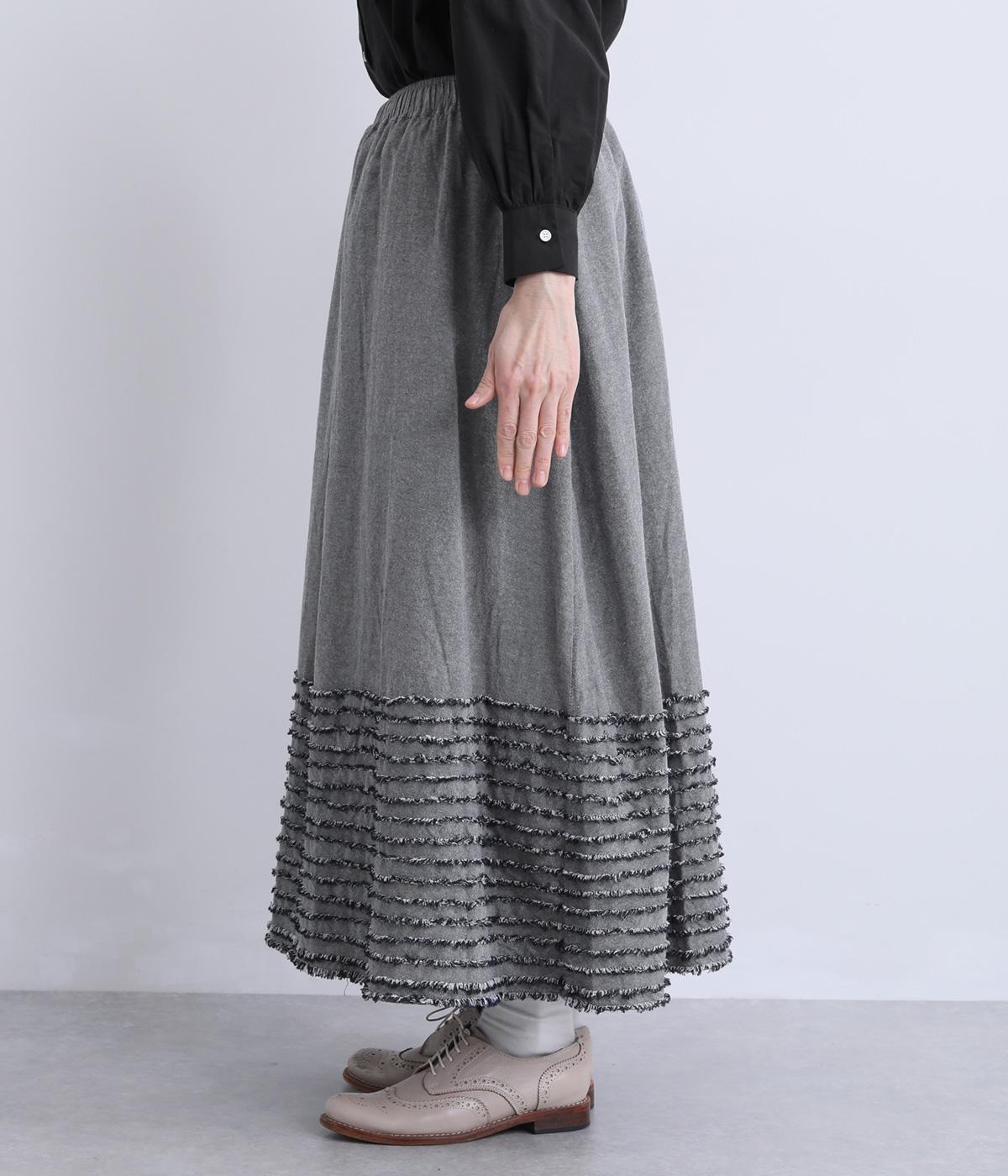 裾にたっぷりと走らせたフリンジラインがデザインポイントのスカート。適度なフレア感とすっきりと見えるロング丈のバランスが良く、大人のナチュラルスタイルになじみます。ウエストは総ゴム&内側に調整紐入りです。
