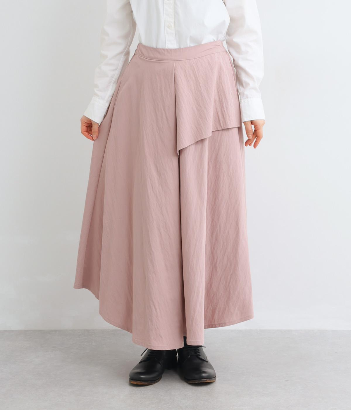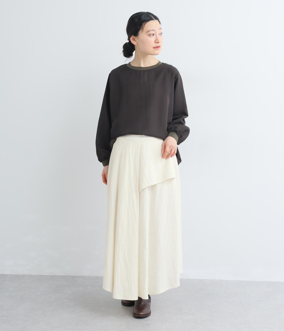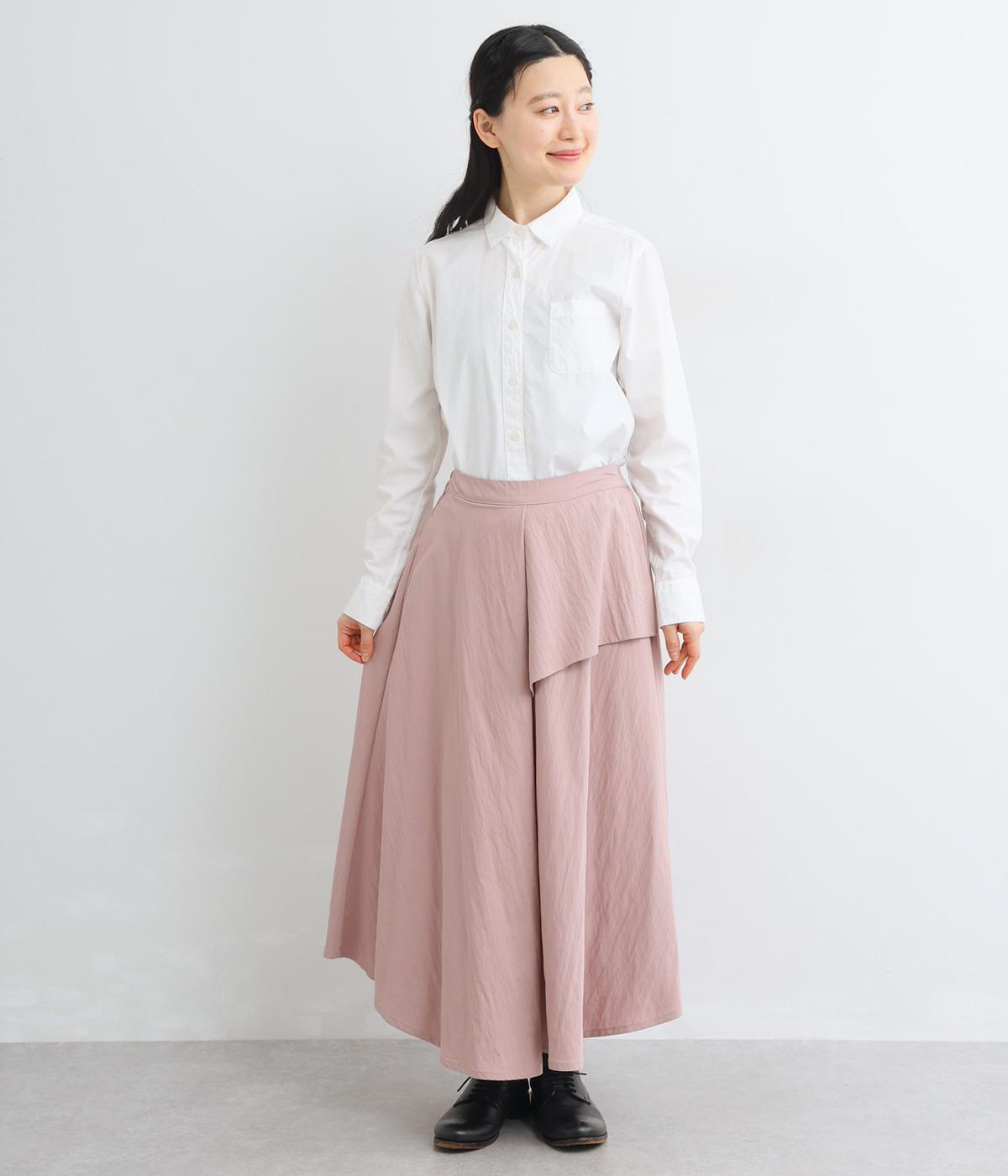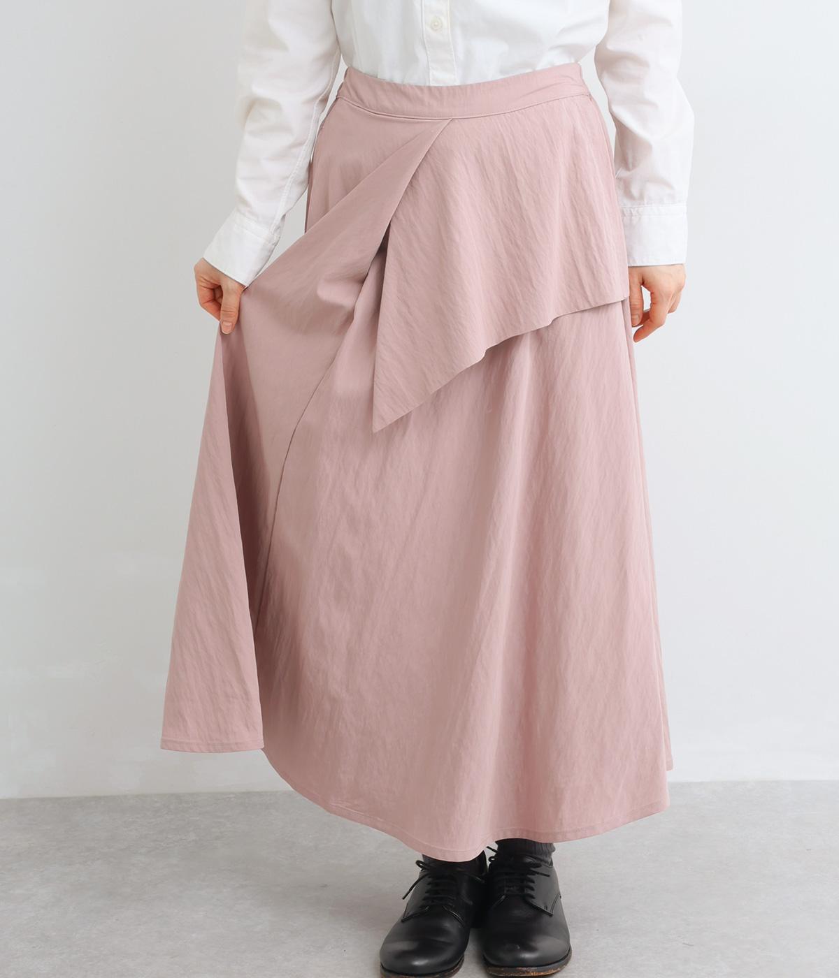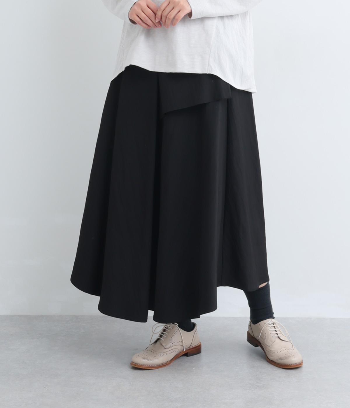 優雅なフレアシルエットに変形切り替えによるアシンメトリーデザインが目を惹くスカート。ロング丈ながら軽やかさもあり、きれいめからカジュアルまで幅広いトップスに合わせられます。ウエストは後ろのみゴム入りでトップスインも◎。