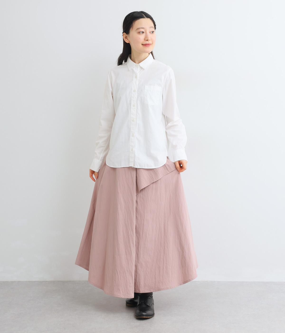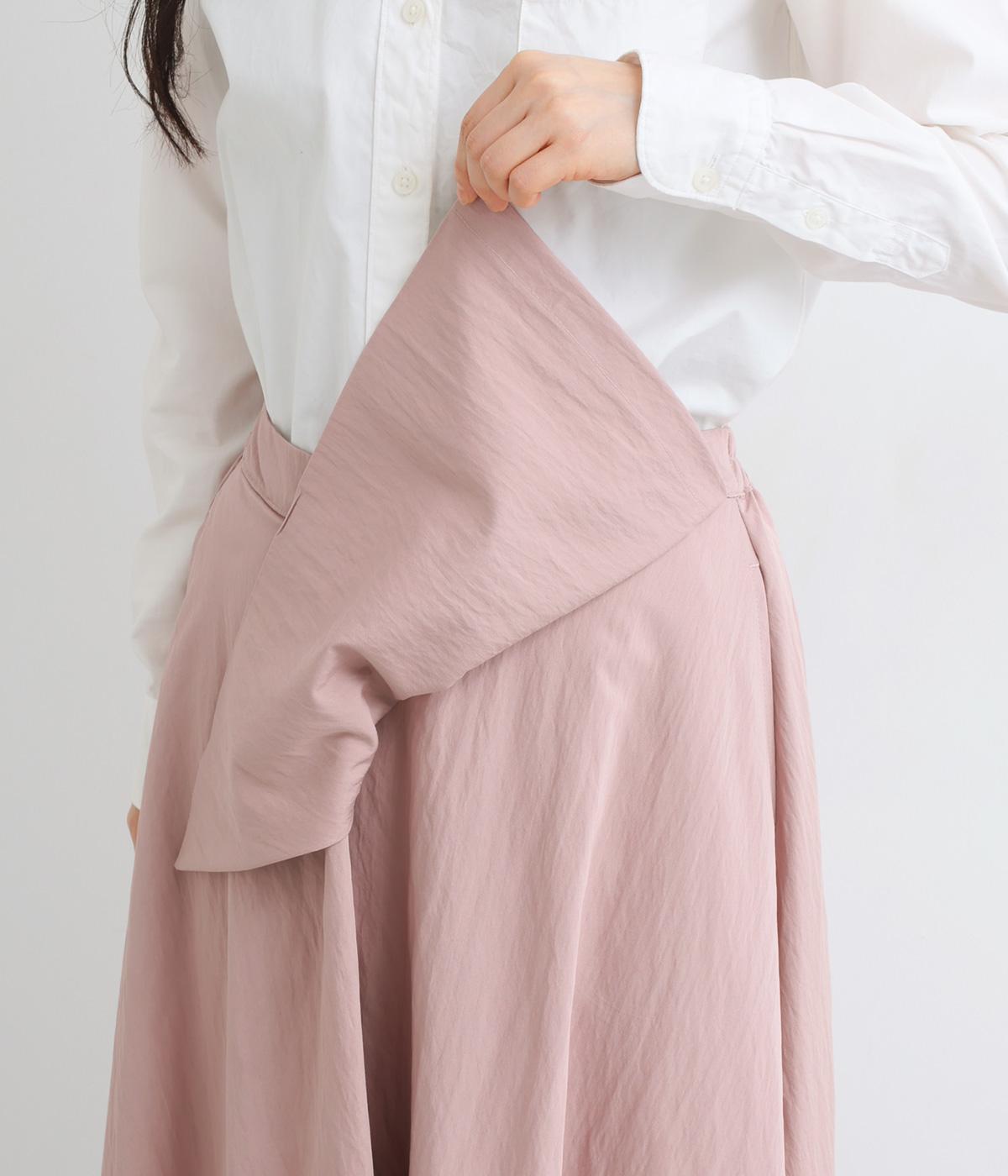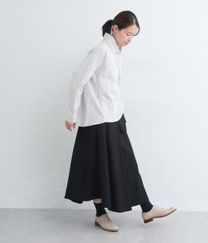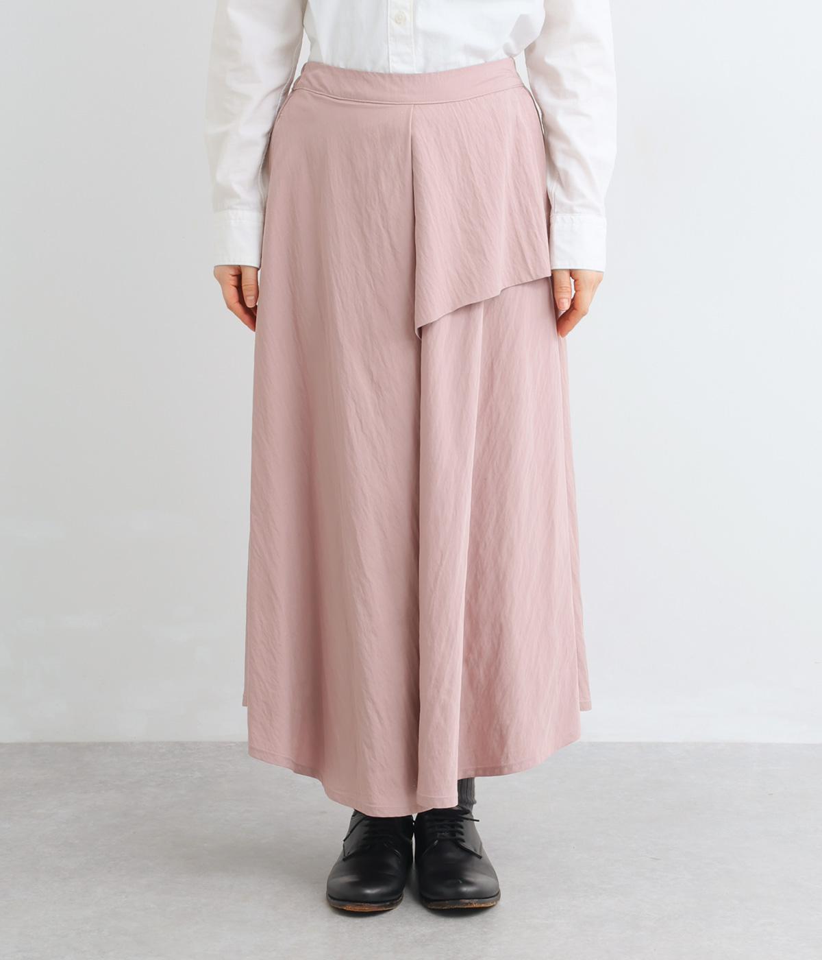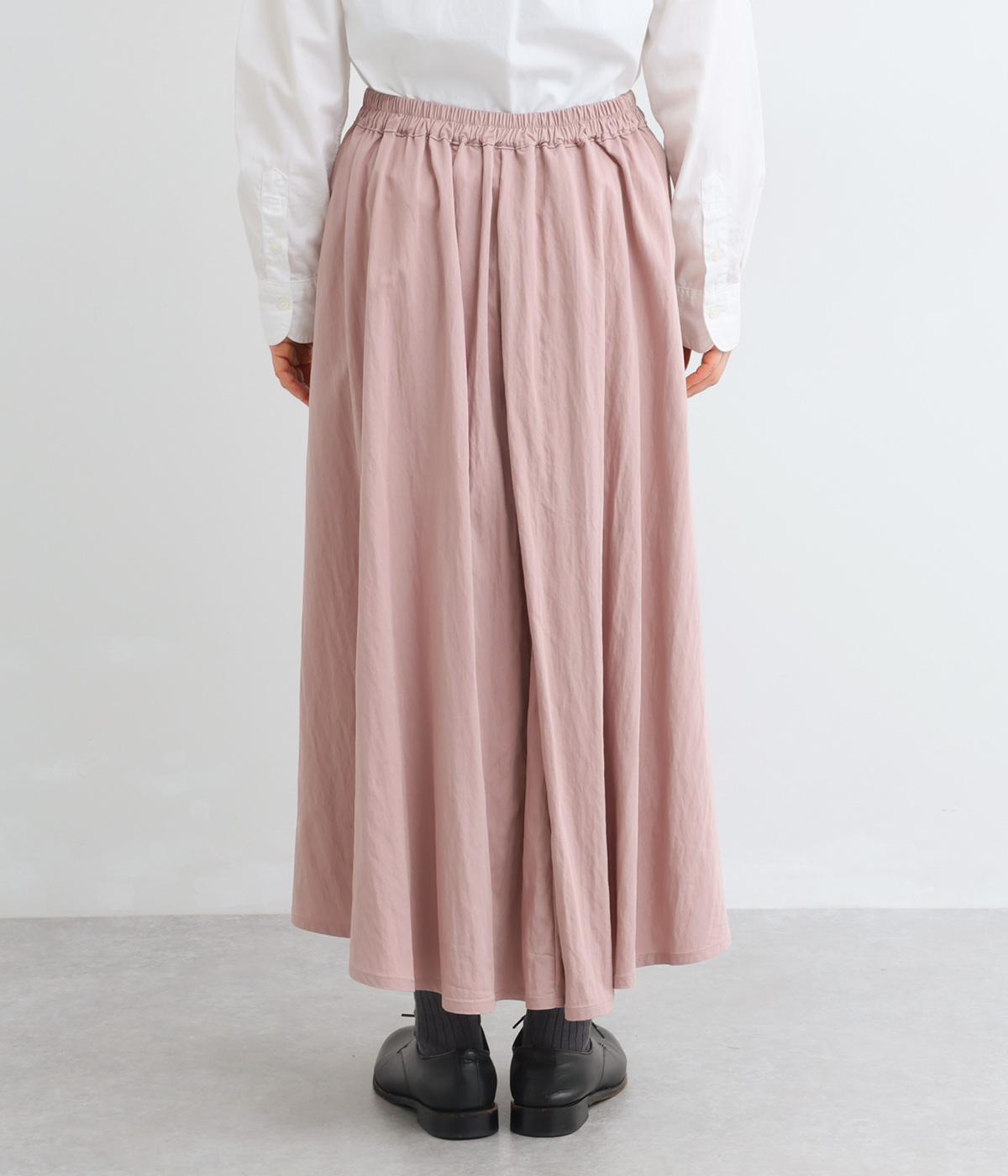 優雅なフレアシルエットに変形切り替えによるアシンメトリーデザインが目を惹くスカート。ロング丈ながら軽やかさもあり、きれいめからカジュアルまで幅広いトップスに合わせられます。ウエストは後ろのみゴム入りでトップスインも◎。