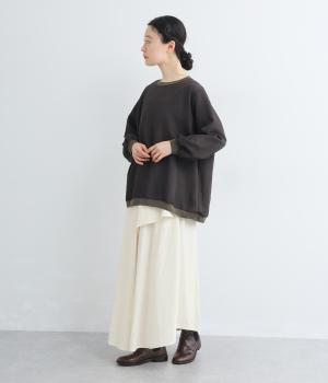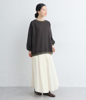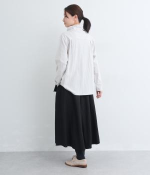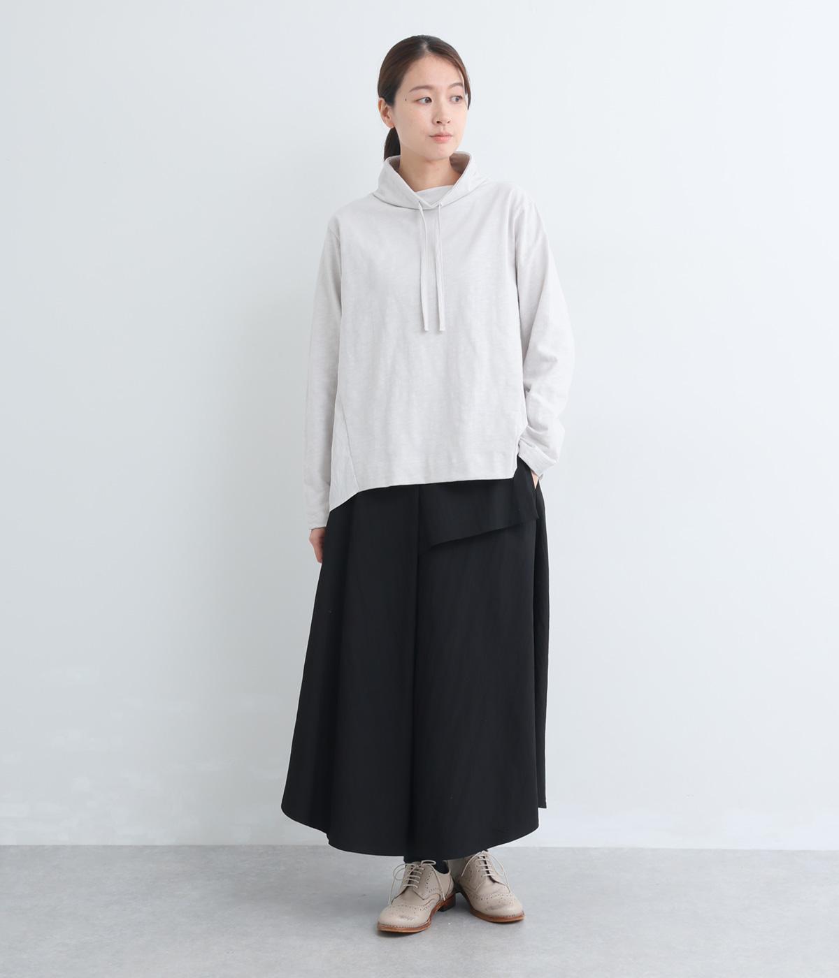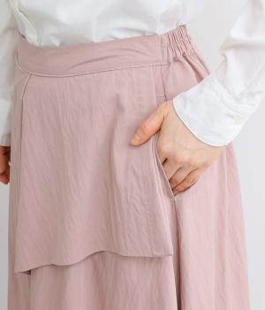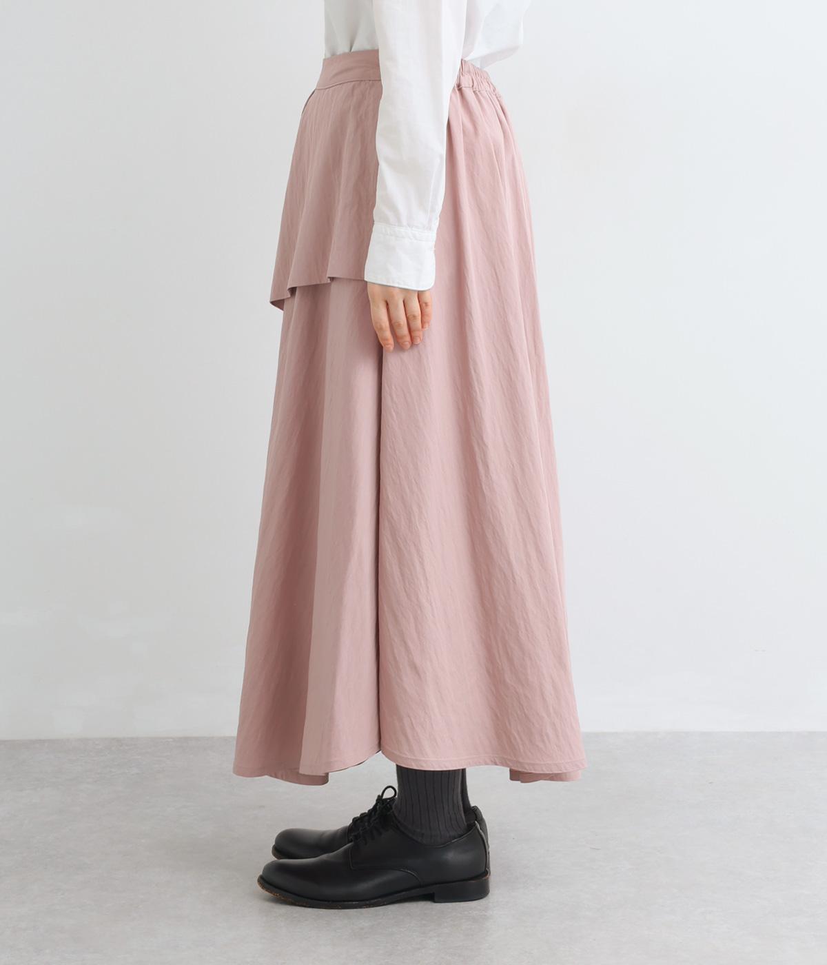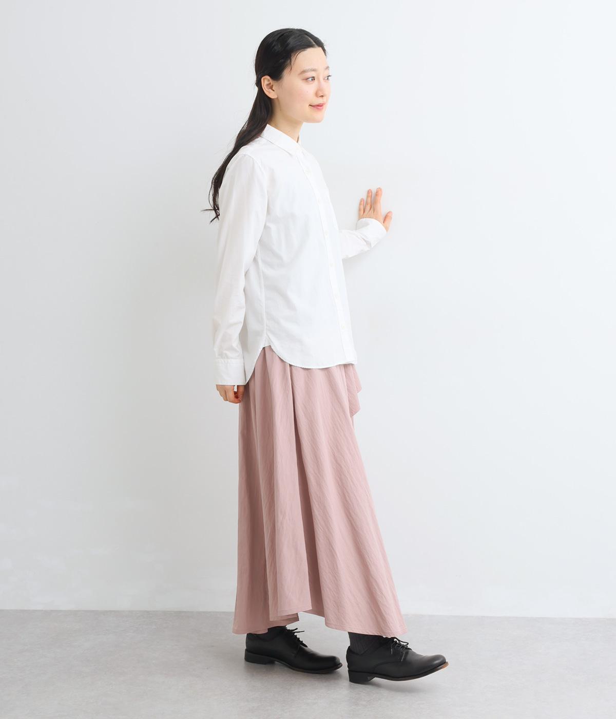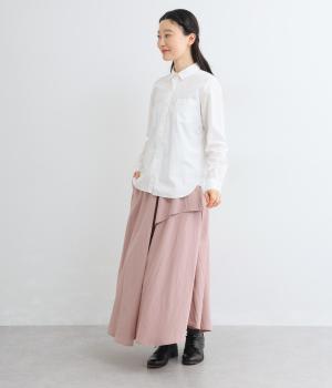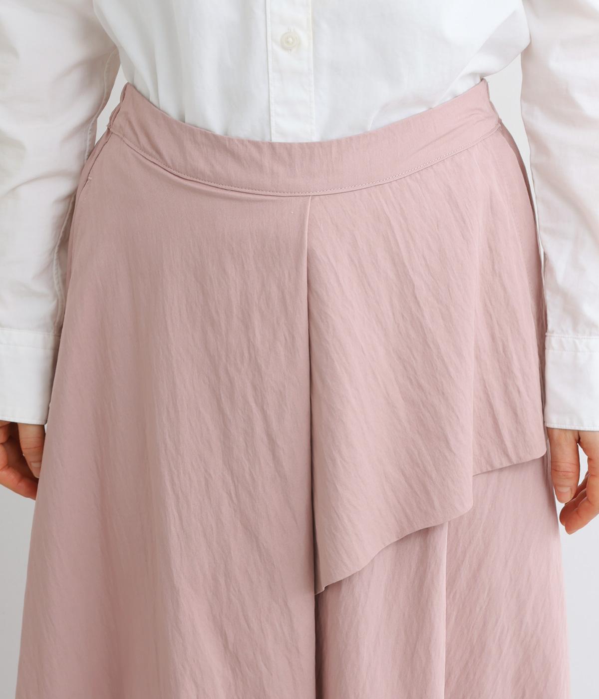 優雅なフレアシルエットに変形切り替えによるアシンメトリーデザインが目を惹くスカート。ロング丈ながら軽やかさもあり、きれいめからカジュアルまで幅広いトップスに合わせられます。ウエストは後ろのみゴム入りでトップスインも◎。