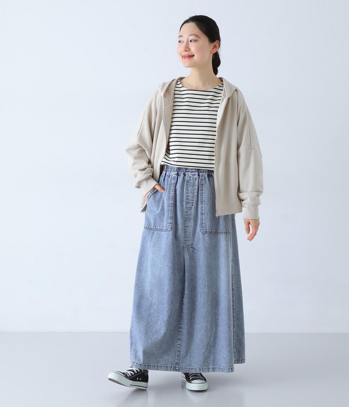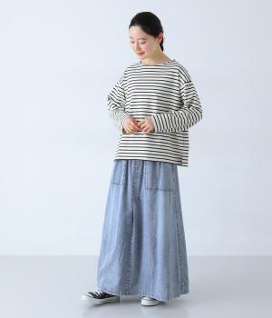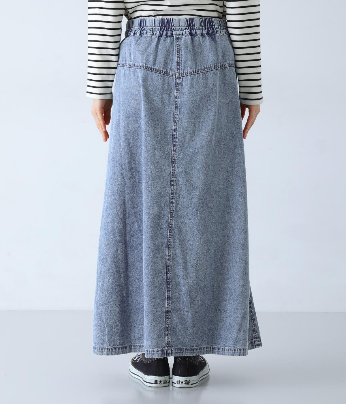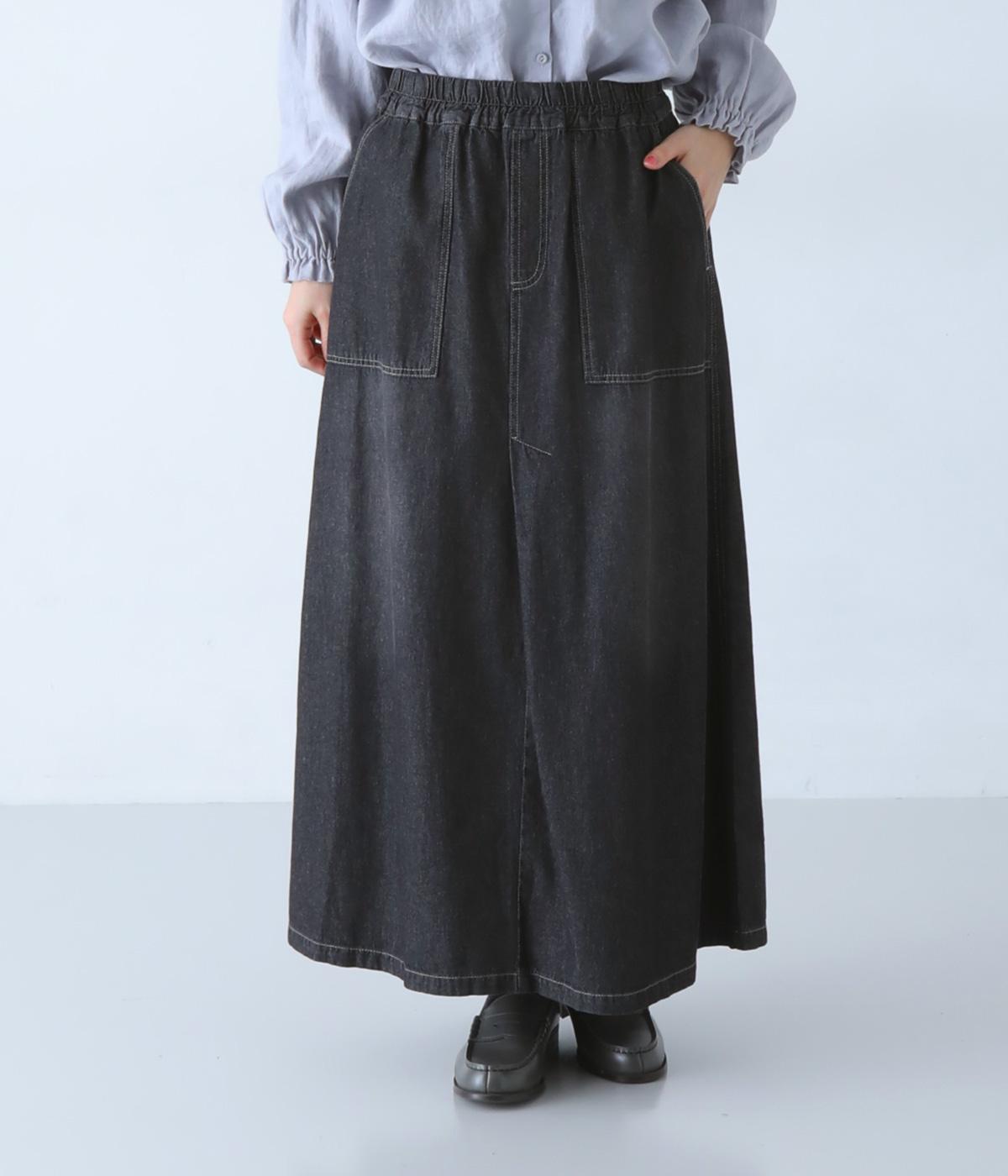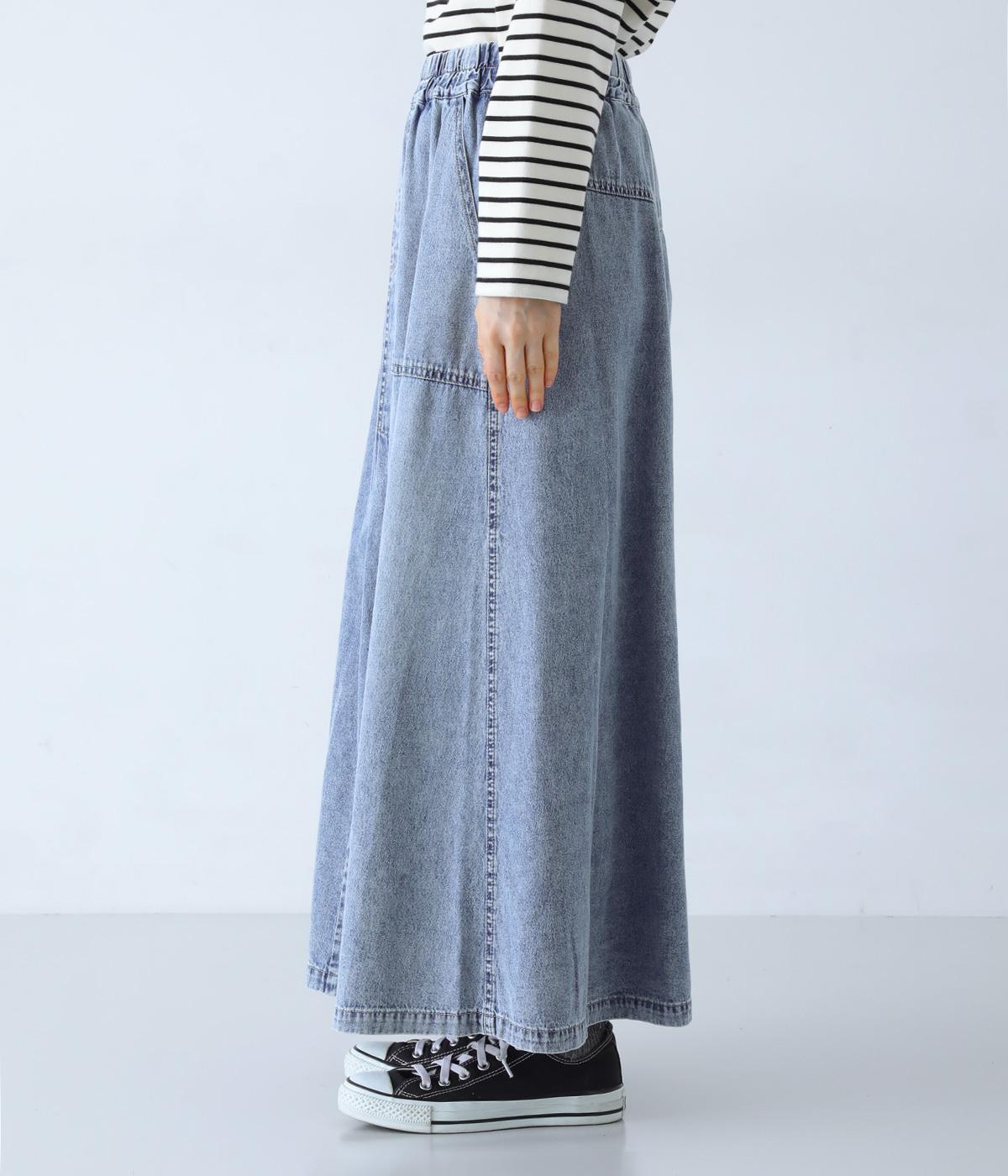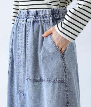 すとんとしたシルエットが裾に向かって自然と広がるフレアスカート。腰下の大きめブロックステッチが目線を上に誘い、すっきりとしたスタイルに見せてくれます。デニムながらウエストはゴム仕様で、イージーに穿ける一枚です。
