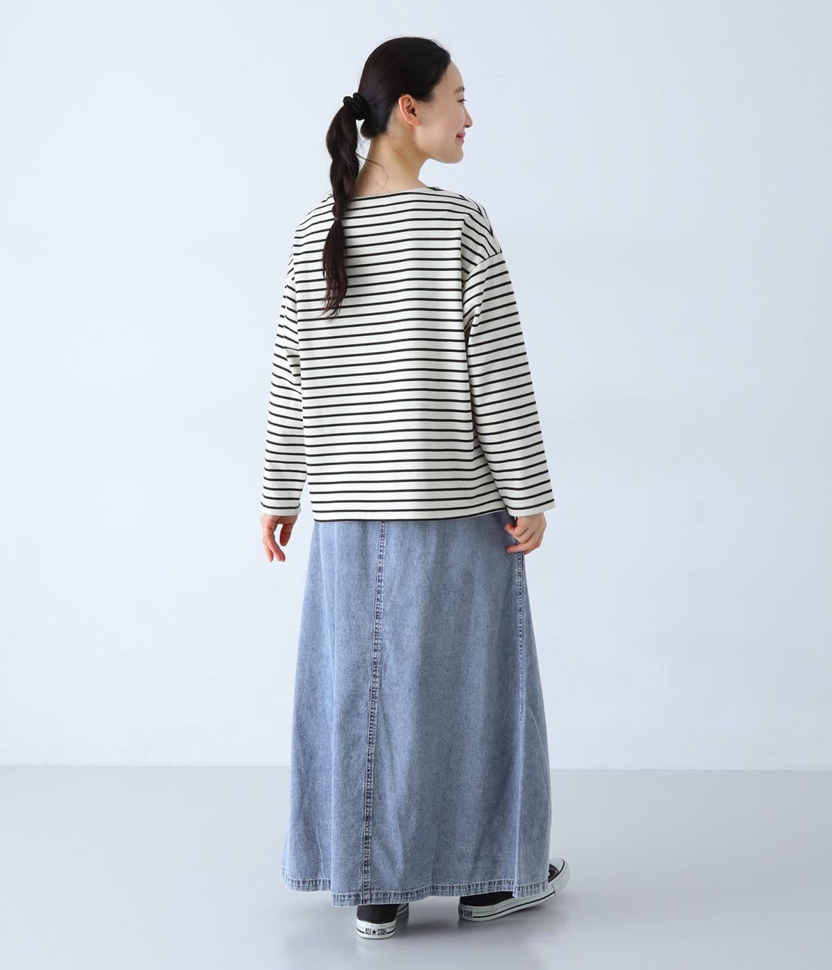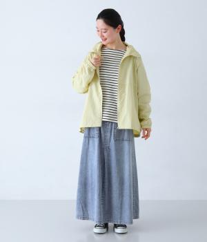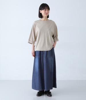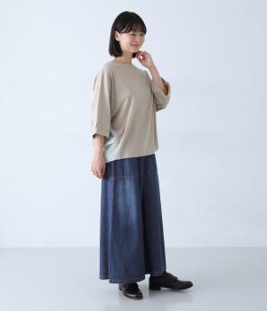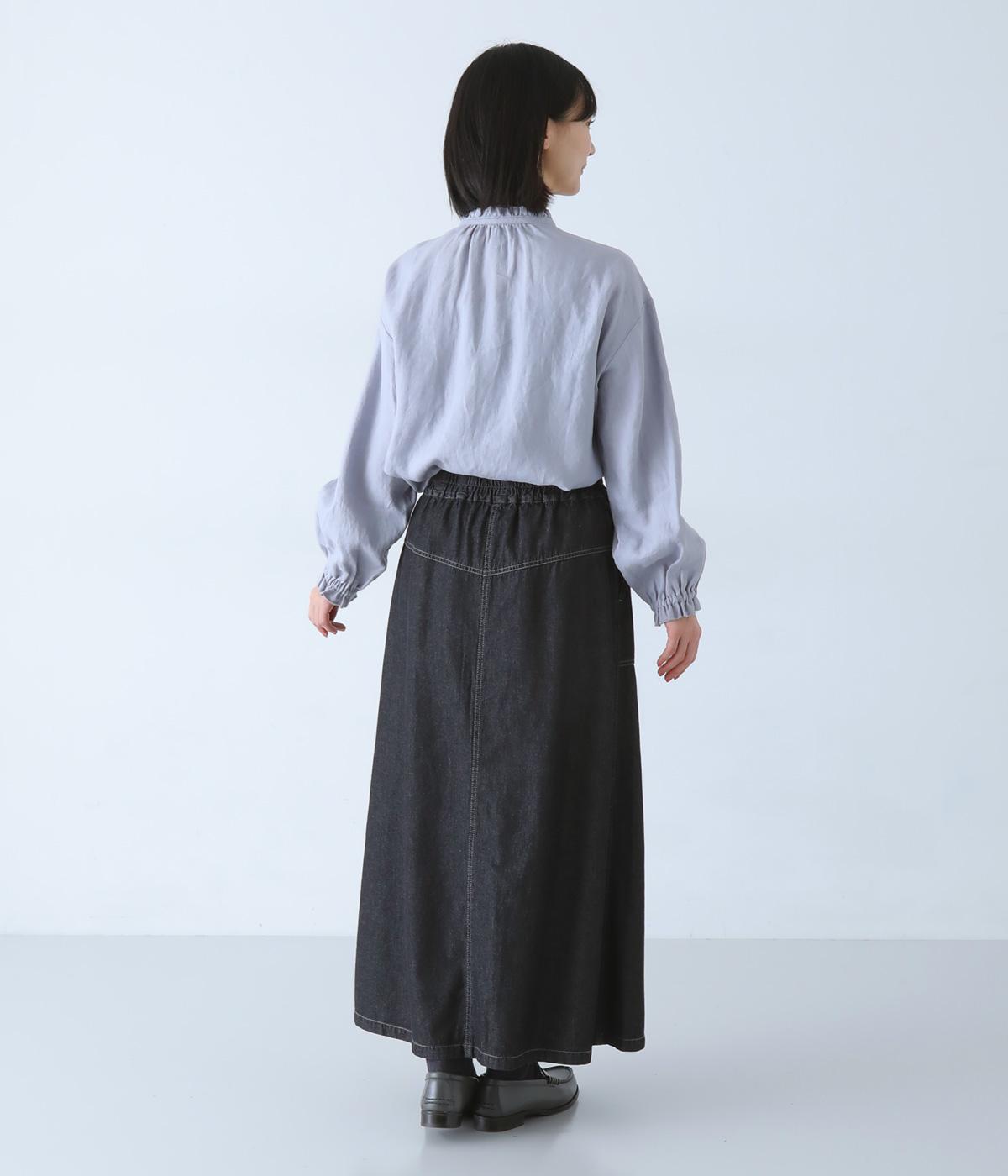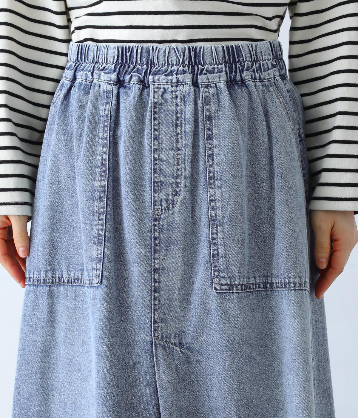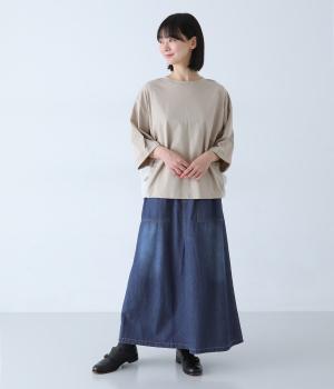 すとんとしたシルエットが裾に向かって自然と広がるフレアスカート。腰下の大きめブロックステッチが目線を上に誘い、すっきりとしたスタイルに見せてくれます。デニムながらウエストはゴム仕様で、イージーに穿ける一枚です。