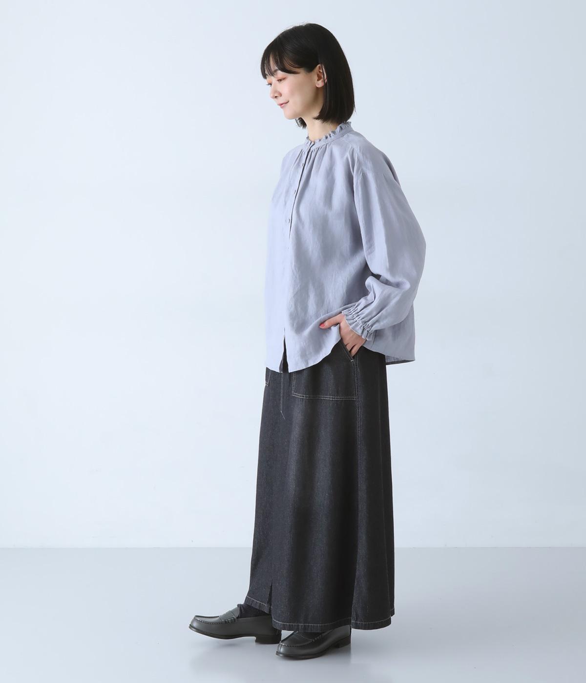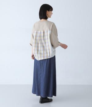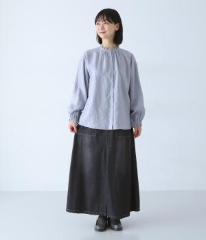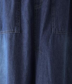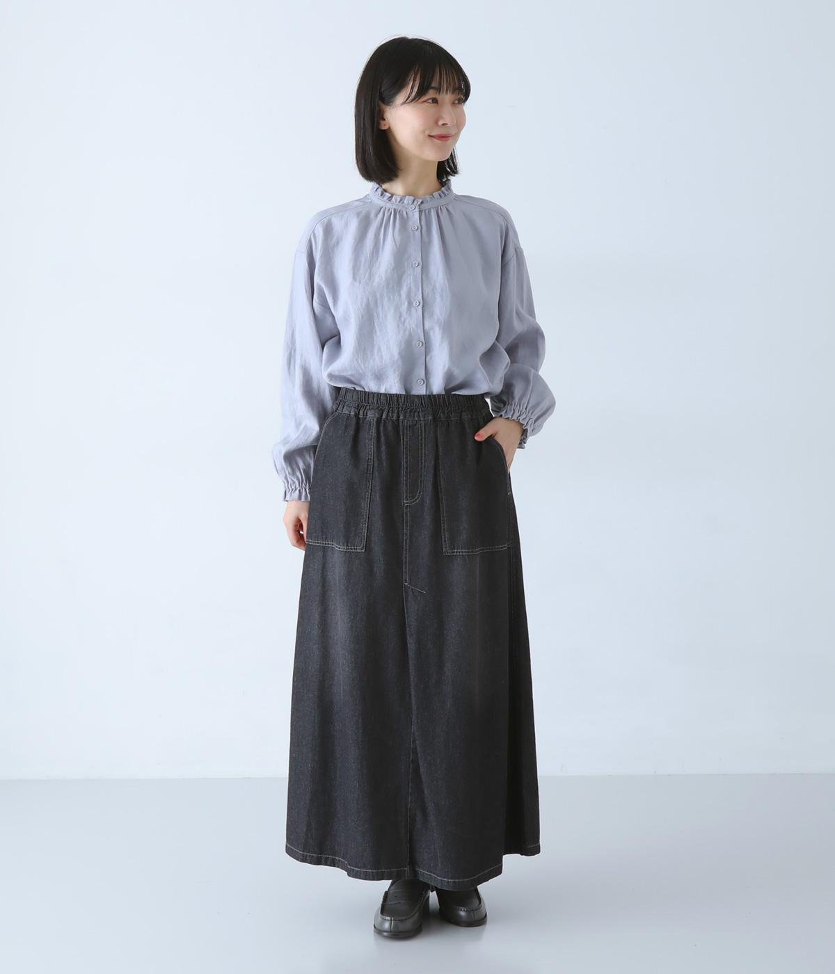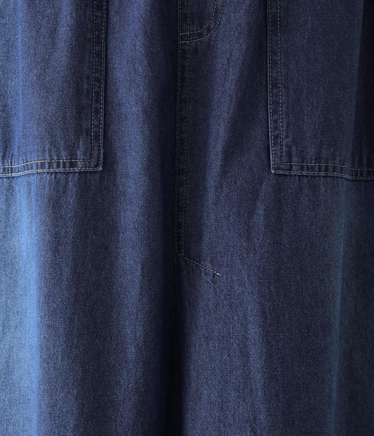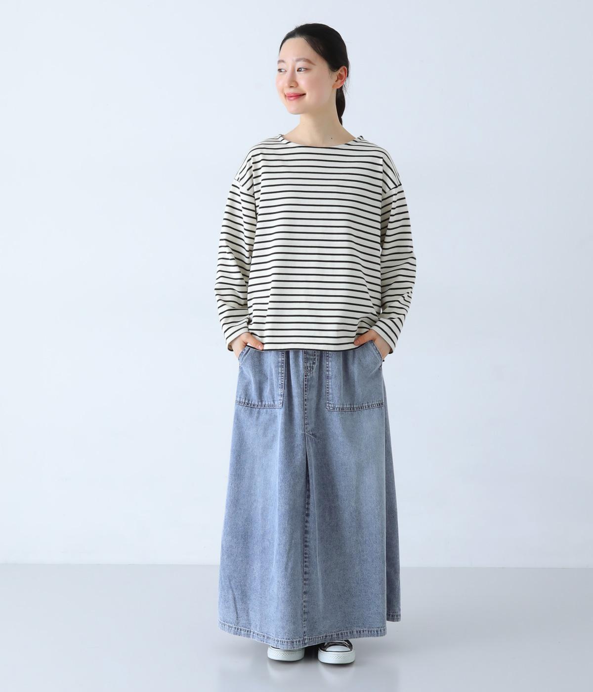 すとんとしたシルエットが裾に向かって自然と広がるフレアスカート。腰下の大きめブロックステッチが目線を上に誘い、すっきりとしたスタイルに見せてくれます。デニムながらウエストはゴム仕様で、イージーに穿ける一枚です。