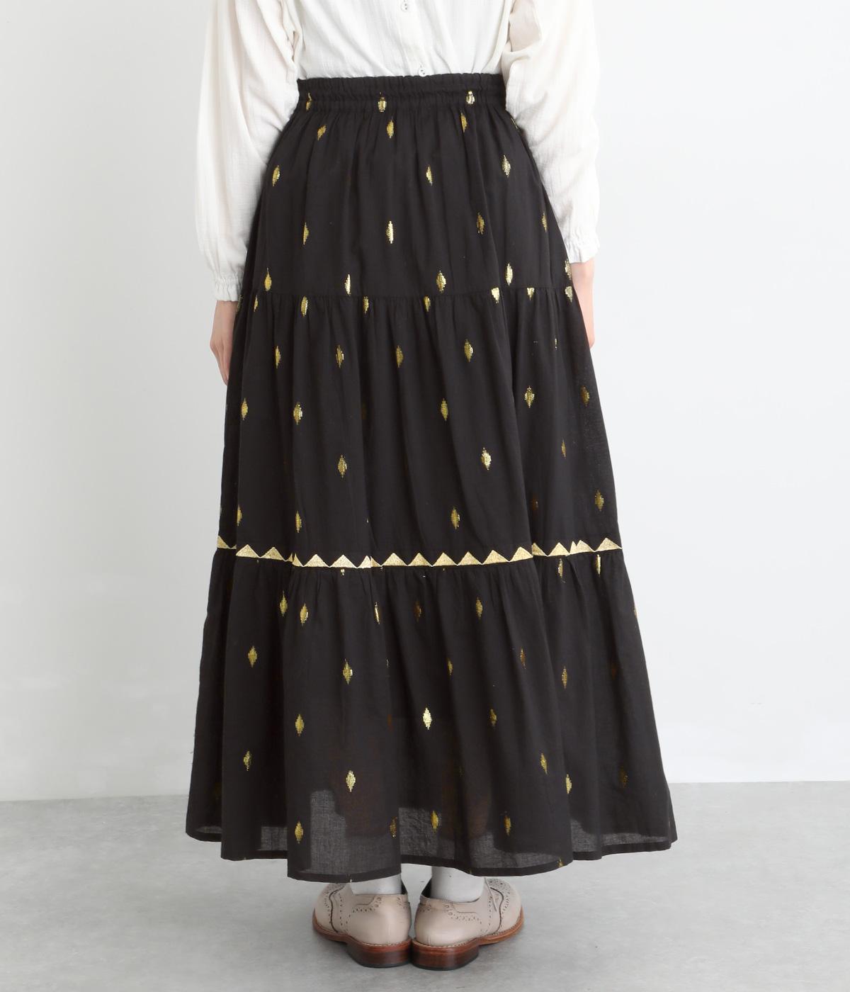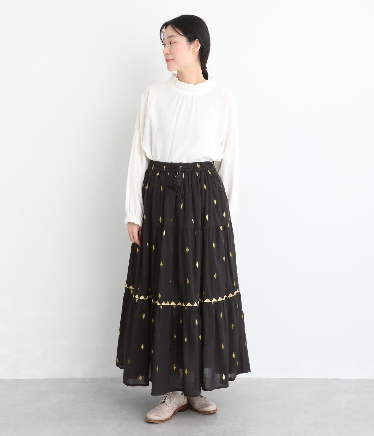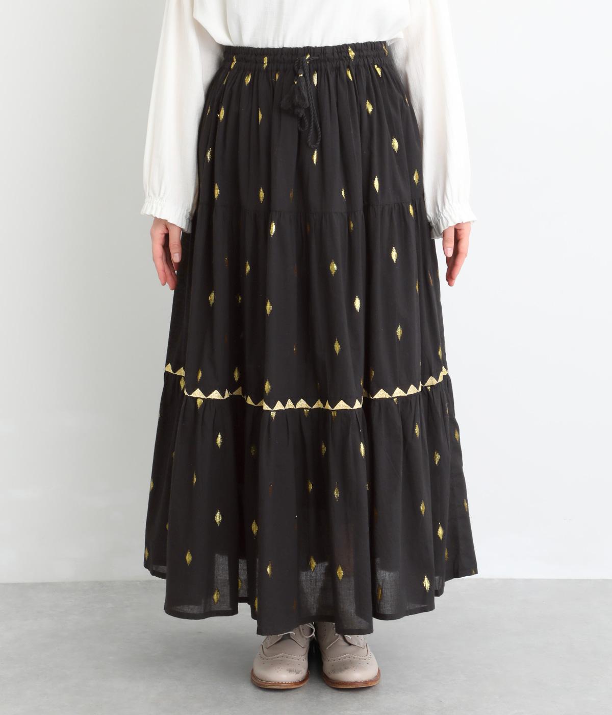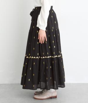 生地に織り込んだ煌びやかな金色が映えるスカートです。軽やかな生地が美しいドレープをつくり、動くたびに華やかさを引き立てます。ウエストは総ゴム仕様で紐で調節可能。裏地付きで安心の穿き心地です。