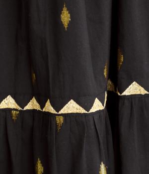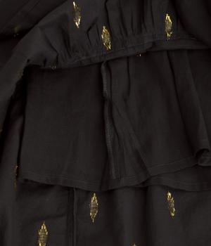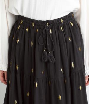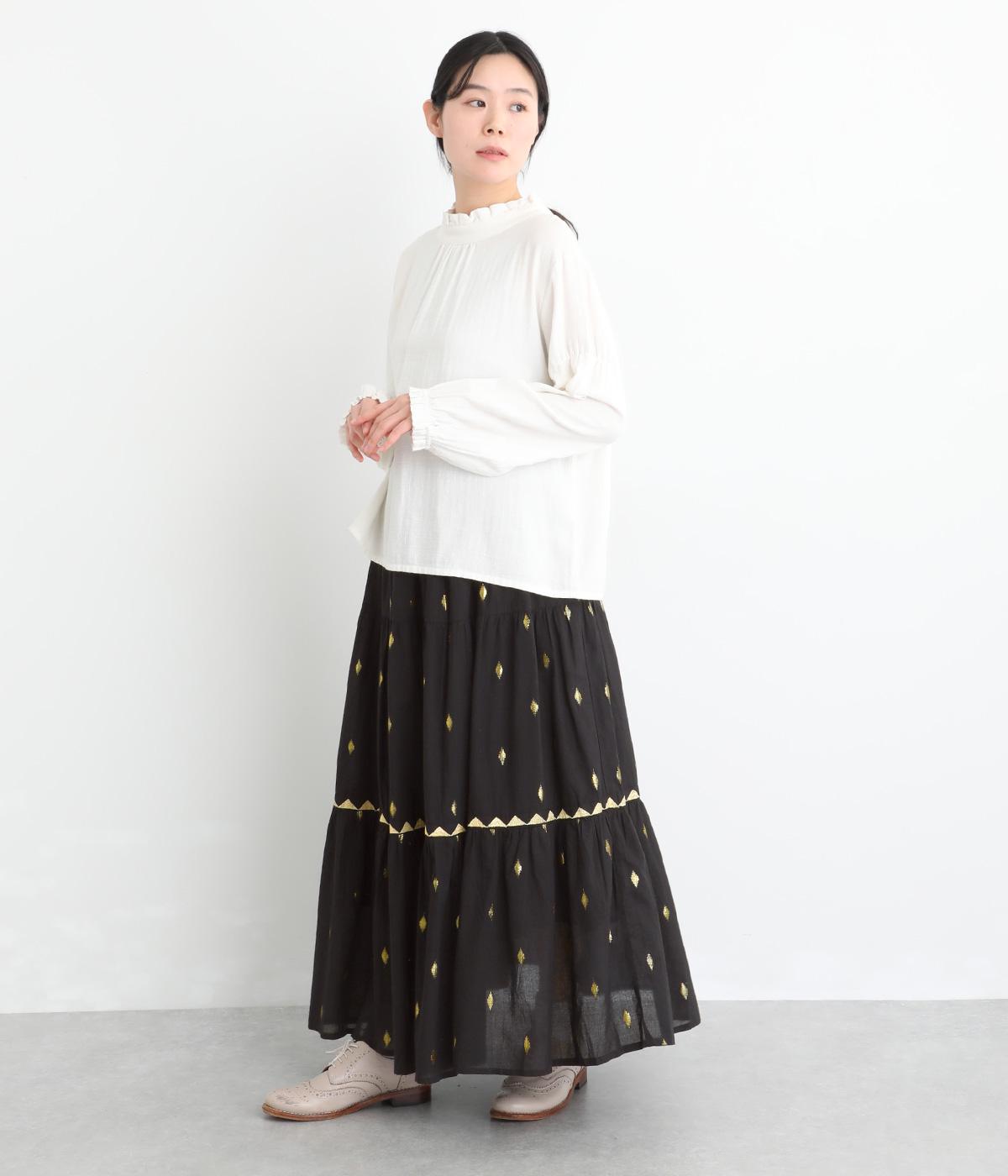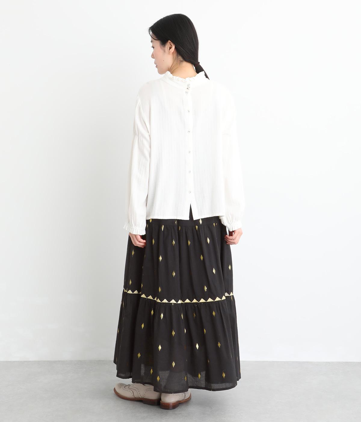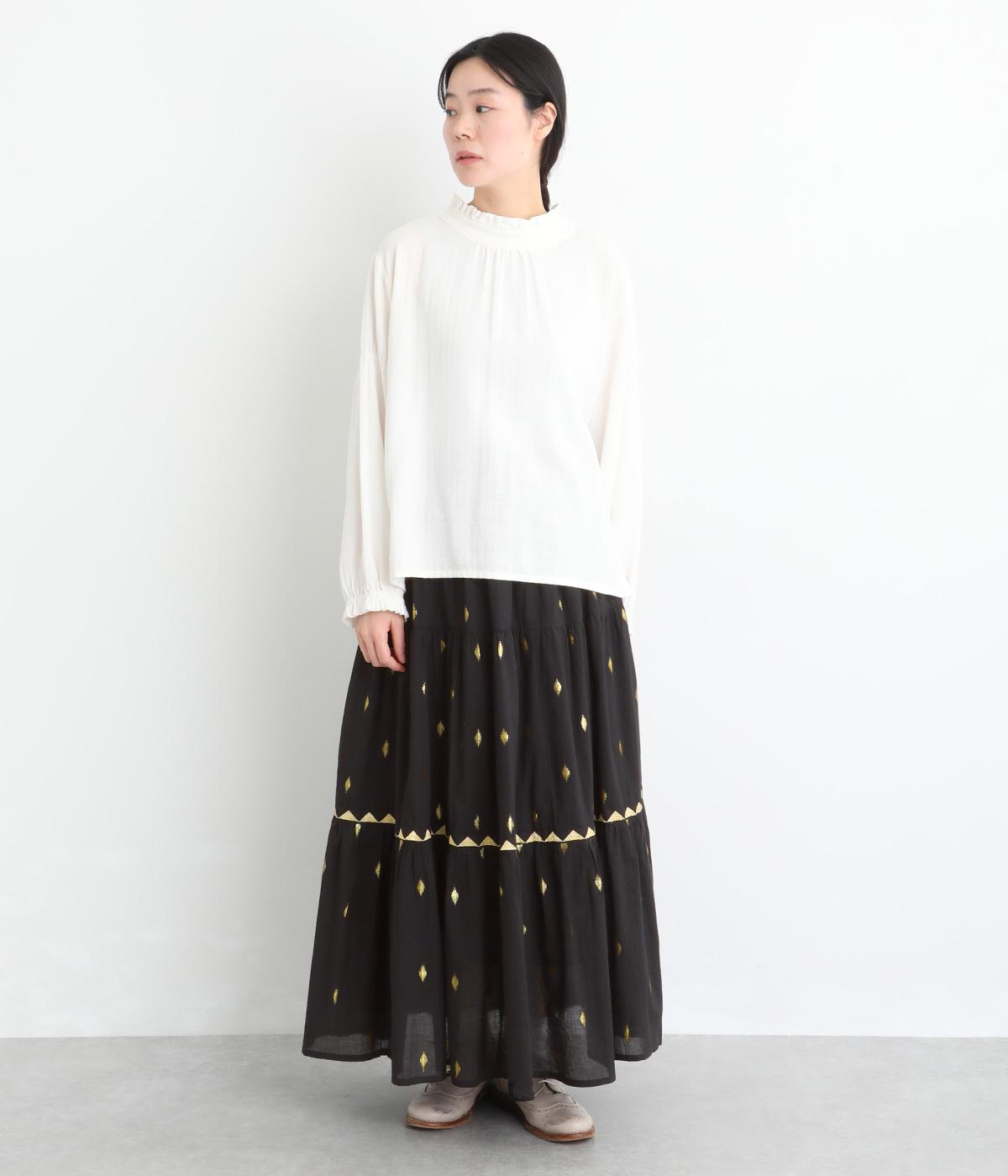 生地に織り込んだ煌びやかな金色が映えるスカートです。軽やかな生地が美しいドレープをつくり、動くたびに華やかさを引き立てます。ウエストは総ゴム仕様で紐で調節可能。裏地付きで安心の穿き心地です。