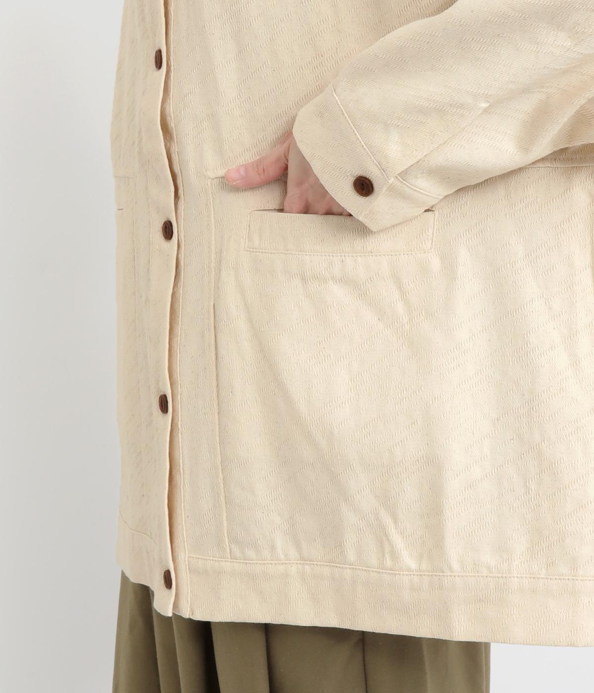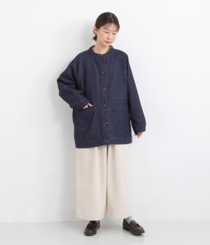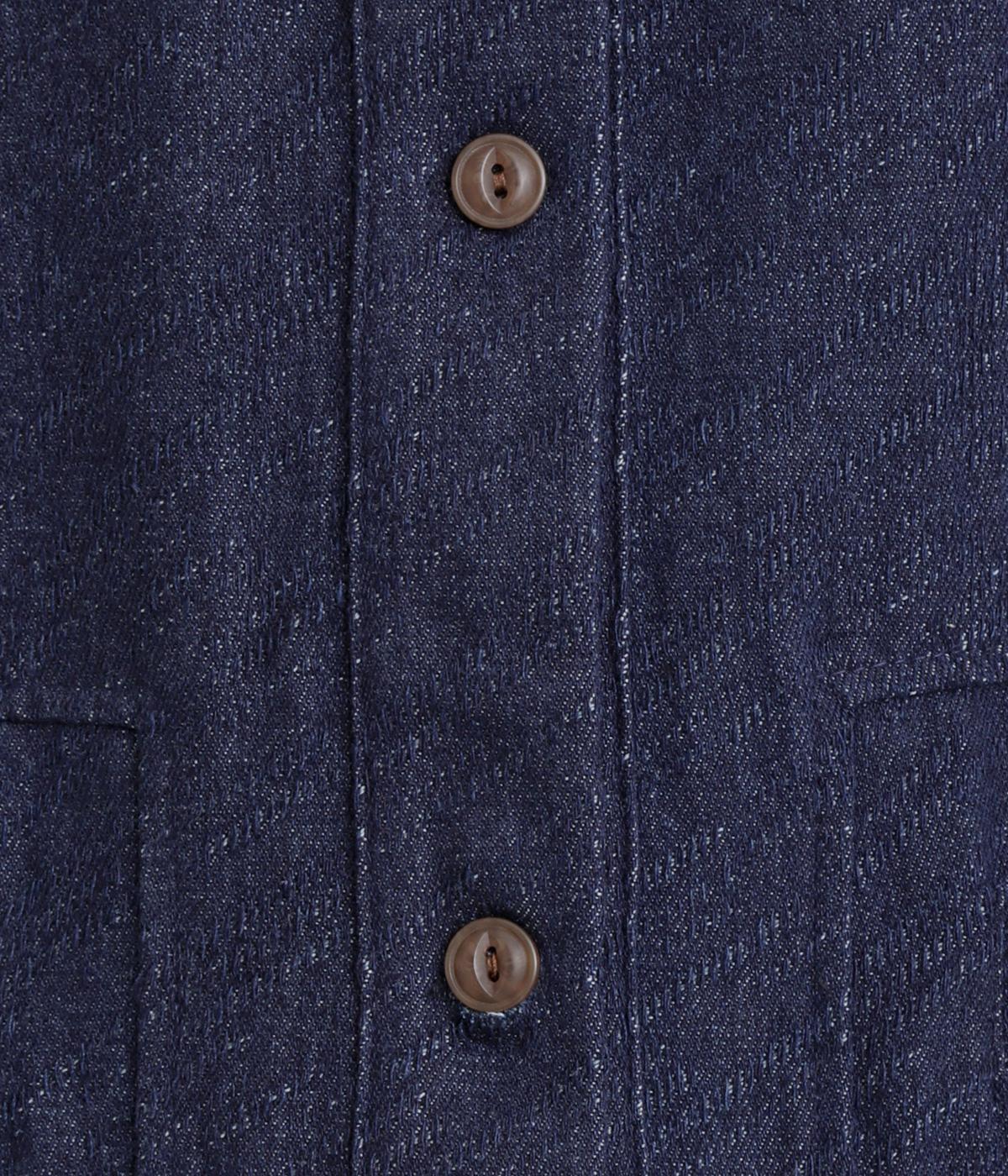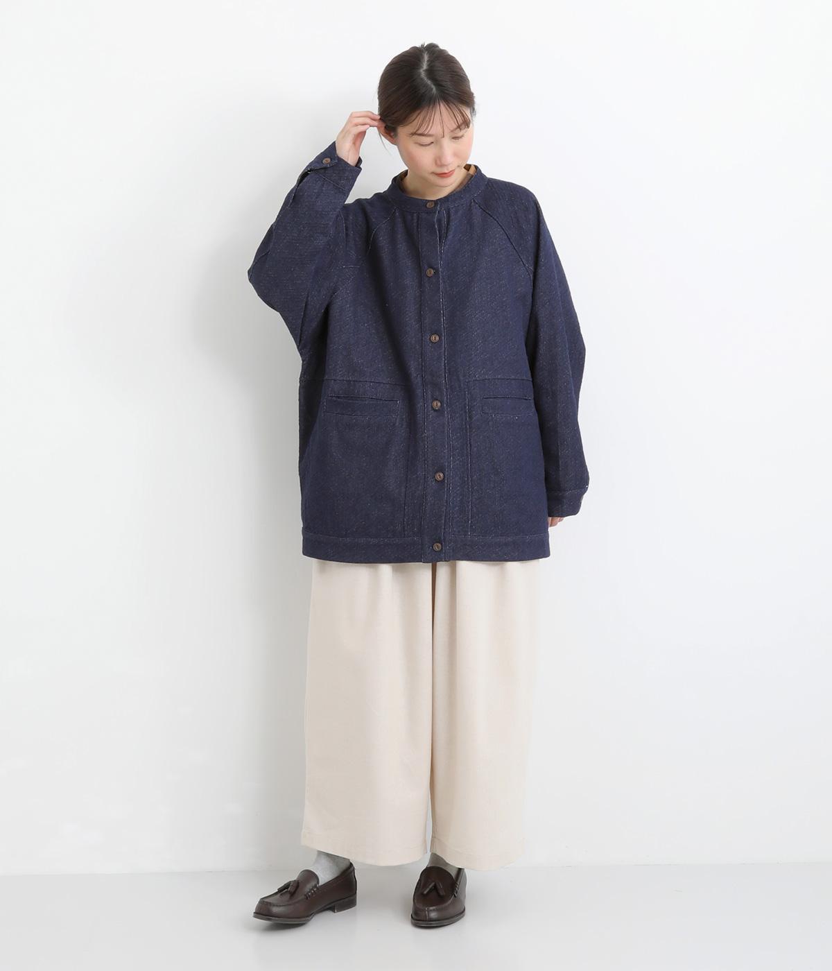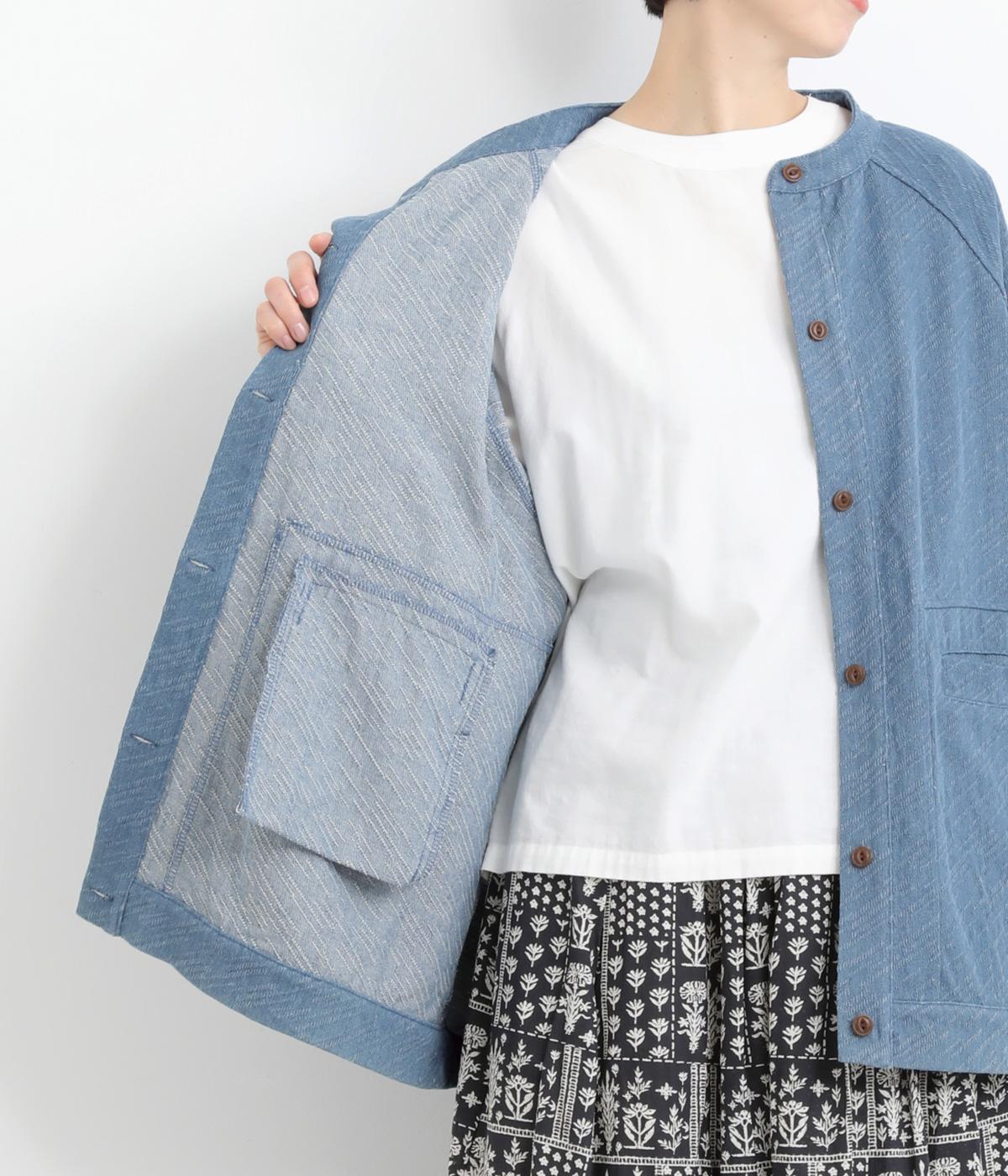 織り柄がほのかに浮かび上がるジャカードデニムです。やわらかな肌なじみのコットンデニムで、730gと軽量に仕立てました。カジュアル感をほどよく抑えた落ち着きのある雰囲気です。