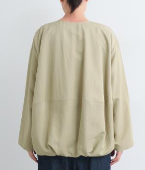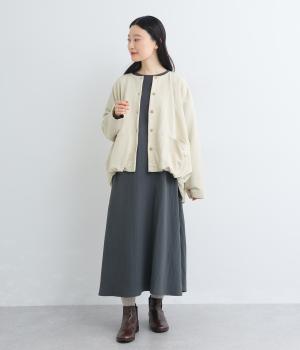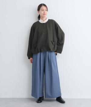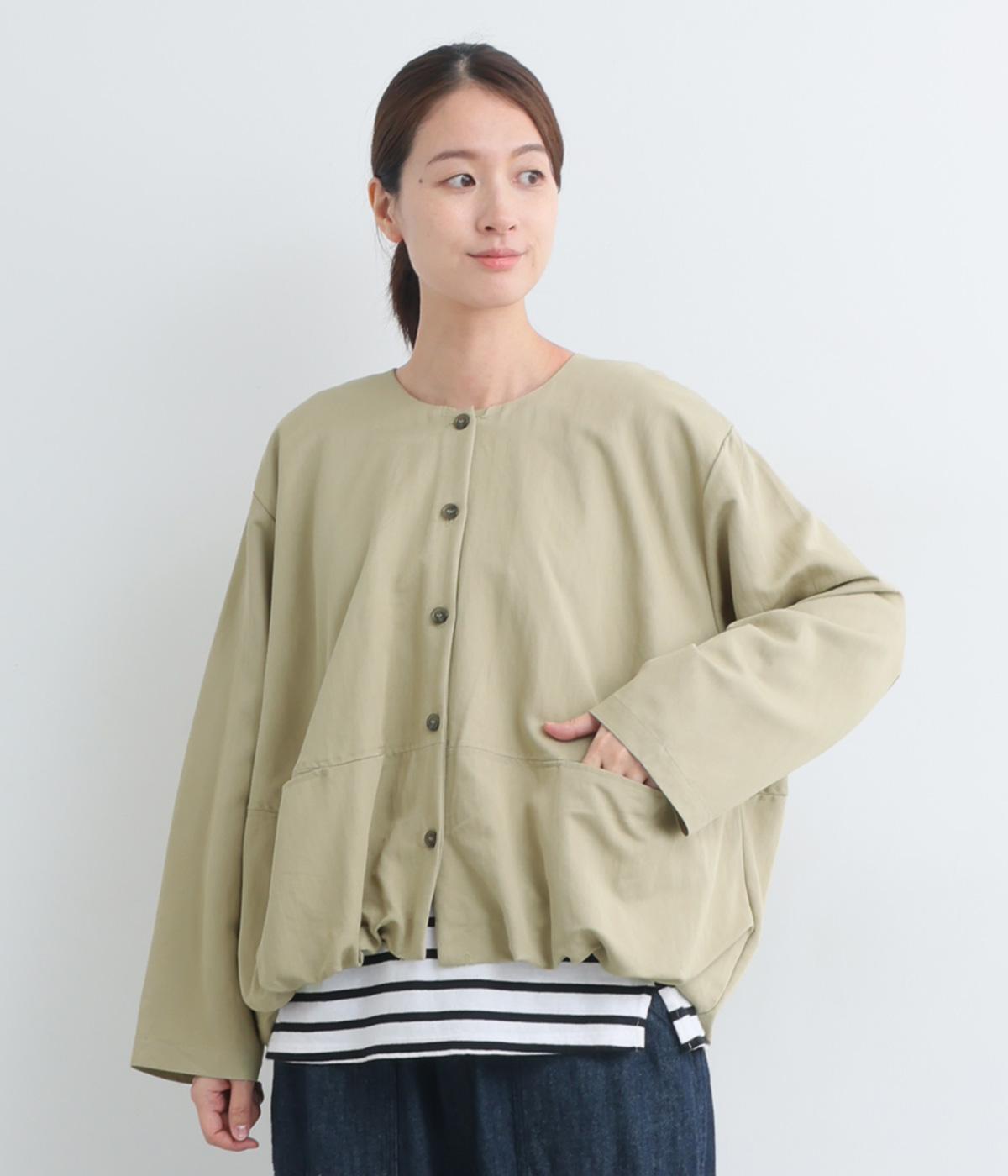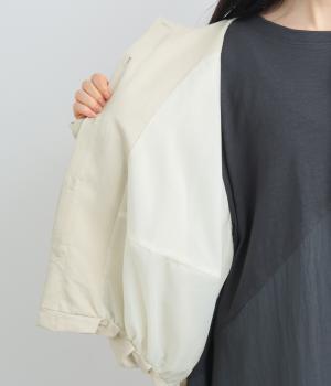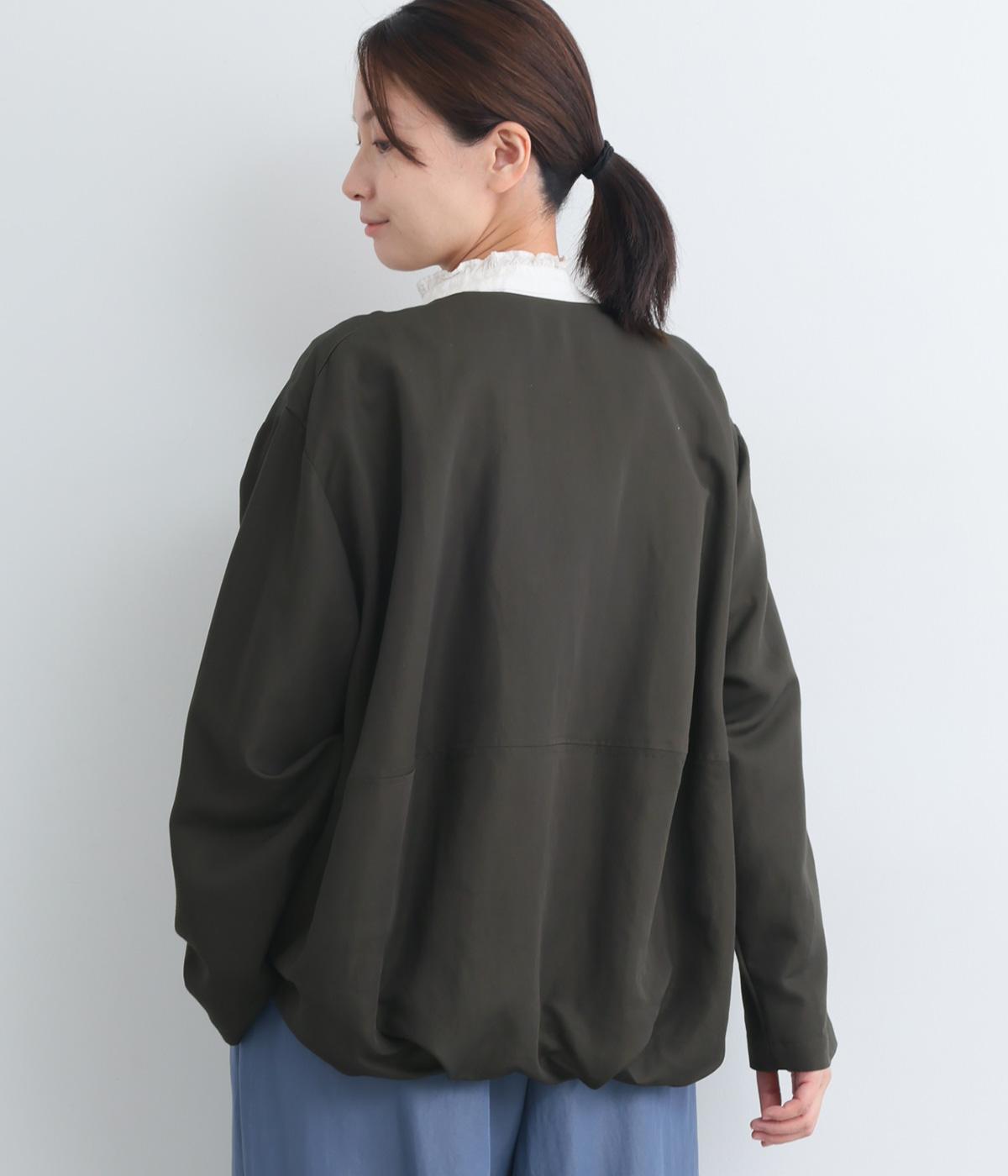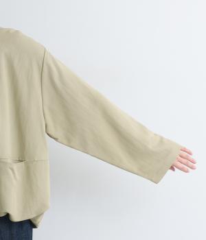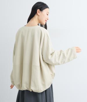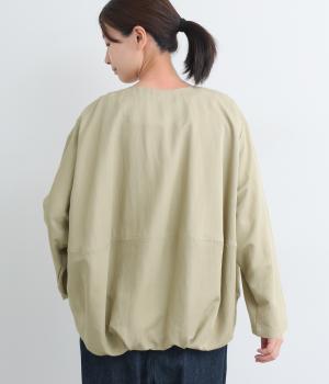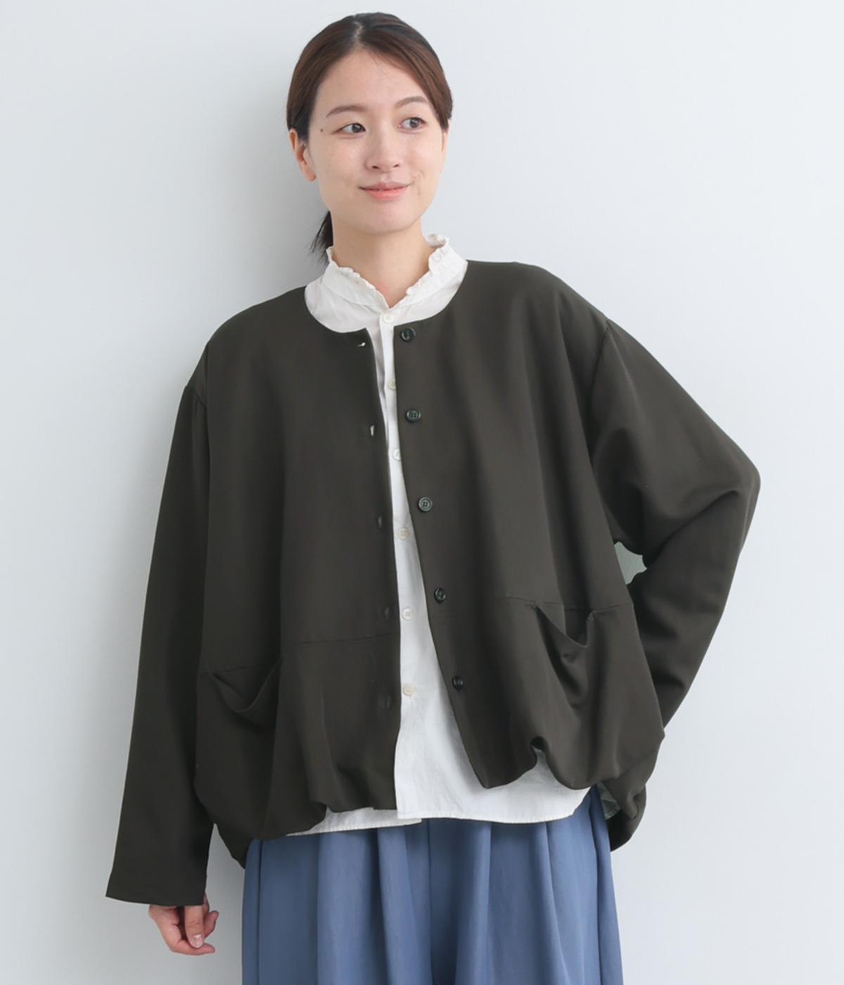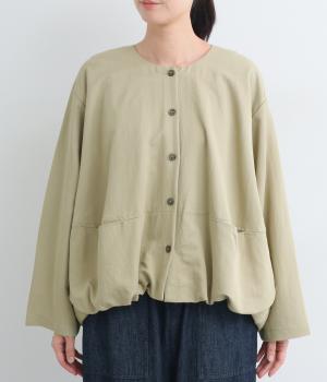 たぷっとしたバルーンシルエットが特徴的なジャケット。ノーカラーにスラッシュポケットでシンプルにまとめつつ、裾まわりに可愛らしいニュアンスを持たせています。後ろ裾をやや長めにして、羽織り姿も自然なシルエットに。