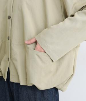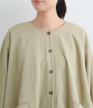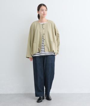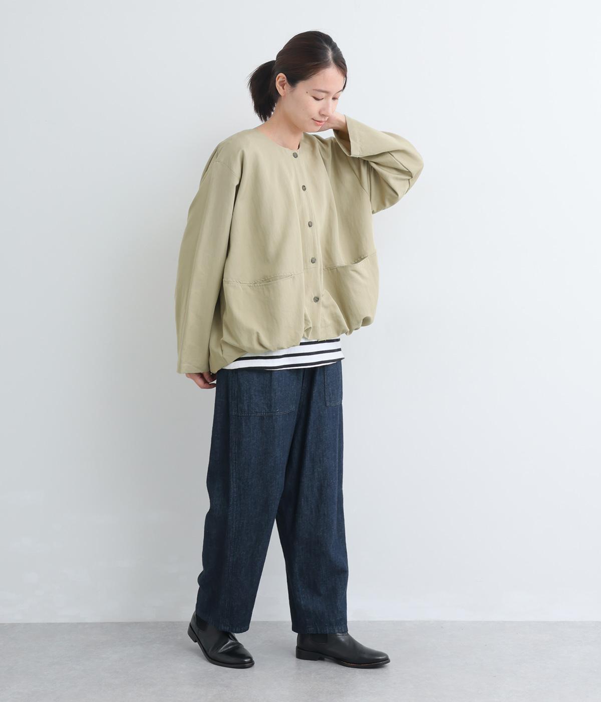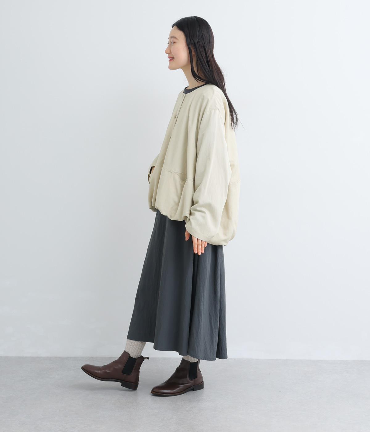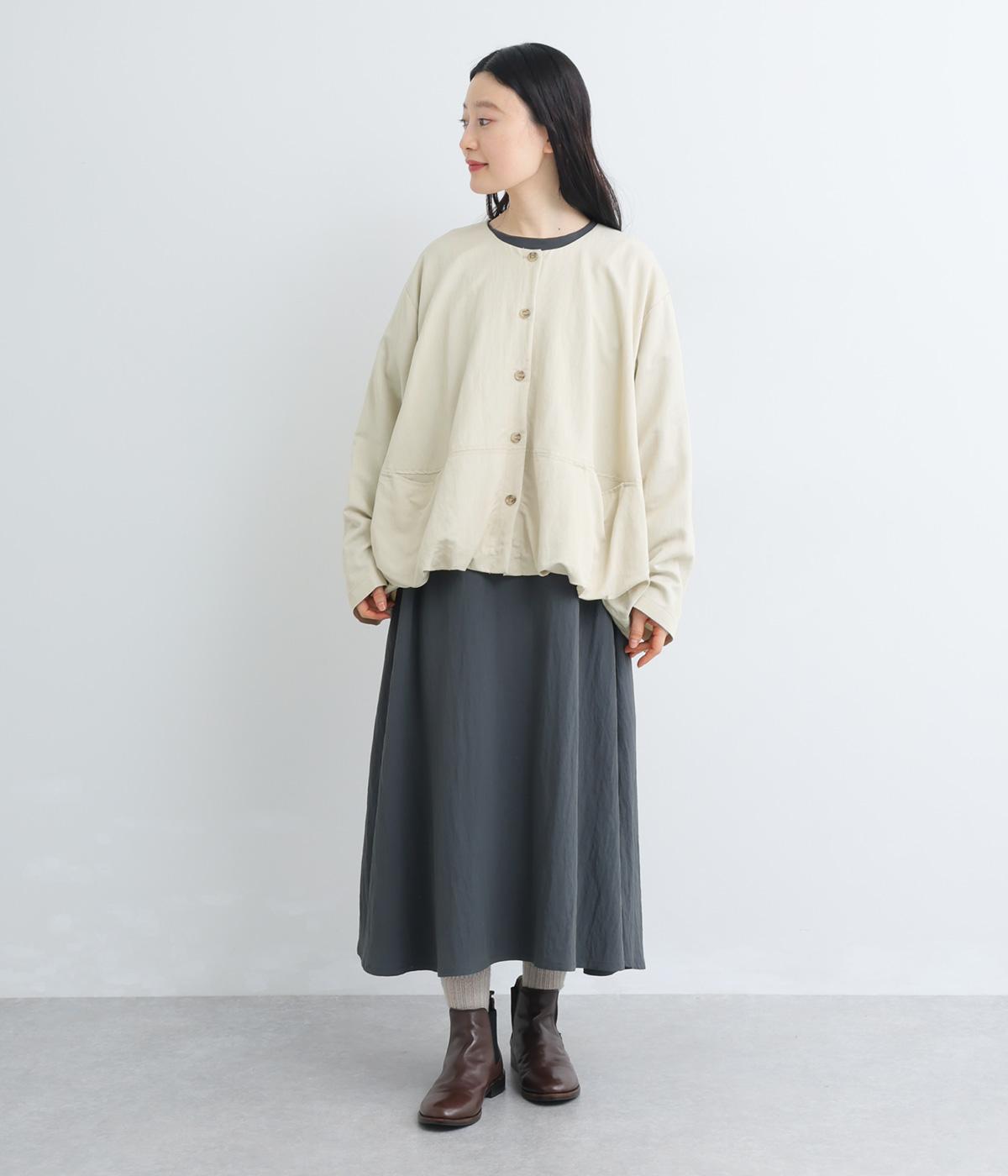 たぷっとしたバルーンシルエットが特徴的なジャケット。ノーカラーにスラッシュポケットでシンプルにまとめつつ、裾まわりに可愛らしいニュアンスを持たせています。後ろ裾をやや長めにして、羽織り姿も自然なシルエットに。