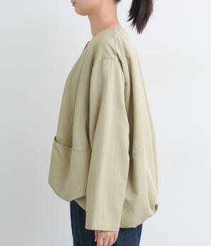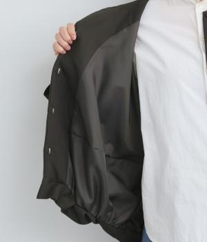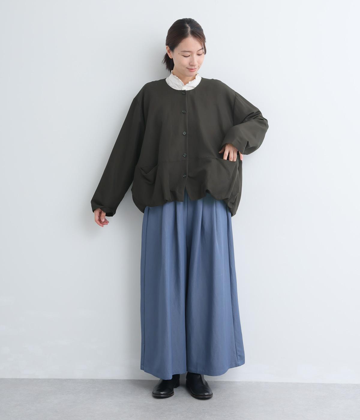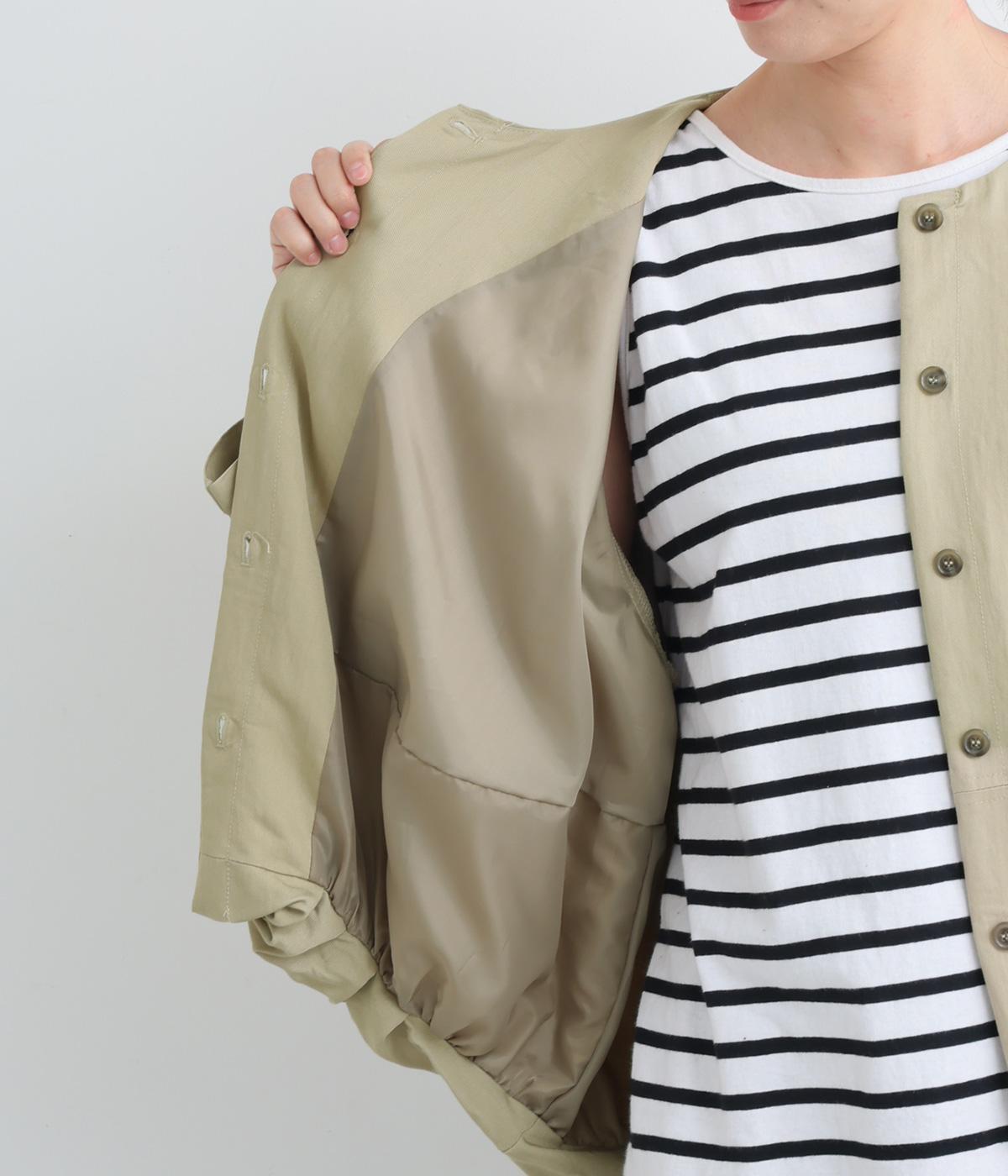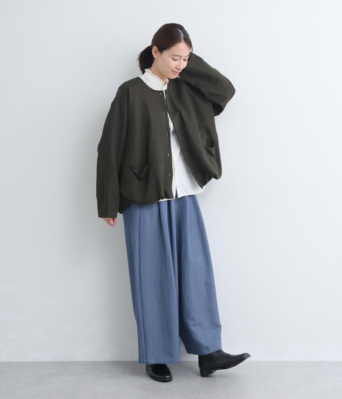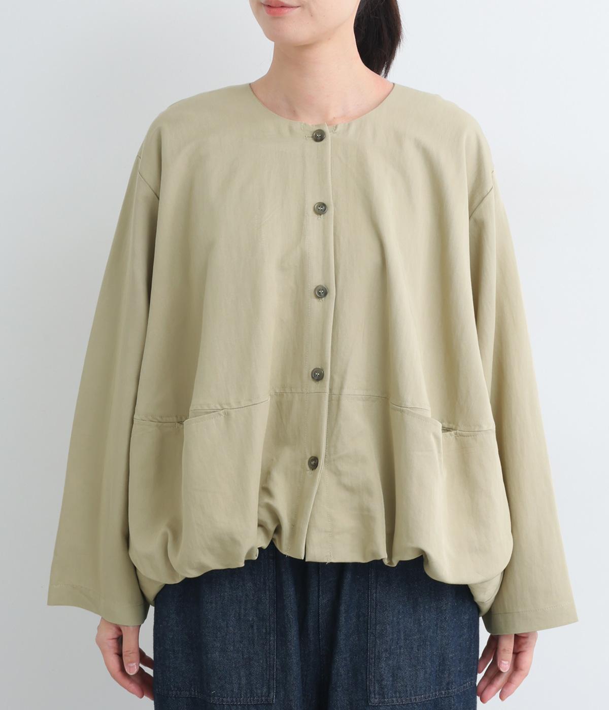 たぷっとしたバルーンシルエットが特徴的なジャケット。ノーカラーにスラッシュポケットでシンプルにまとめつつ、裾まわりに可愛らしいニュアンスを持たせています。後ろ裾をやや長めにして、羽織り姿も自然なシルエットに。