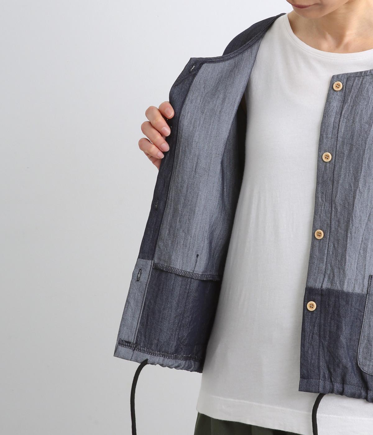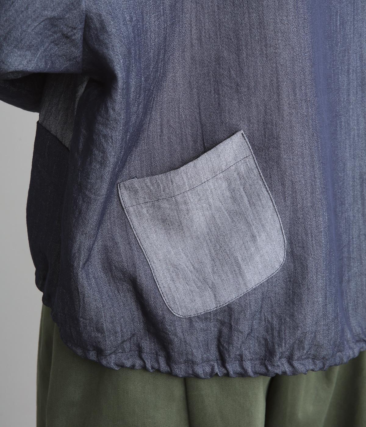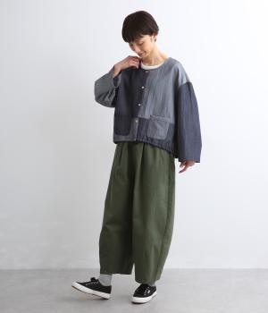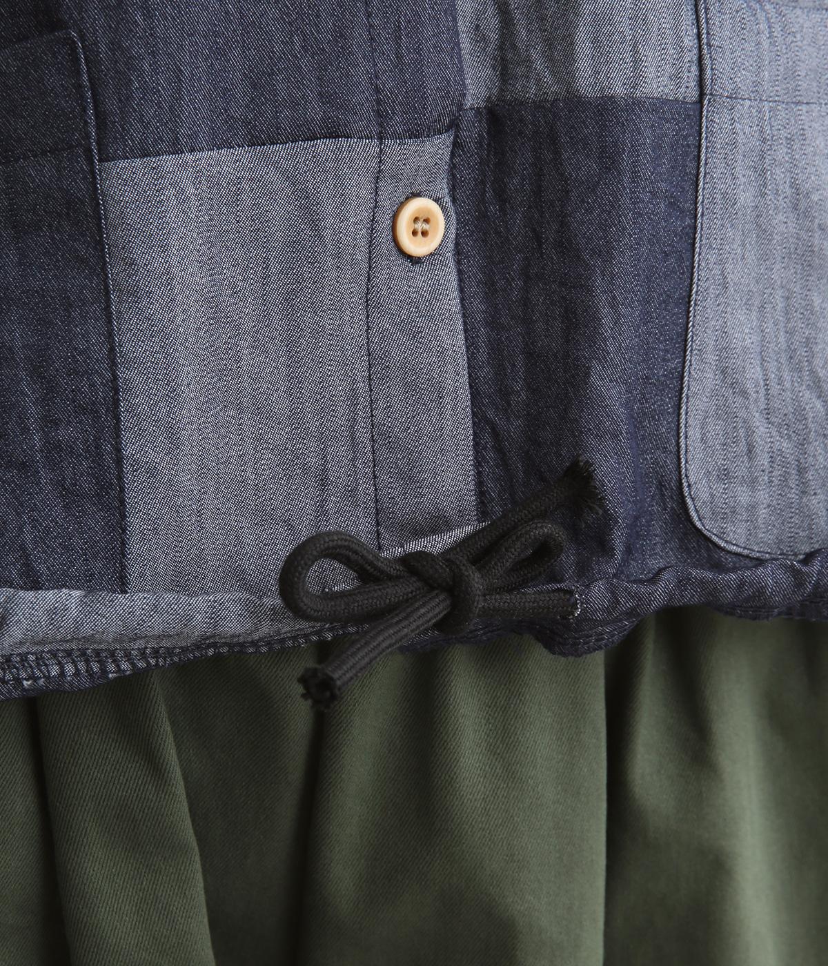 2種の生地をパッチワーク調に切り替えてデザイン性を高めました。肩を落とした気負いのないシルエットで、裾紐をしぼってアレンジしても◎。羽織り使いはもちろん、スタイリングのメインにもなります。