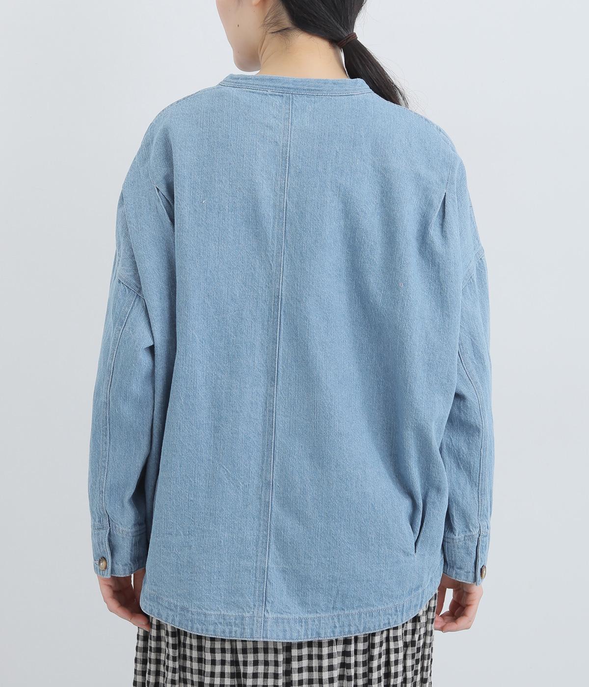 デニムジャケットのハードな印象をやわらげるラウンドヘムラインが魅力の一着。大きめボタンはあえて間隔をあけ、絶妙な抜け感をつくっています。着丈に前後差をつけているので横姿もきれいに見え、後ろ裾のタックが自然な立体感に。