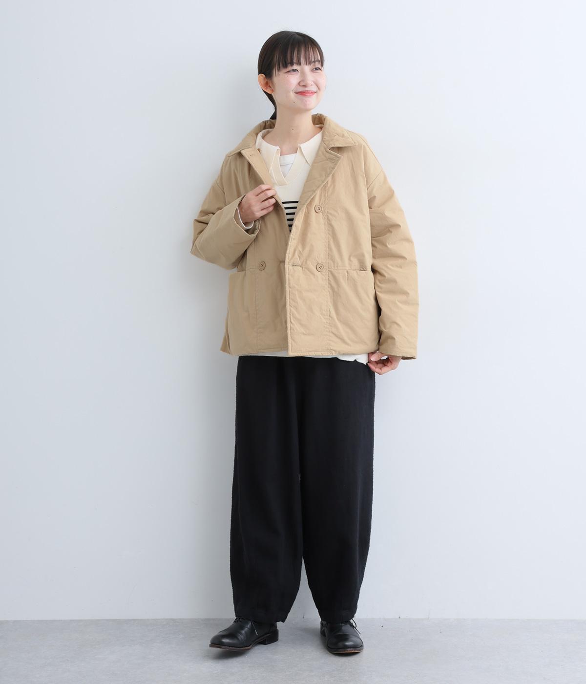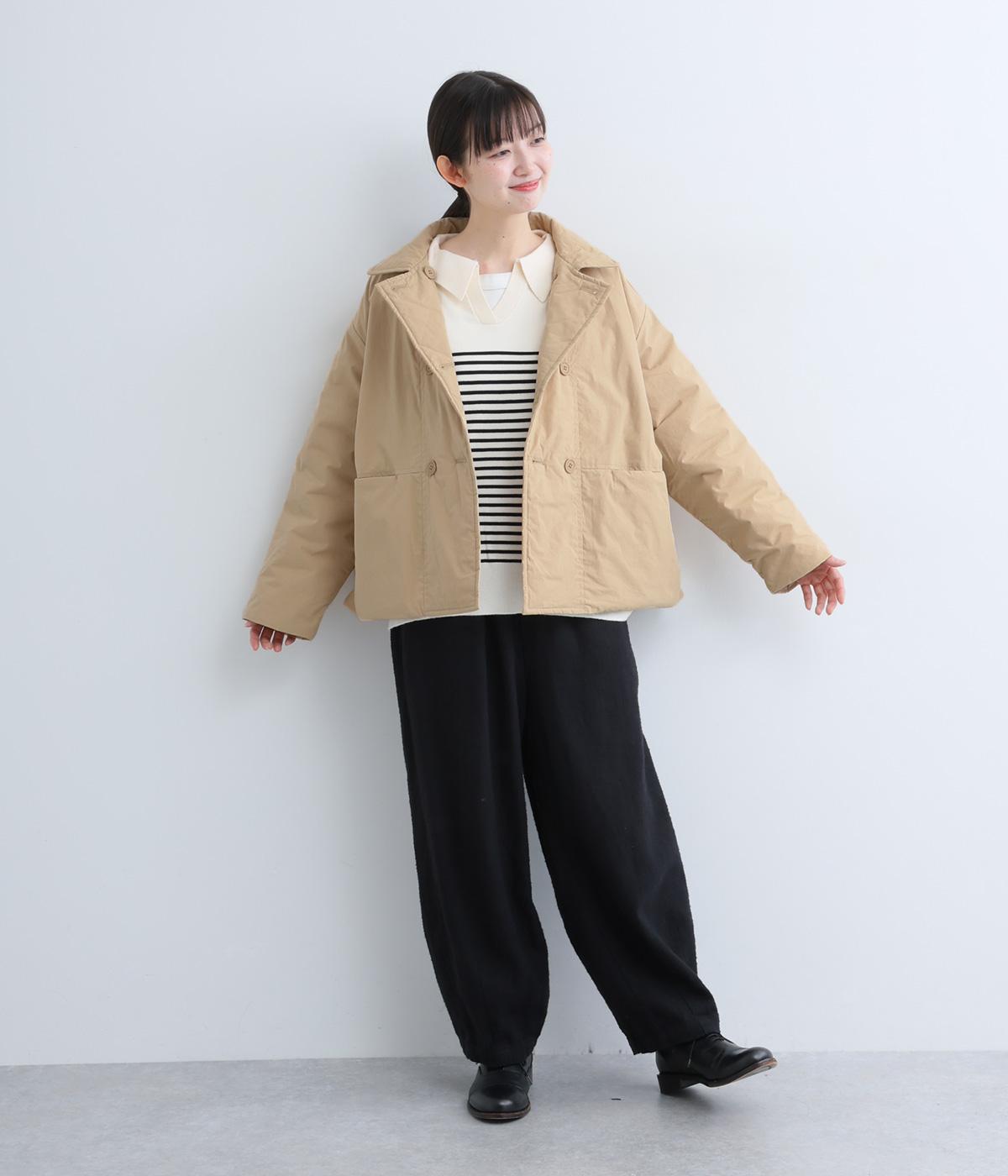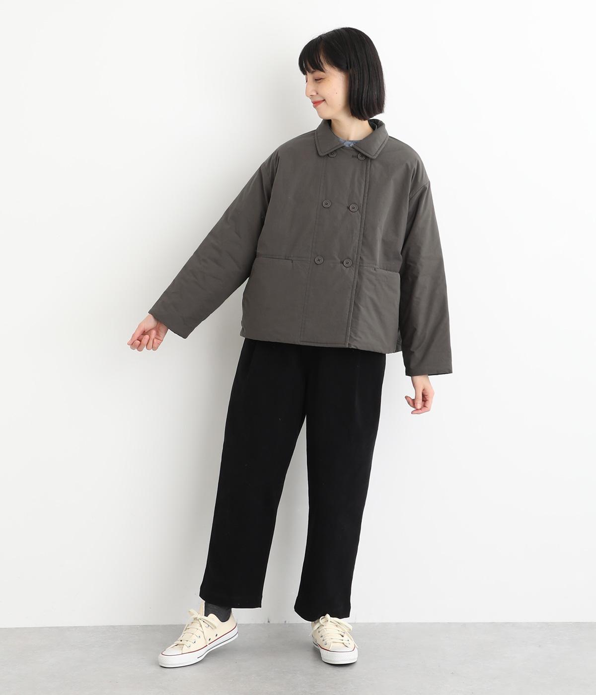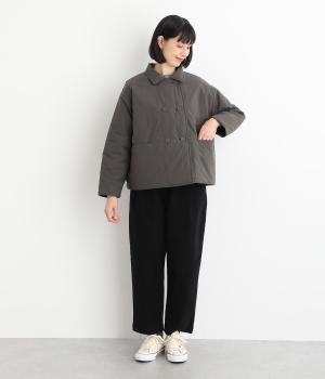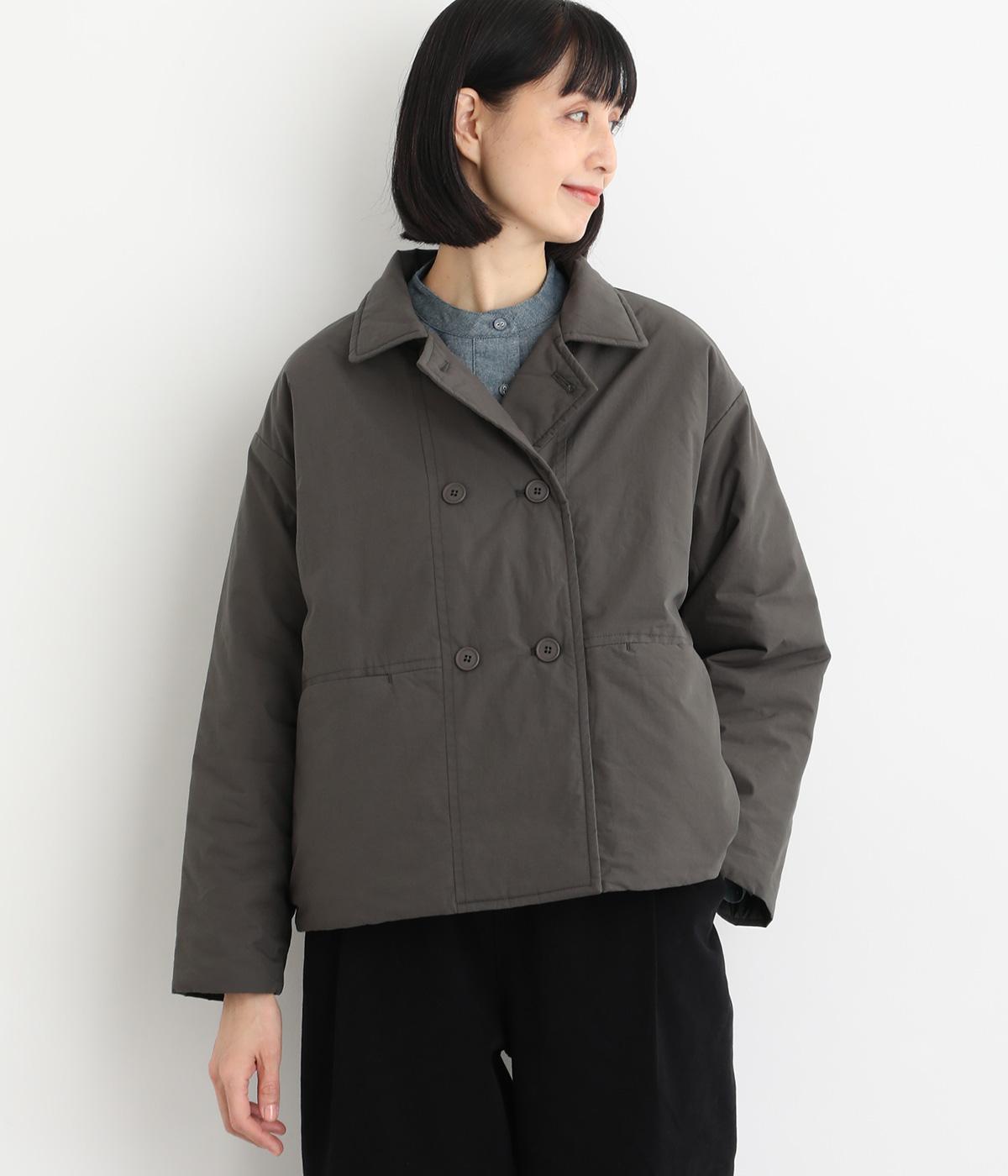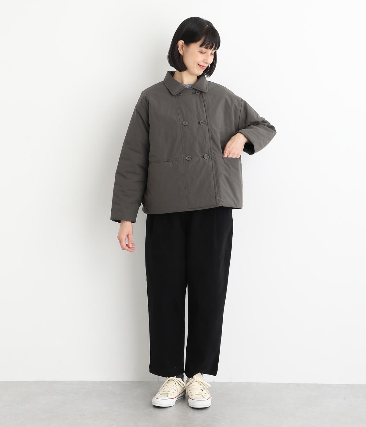 きちんと感のあるダブルボタン仕様とシンプルなデザインで、カジュアルさをおさえた中綿入りジャケットです。さまざまなボトムスにバランスよく合わせやすいコンパクトな着丈が魅力。第一ボタンを外してオープンカラーのように着こなすのもおすすめです。